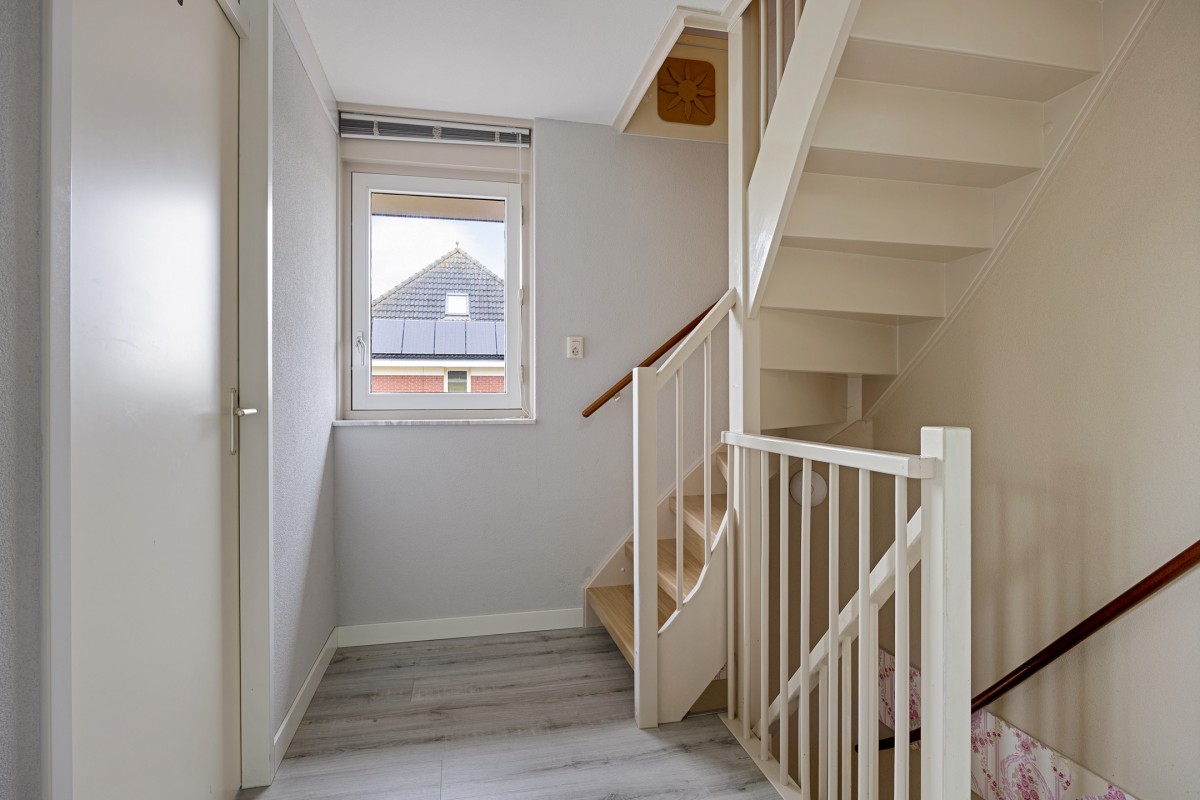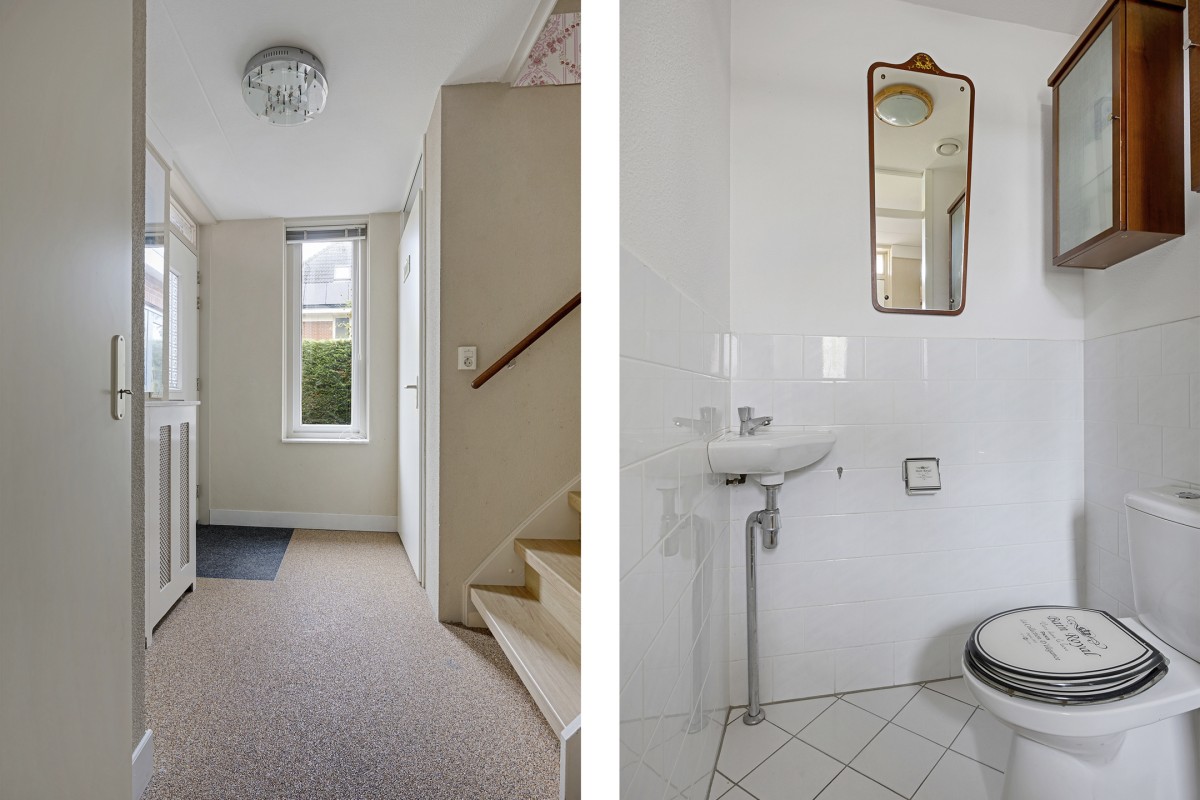 From the private driveway, you reach the entrance of the house. A spacious hall with a meter cupboard, a separate toilet, stairs leading to the first floor, and a door leading to the living room.
