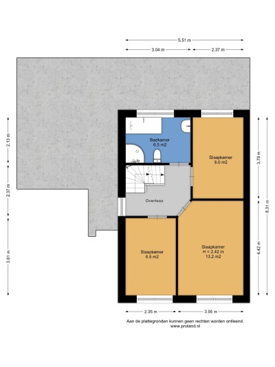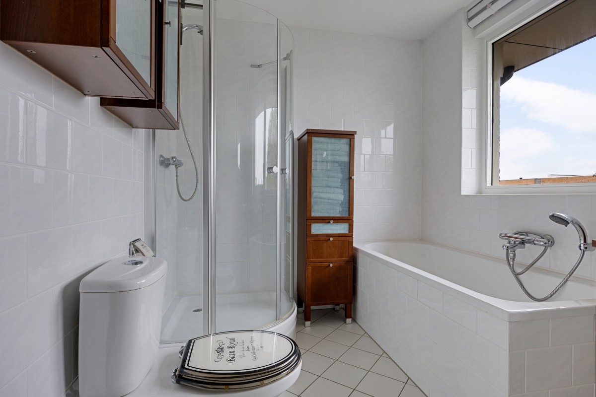 The landing provides access to three bedrooms and the bathroom. The fully tiled bathroom is equipped with a bath, shower cabin, washbasin, and a second toilet. There is a window that can be opened for extra ventilation.