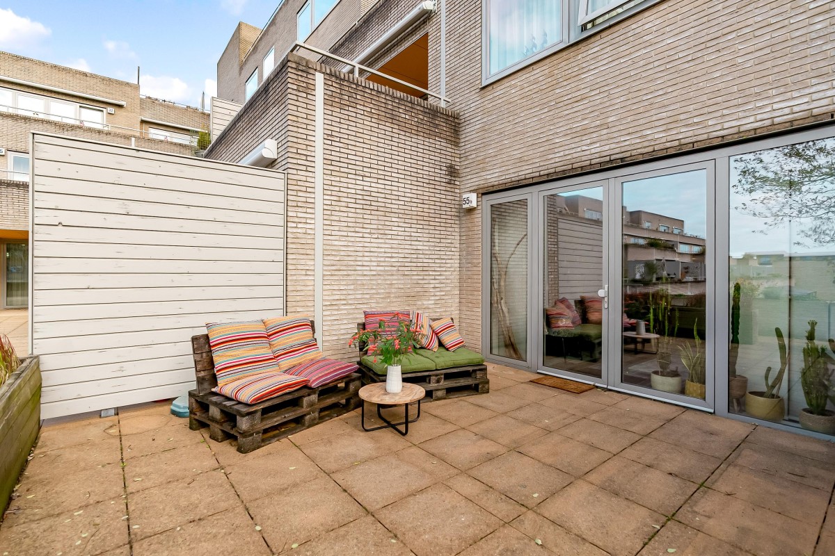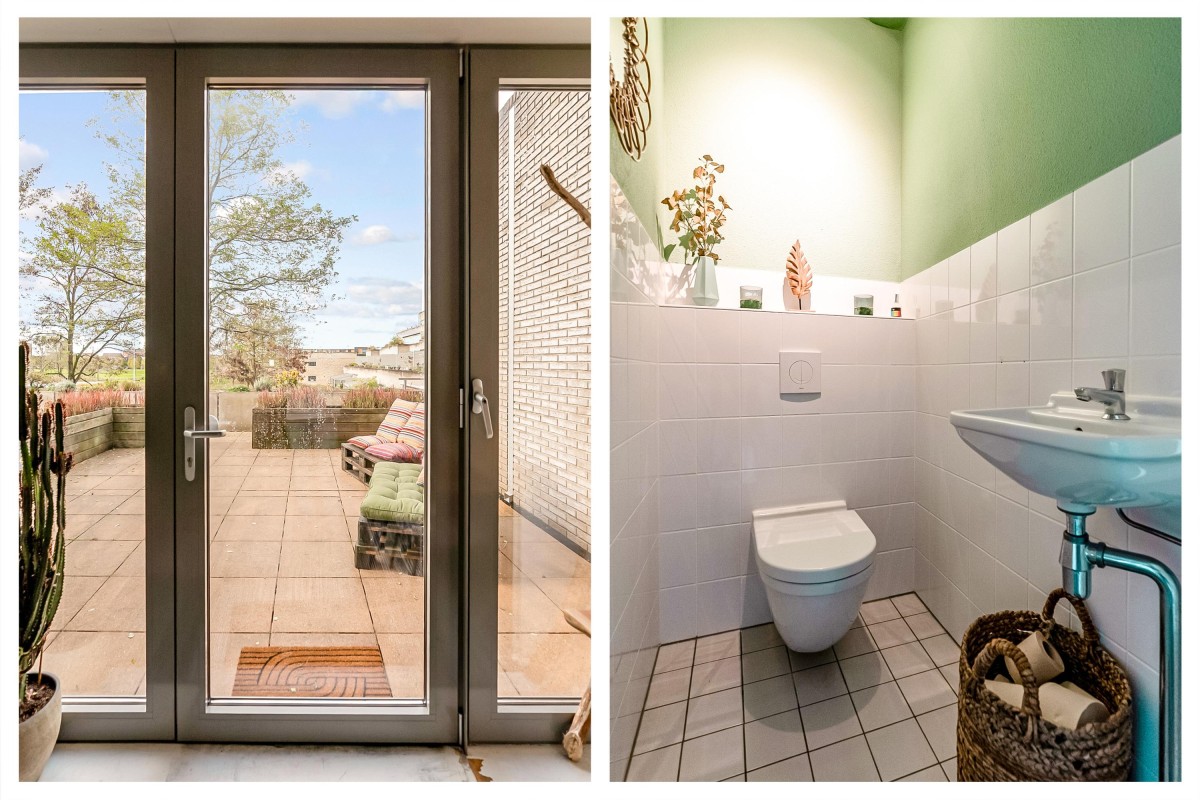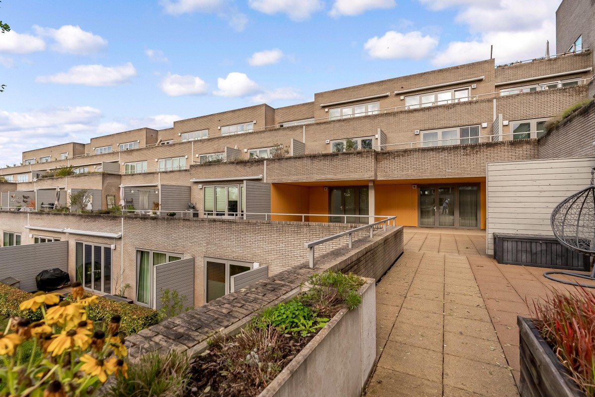 Je eigen, royale terras van 31 m2 ligt voor je voordeur met uitzicht op de binnentuin en zwembad.