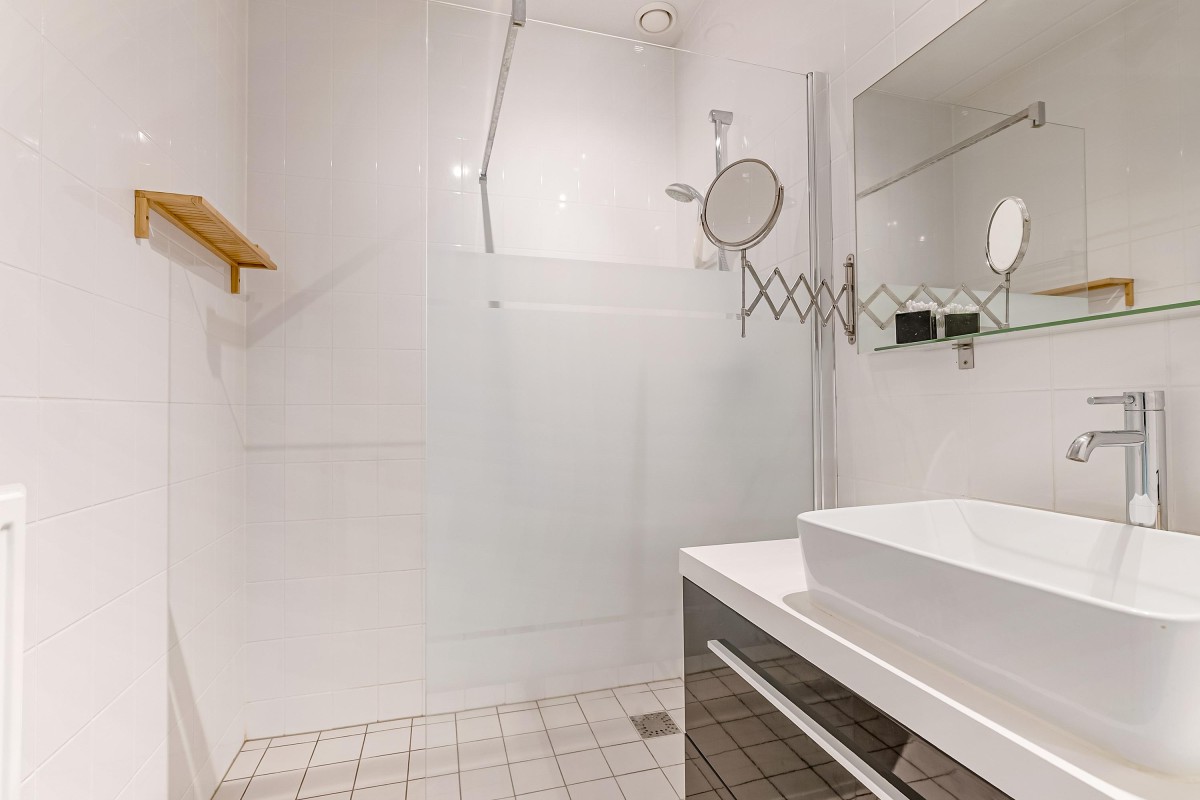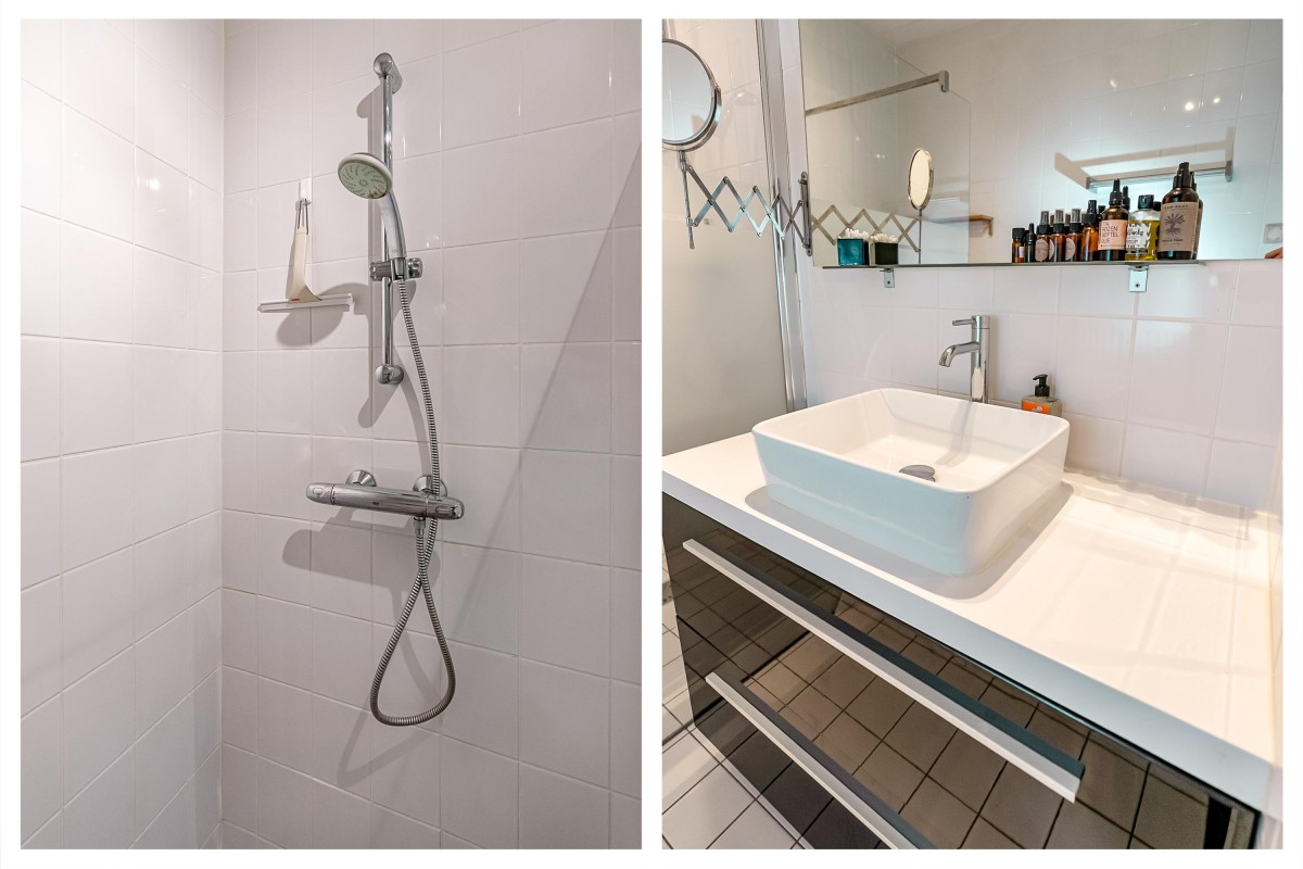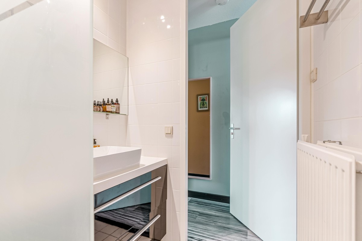 In het midden van het appartement ligt de badkamer welke is voorzien van inloopdouche met glazen wand en een wastafel meubel. Naast de badkamer is apart van de badkamer en uitgevoerd met een vrijhangend toilet. Apart is er nog een wasmachineruimte in de kast.