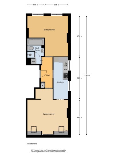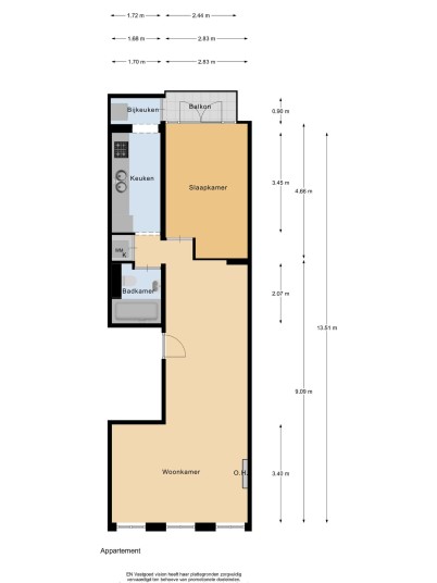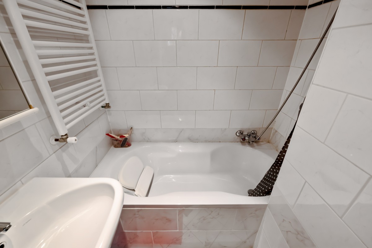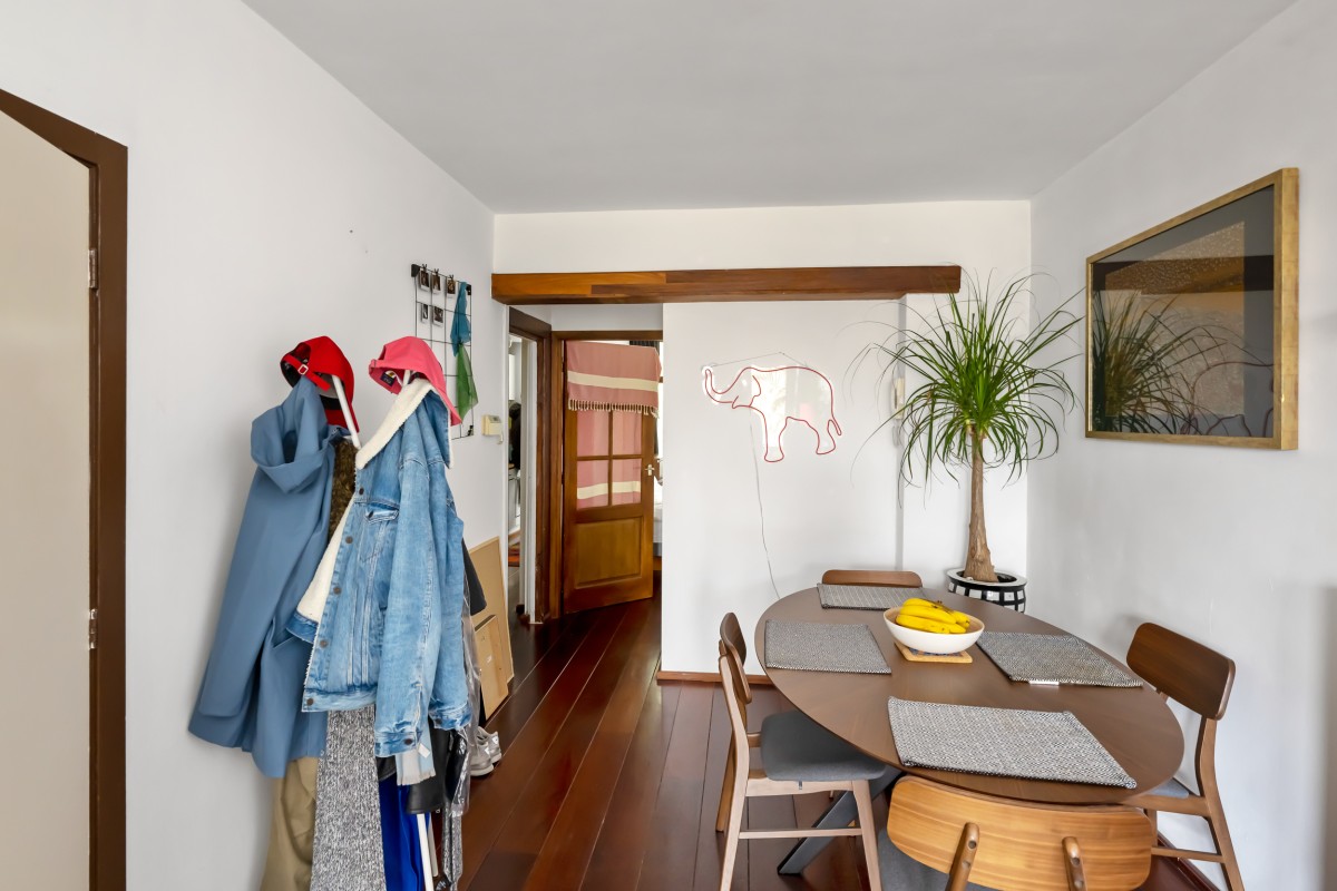 At the rear of the apartment is the kitchen, equipped with various built-in appliances. The kitchen opens onto a lovely balcony, perfect for enjoying your morning coffee and breakfast. Also located at the rear is the generous bedroom.