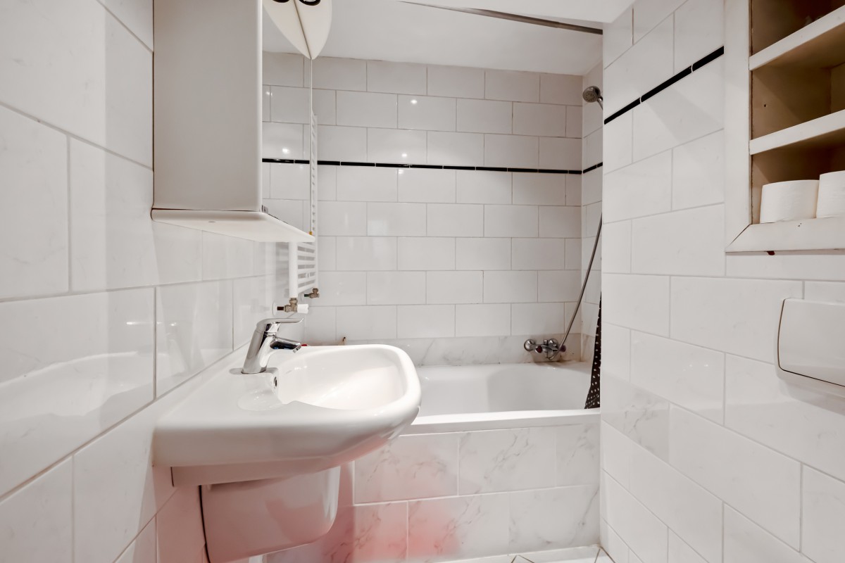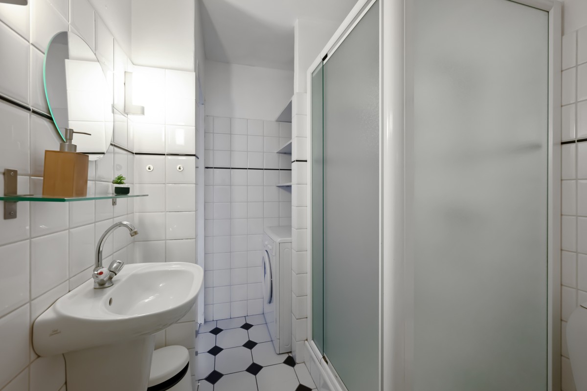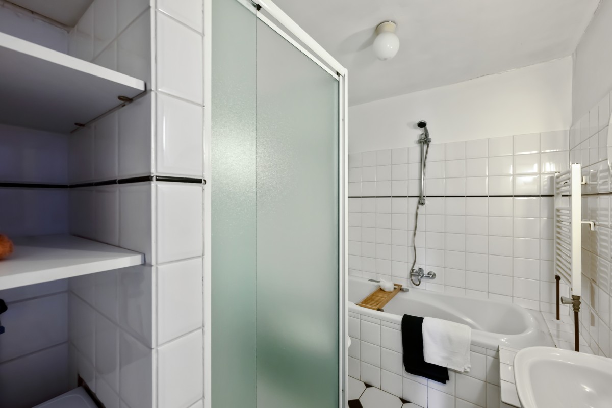The bathroom on this level includes a bathtub, shower, toilet, washbasin, and a washing machine connection.