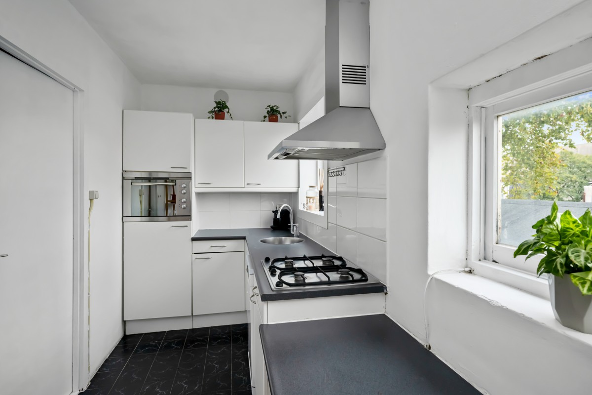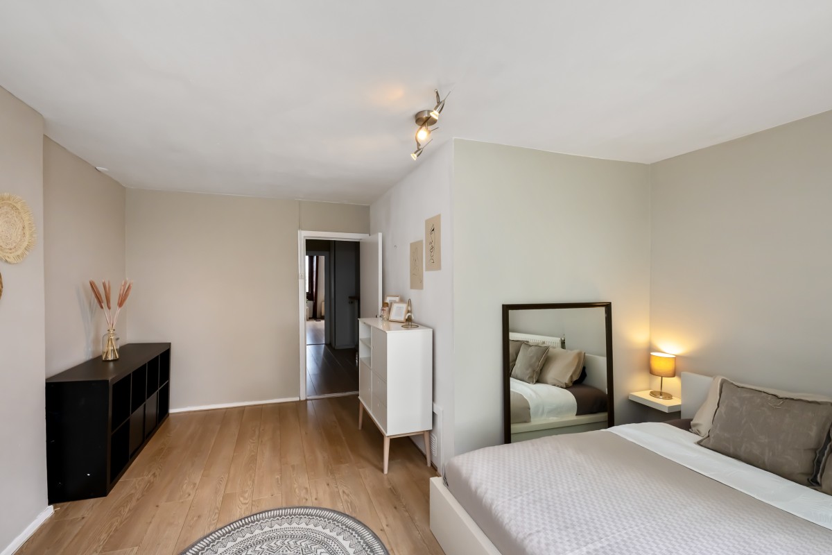 At the rear is a large bedroom with two big windows that overlook a lovely green space.