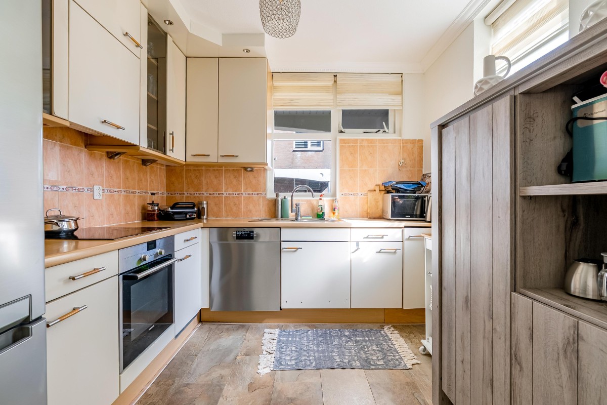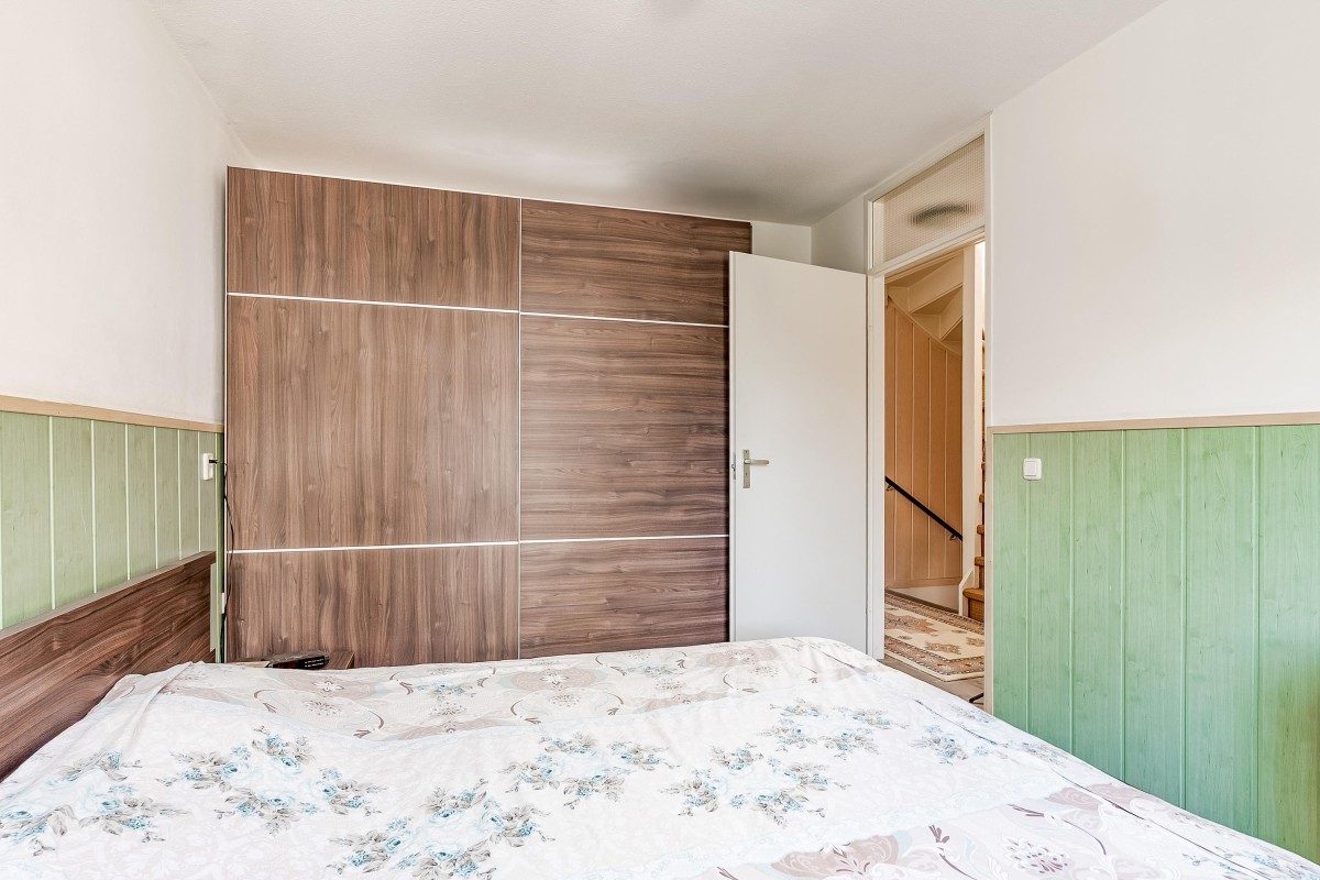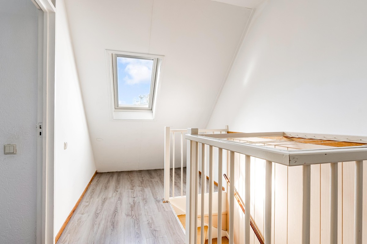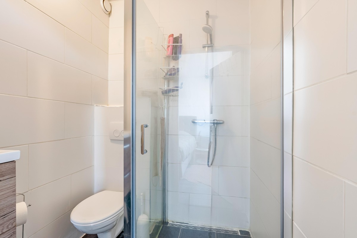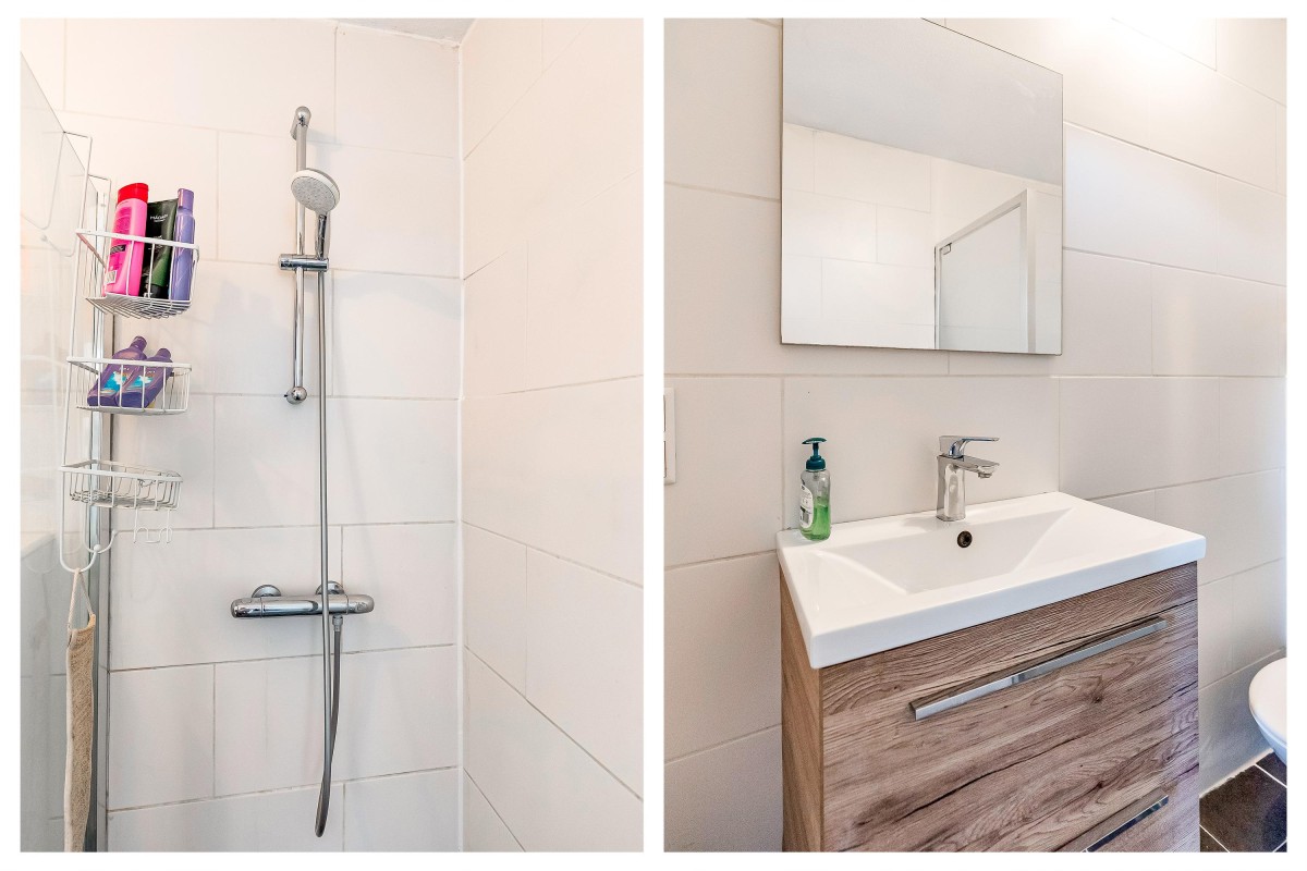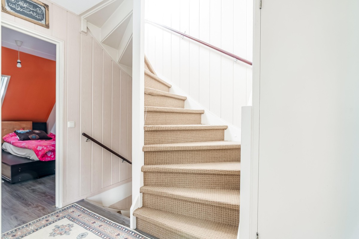 Through the front garden, you reach the entrance of the house. The hallway provides access to the meter cupboard, the toilet, the staircase, and the spacious living room. This living room is located at the rear and, thanks to the large windows, offers a view of the garden. The open kitchen at the front has a practical corner layout with plenty of workspace and storage. It is equipped with an induction cooktop, combination microwave/oven, dishwasher, and refrigerator, but also offers the possibility to update it to your own taste. The living room also has a convenient storage cupboard under the stairs and access to the back garden through a door.