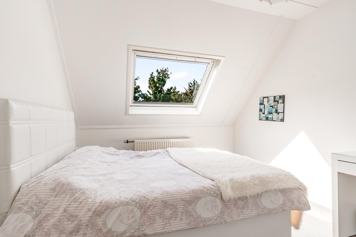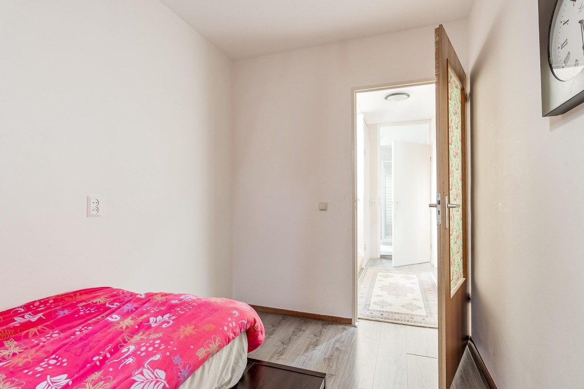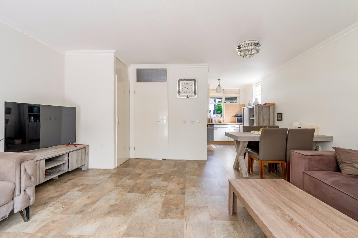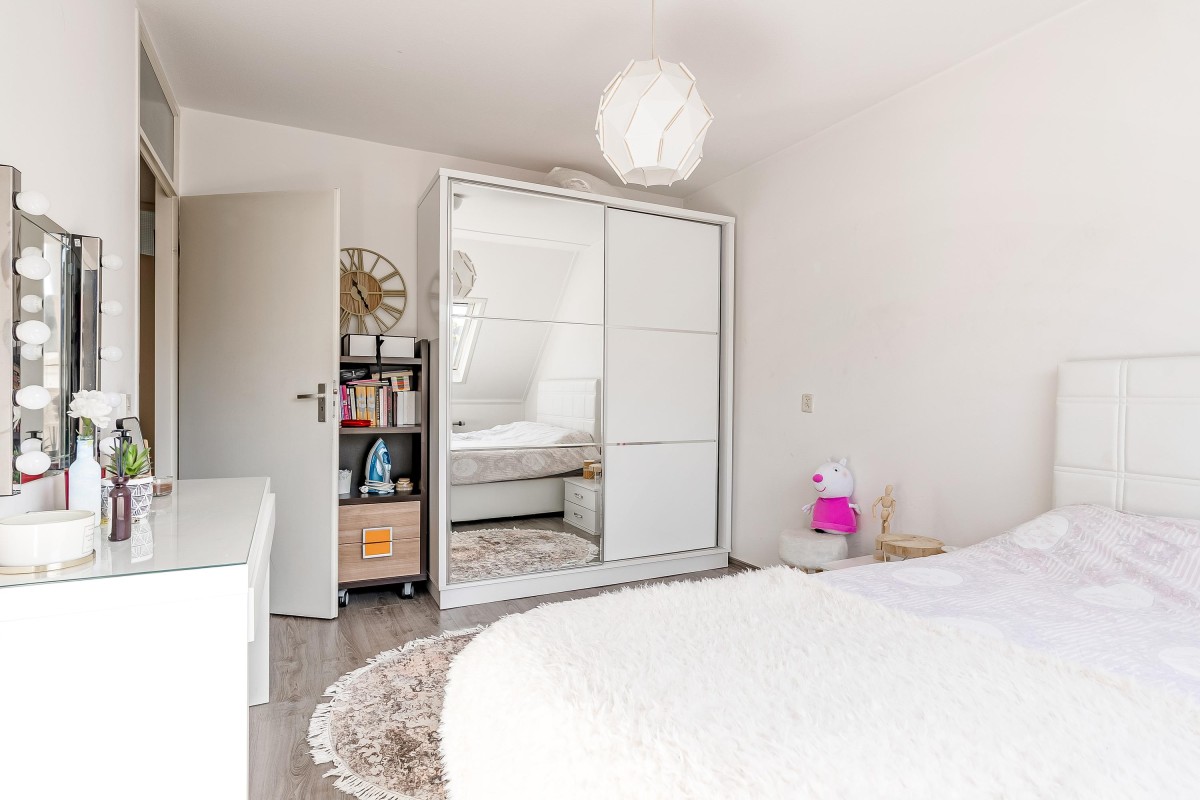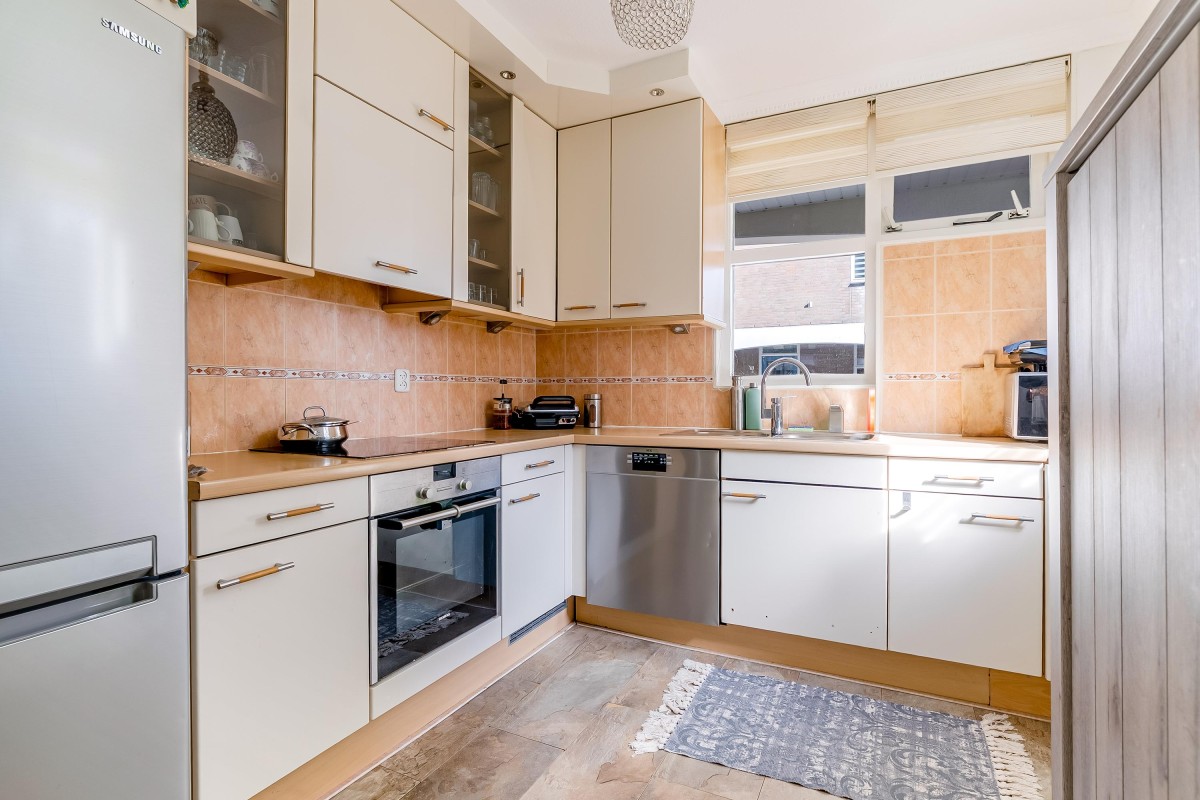 Through the front garden, you reach the entrance of the house. The hallway provides access to the meter cupboard, the toilet, the staircase, and the spacious living room. This living room is located at the rear and, thanks to the large windows, offers a view of the garden. The open kitchen at the front has a practical corner layout with plenty of workspace and storage. It is equipped with an induction cooktop, combination microwave/oven, dishwasher, and refrigerator, but also offers the possibility to update it to your own taste. The living room also has a convenient storage cupboard under the stairs and access to the back garden through a door.
