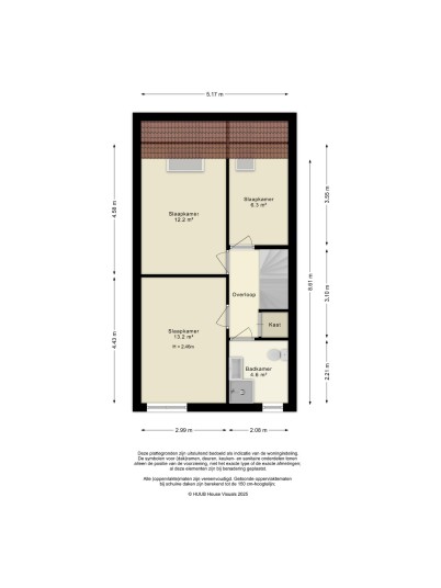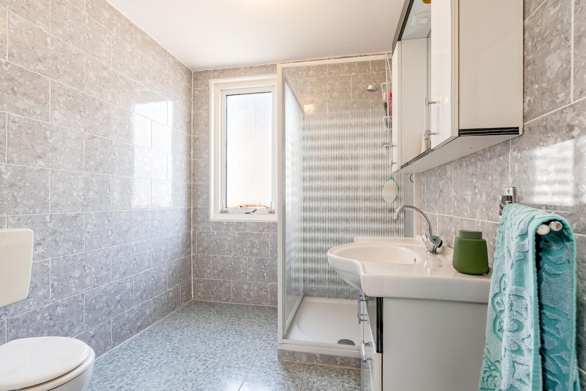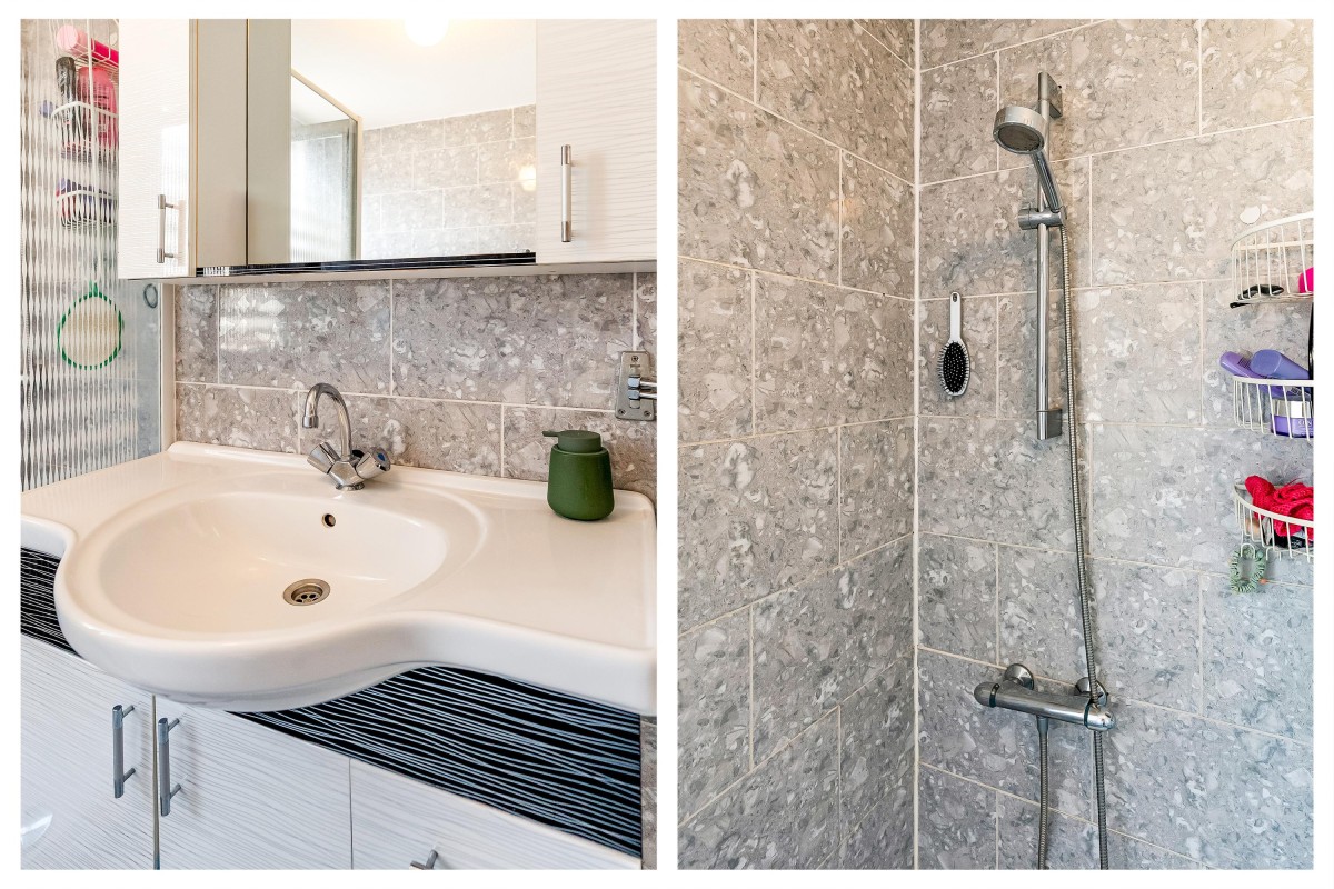 The second floor is accessible via a fixed staircase. On the landing, there is a washing machine connection. You’ll also find a spacious storage area and an extra bedroom with its own bathroom. This second bathroom features a walk-in shower, wall-mounted toilet, and washbasin with cabinet.