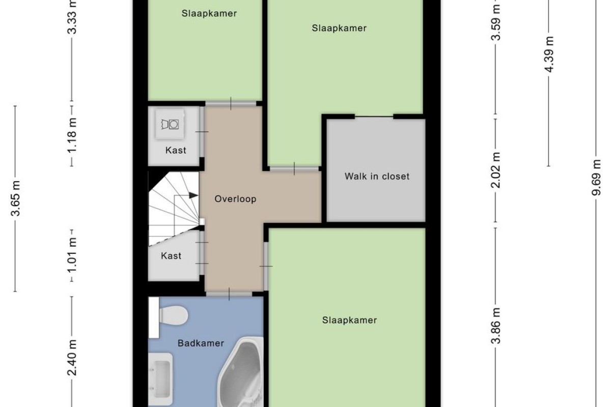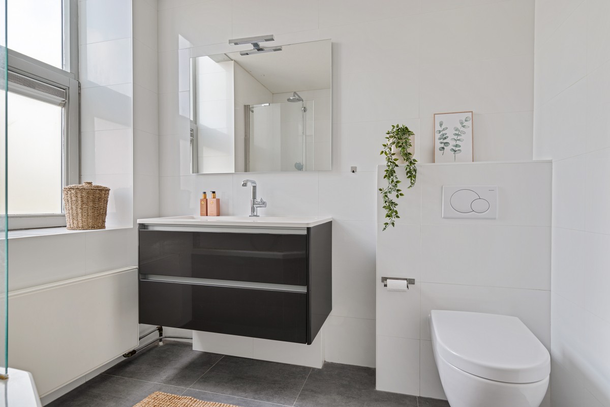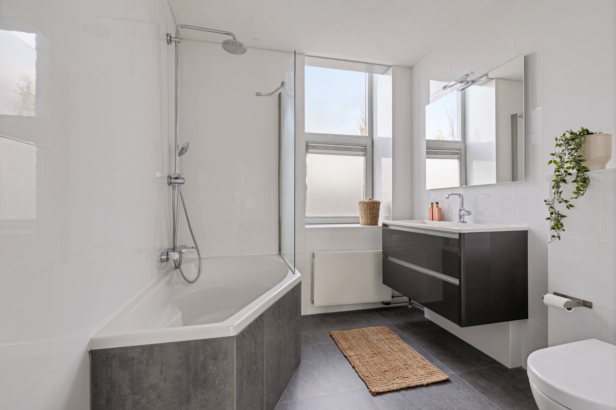 The first floor offers three bedrooms and a luxurious, modern bathroom with a bathtub, shower, vanity unit, and floating toilet. Everything is neatly and stylishly finished, so you can immediately enjoy the comfort.