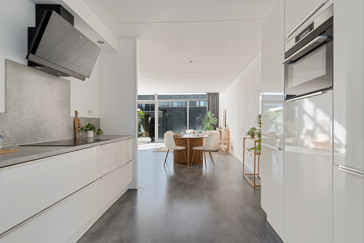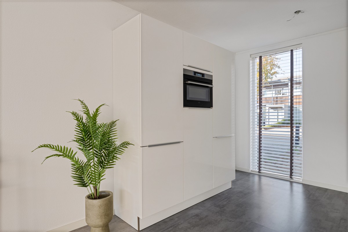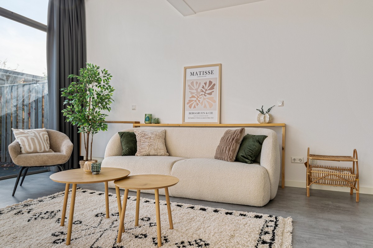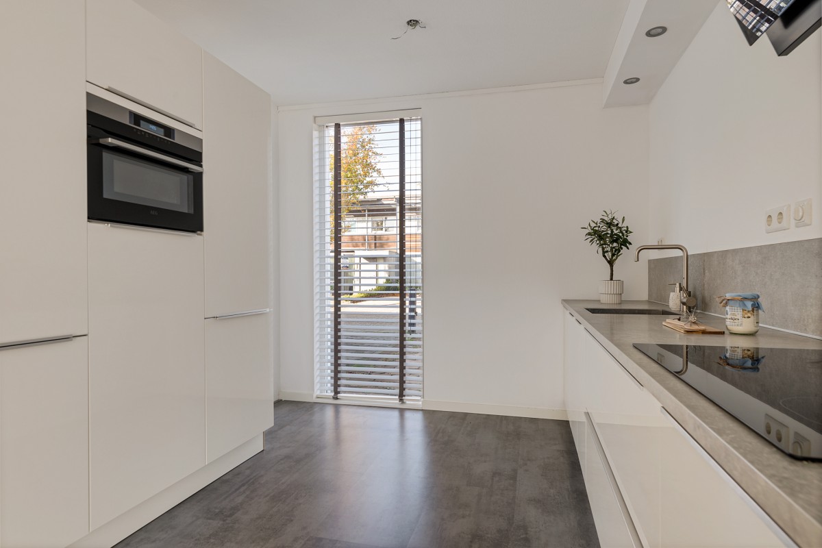 Upon entering, the light and spacious living room immediately stands out. Thanks to the large sliding doors and tall windows, daylight pours in, creating a wonderful sense of space. The modern open kitchen is equipped with all conveniences: an induction cooktop, designer range hood, dishwasher, combi-oven, and fridge/freezer. The entire ground floor is finished with a sleek, modern laminate floor.
