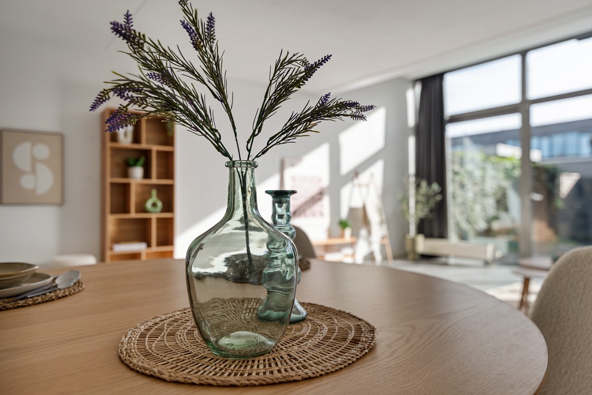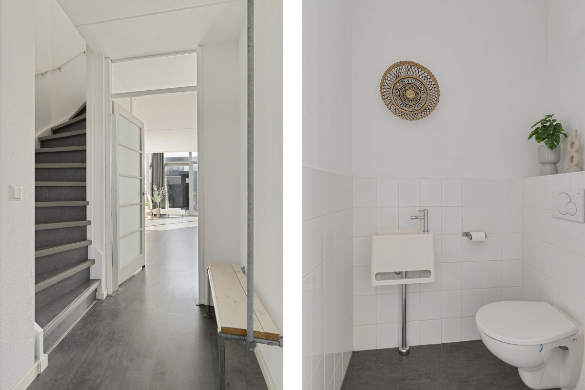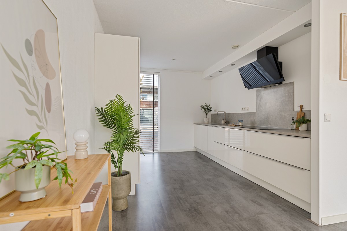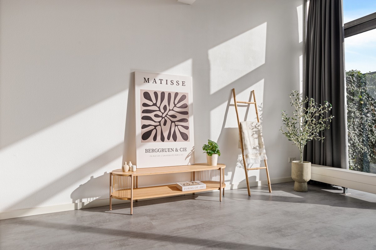 Upon entering, the light and spacious living room immediately stands out. Thanks to the large sliding doors and tall windows, daylight pours in, creating a wonderful sense of space. The modern open kitchen is equipped with all conveniences: an induction cooktop, designer range hood, dishwasher, combi-oven, and fridge/freezer. The entire ground floor is finished with a sleek, modern laminate floor.