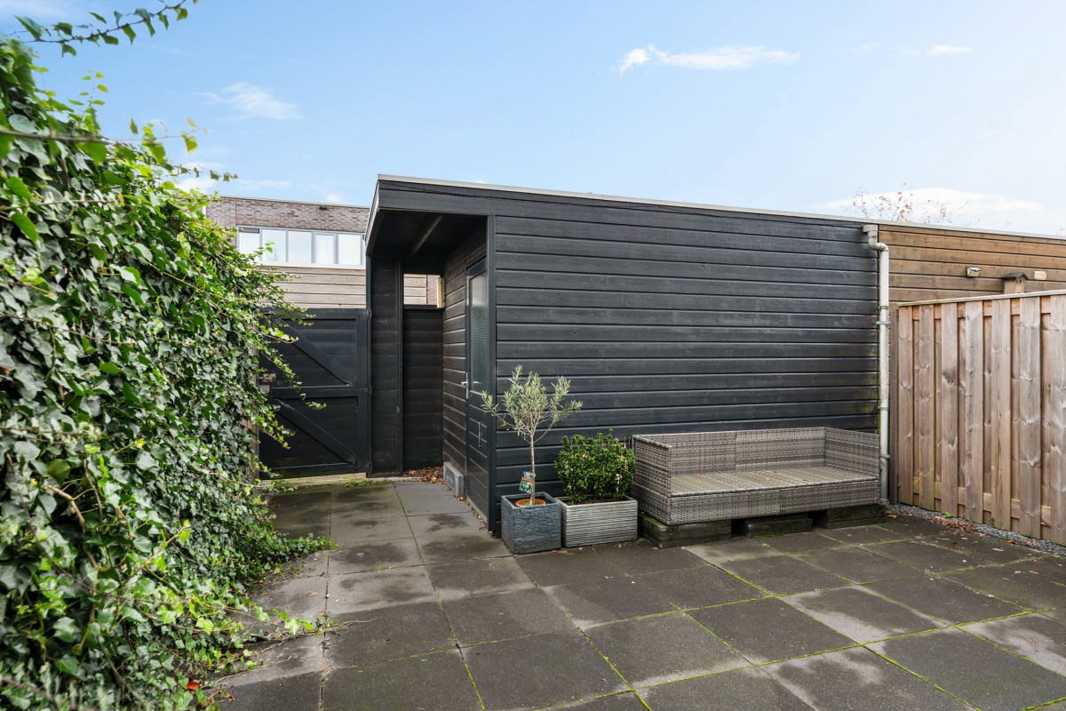 Sunny backyard: Low-maintenance, with a large wooden shed and private side entrance.