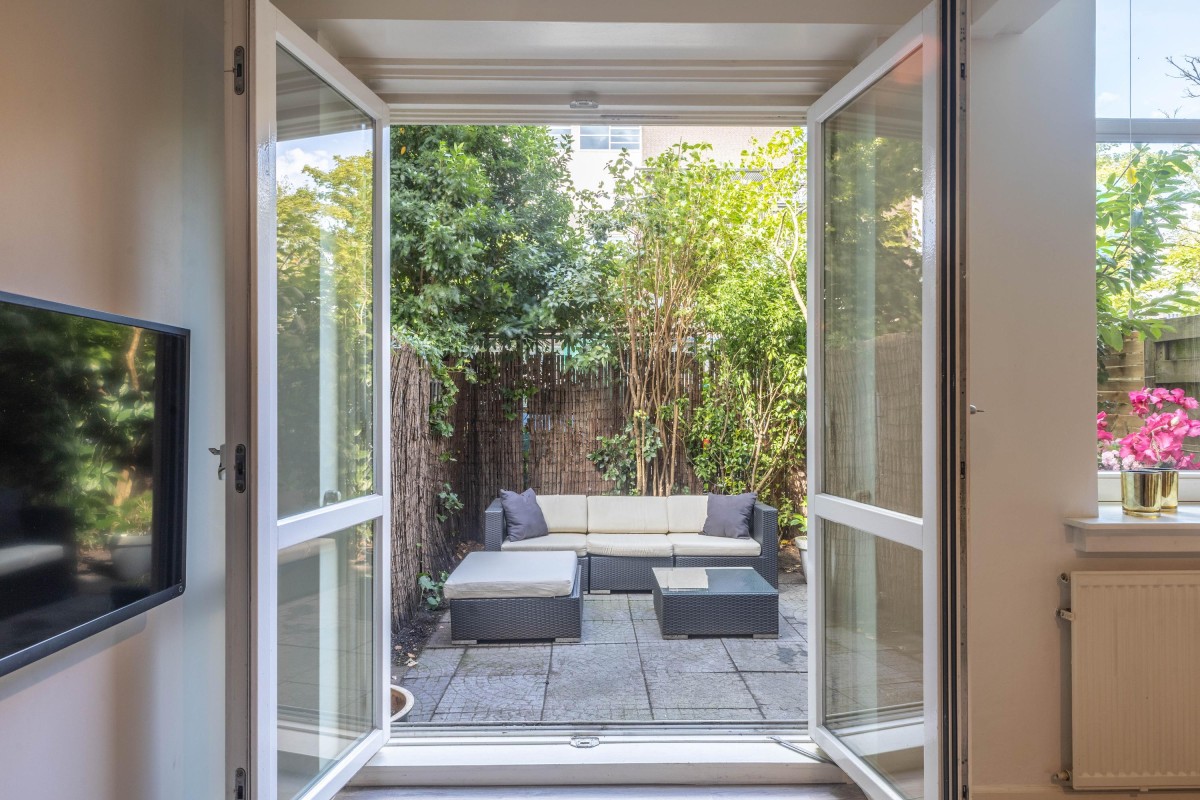 • Living room with garden view, featuring French doors leading to the secluded garden.