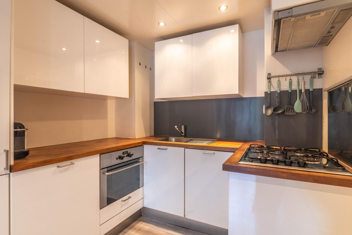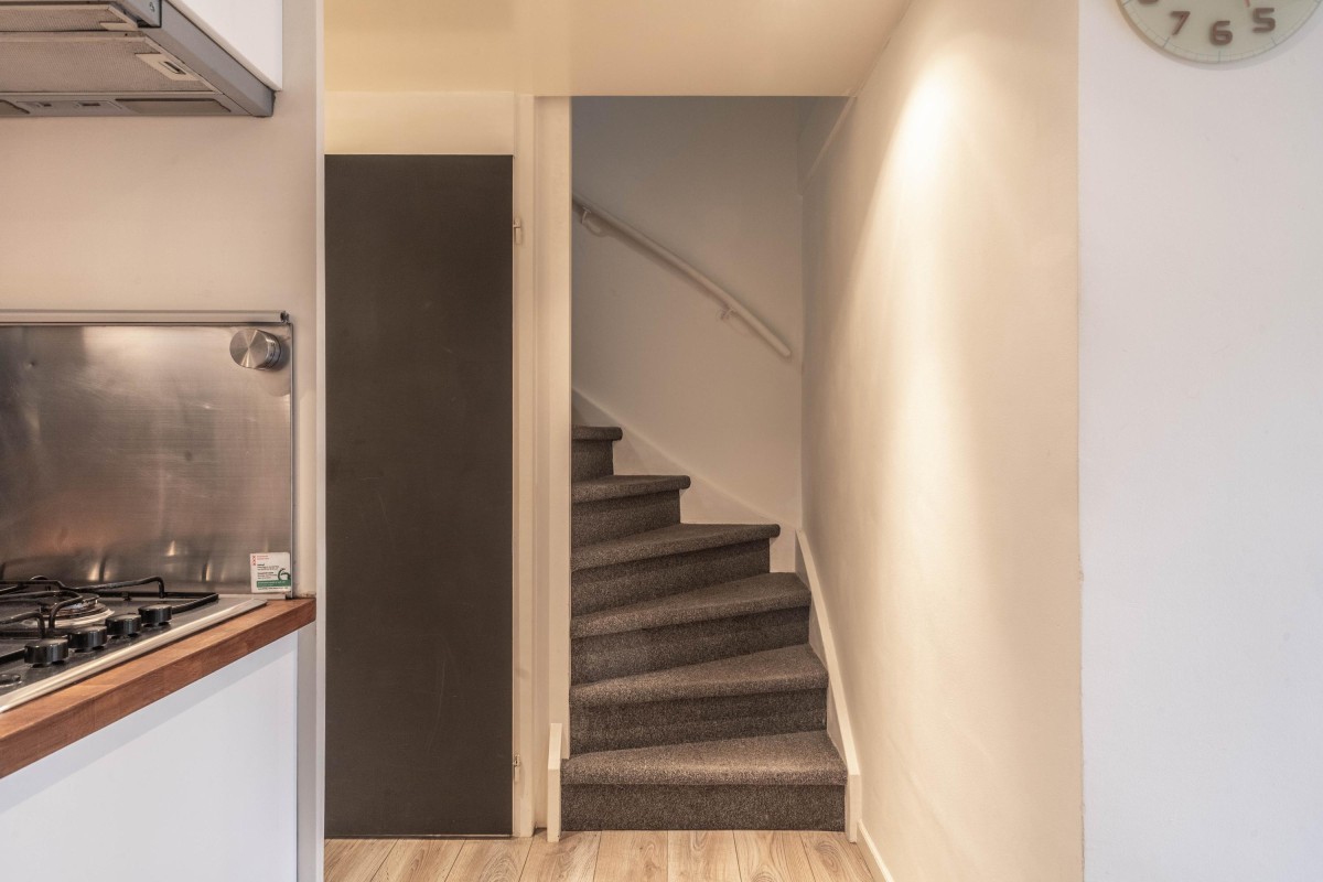 The layout is practical and atmospheric. The living room with open kitchen has large windows and French doors leading to the secluded garden facing west. Upstairs, you’ll find two spacious bedrooms and a modern bathroom.