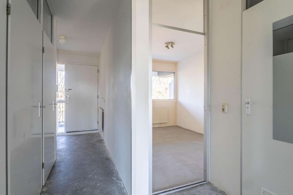 From the communal entrance, take the elevator to the third floor. Via the gallery, you reach the front door of the apartment. Upon entering, you come into the hallway, which provides access to various rooms. There is ample closet space, including a cupboard with the central heating system (Intergas, built in 2024).