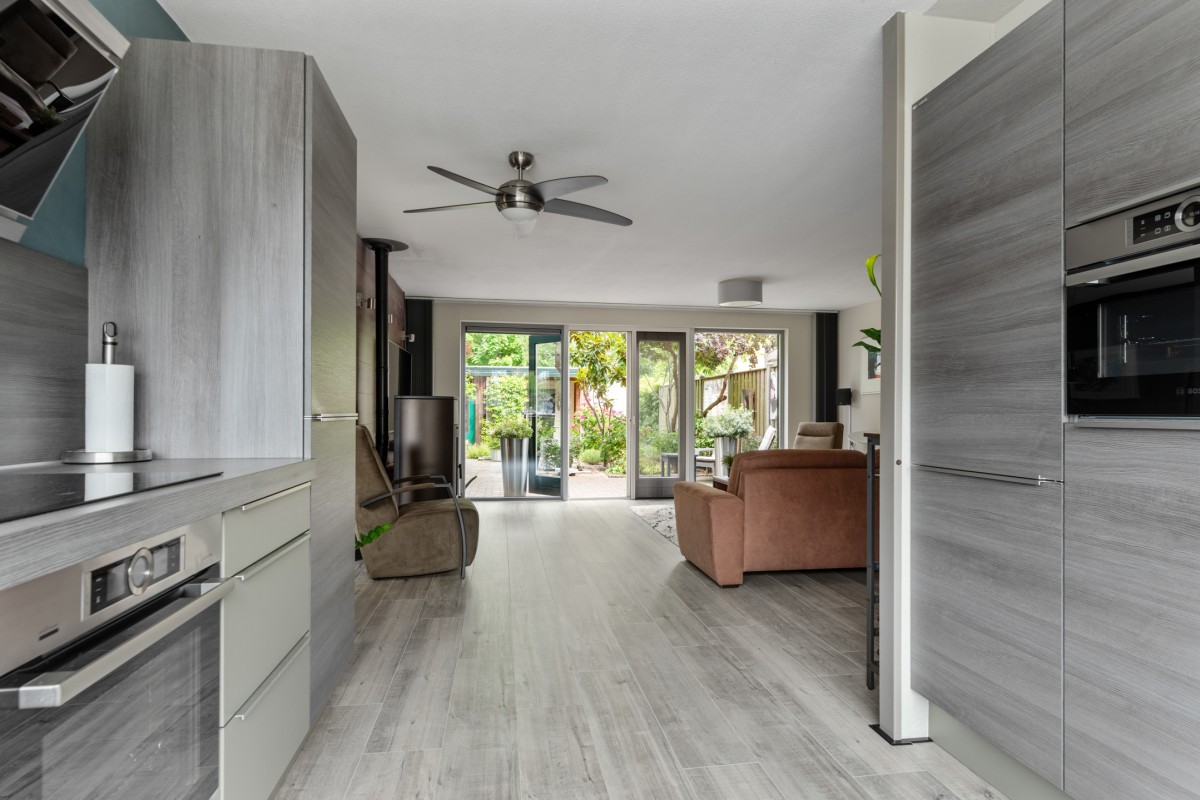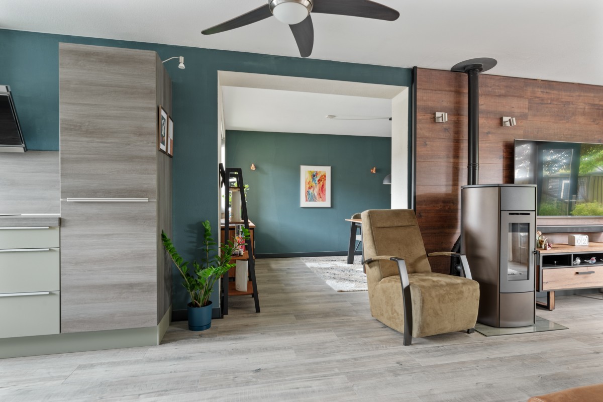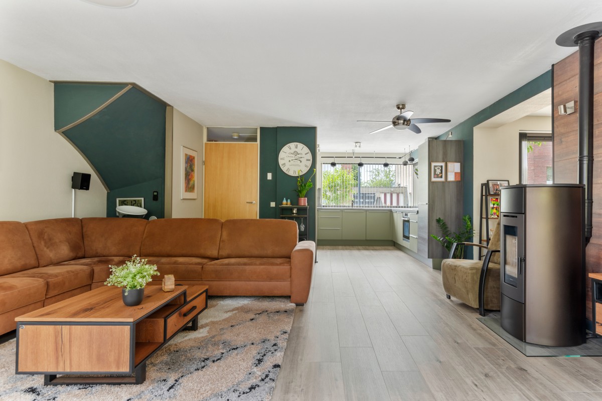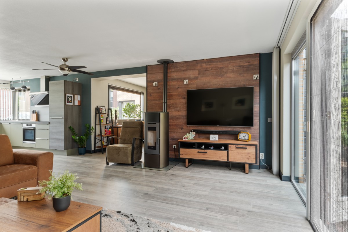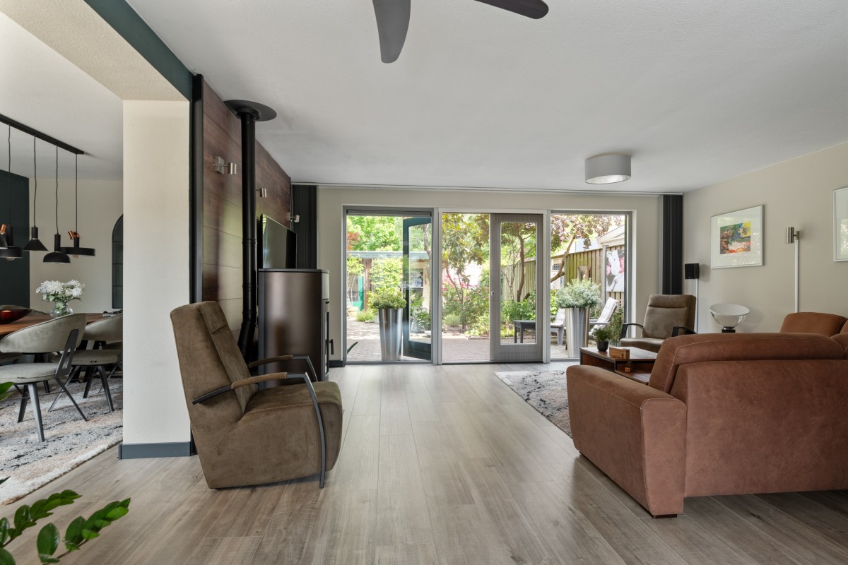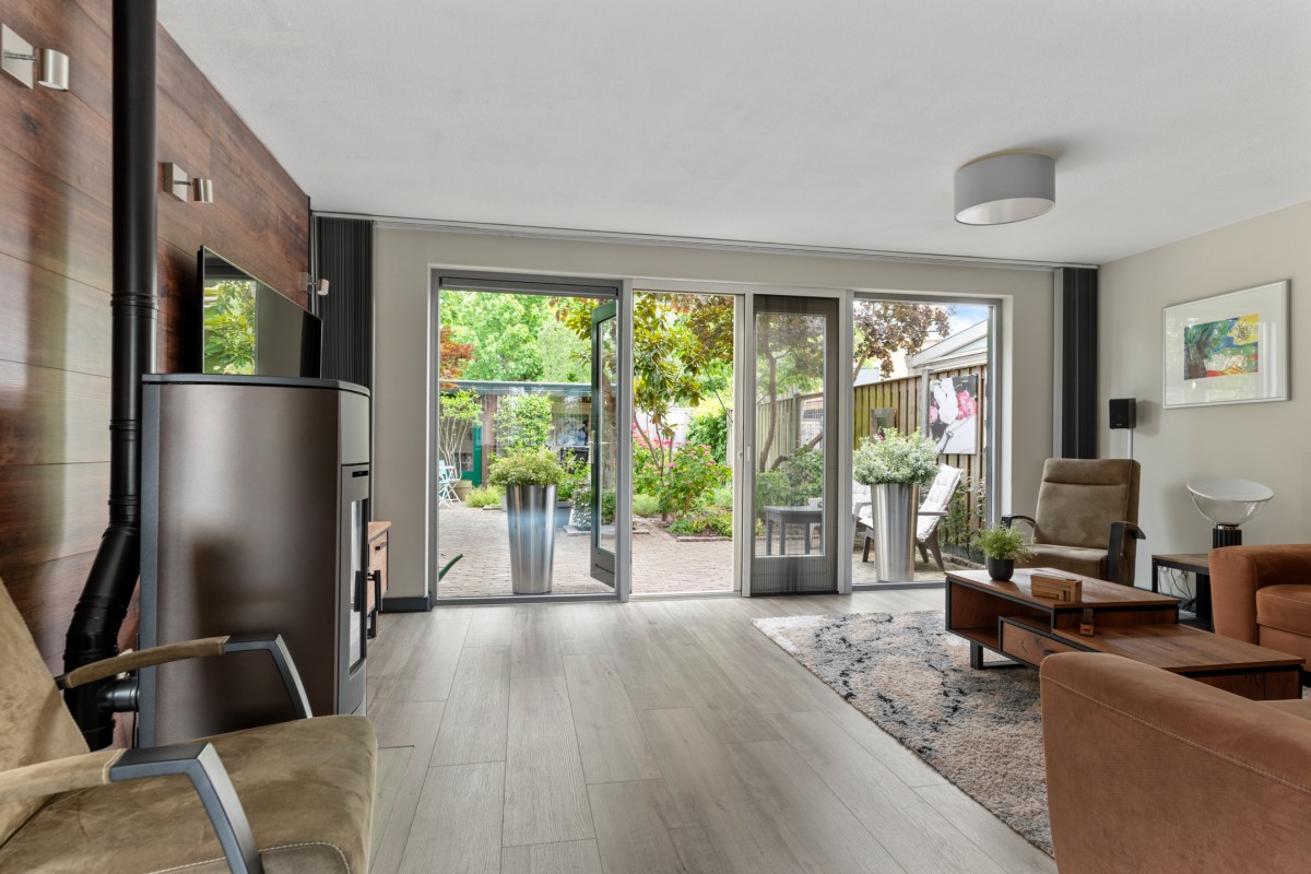 This property has a spacious living room with plenty of natural light, creating a pleasant and open atmosphere. The cozy pellet stove not only provides warmth but also adds to the ambiance. Perfect for a long evening with a good book or a glass of wine. Through the double French doors, you can access the well-kept garden at the rear.