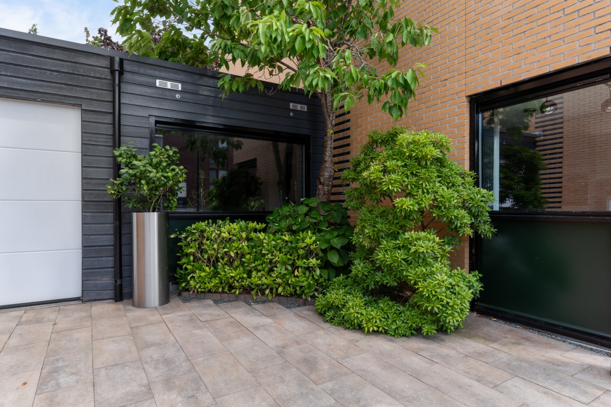 Through the beautifully landscaped front garden with private parking, you reach the entrance of the house.