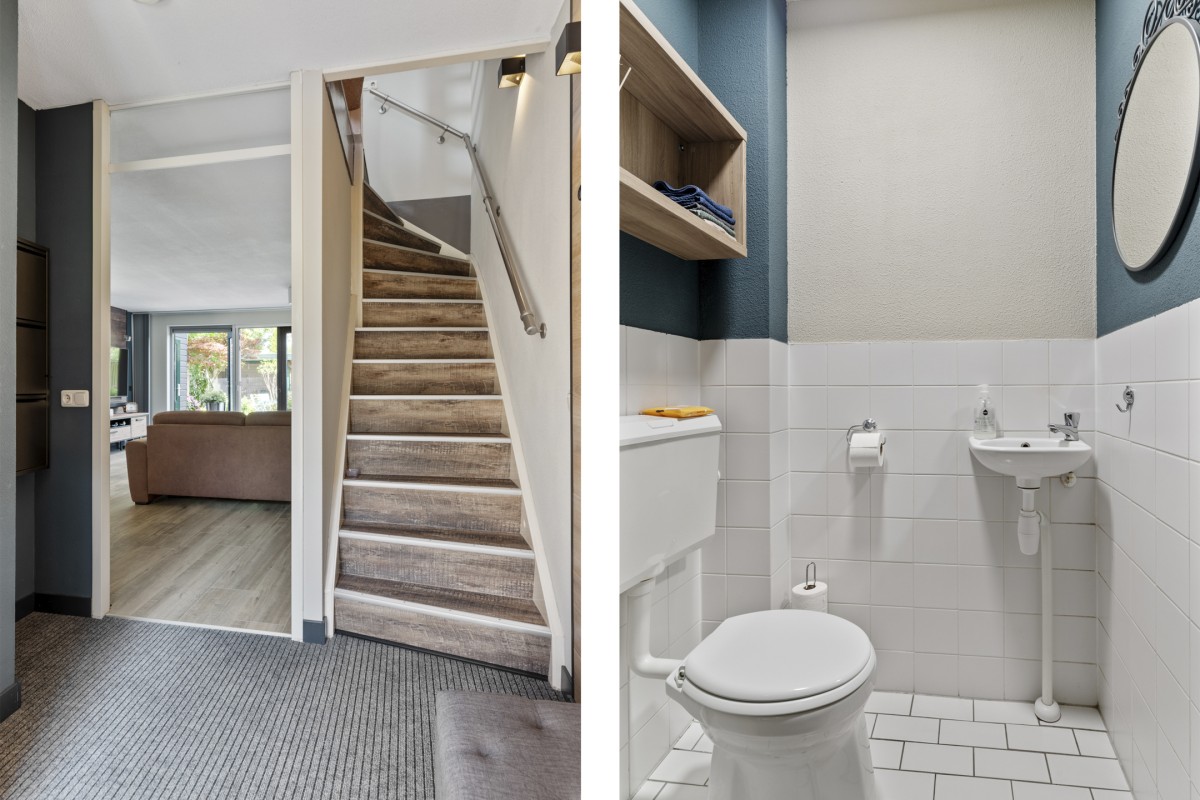 Entrance hall with access to the meter cupboard with fiber optic connection, toilet with sink, staircase to the first floor, and door to the living room.