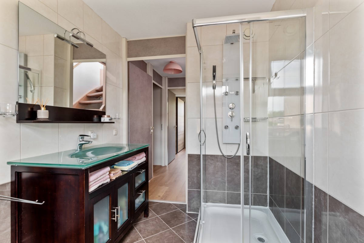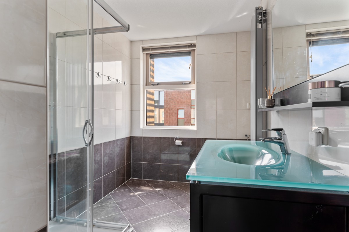 The bathroom is equipped with a walk-in shower, vanity unit, and toilet.