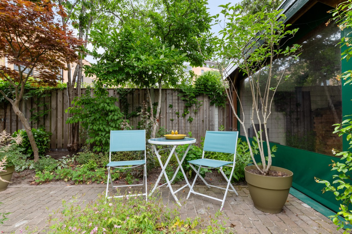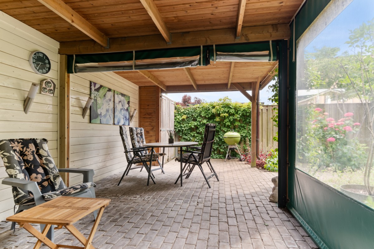 The backyard is located to the east and offers plenty of privacy thanks to neat fences all around. The garden is mostly paved and features various trees and plants, creating a green and inviting atmosphere. Additionally, there is a water connection and a spacious wooden pergola where you can enjoy sheltered seating and the outdoors or fire up the BBQ.