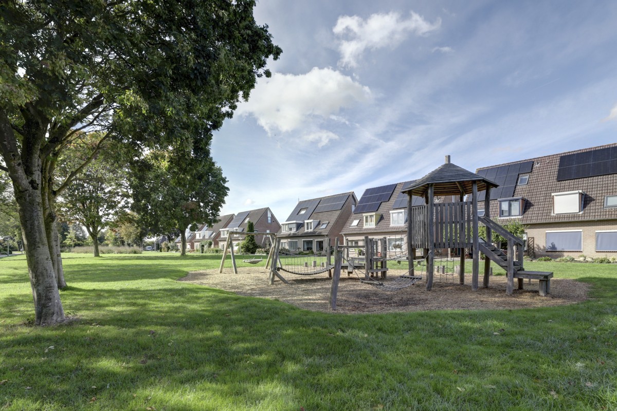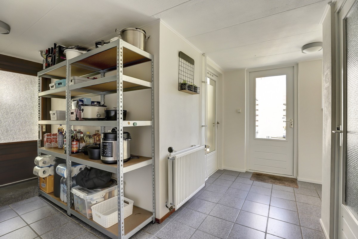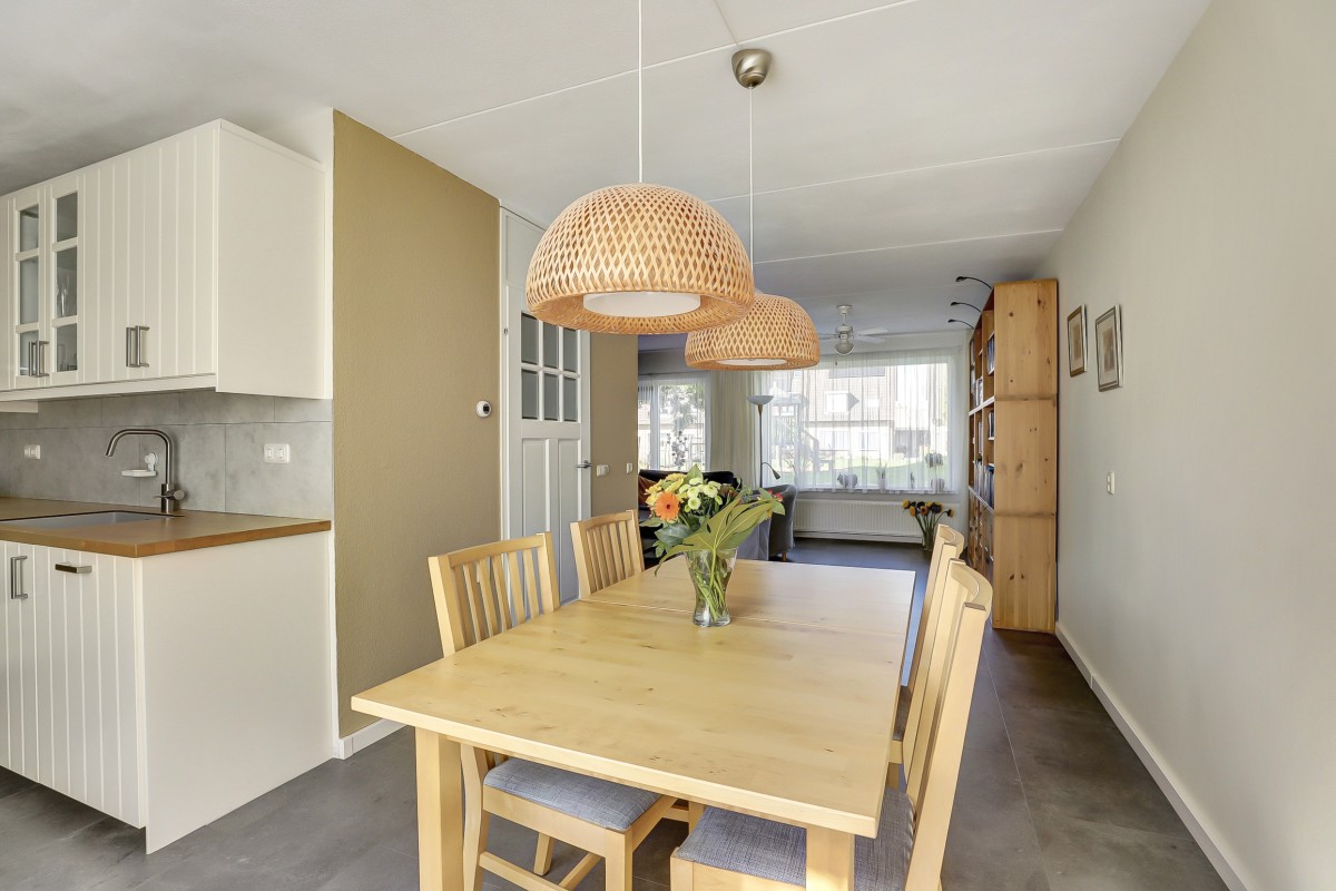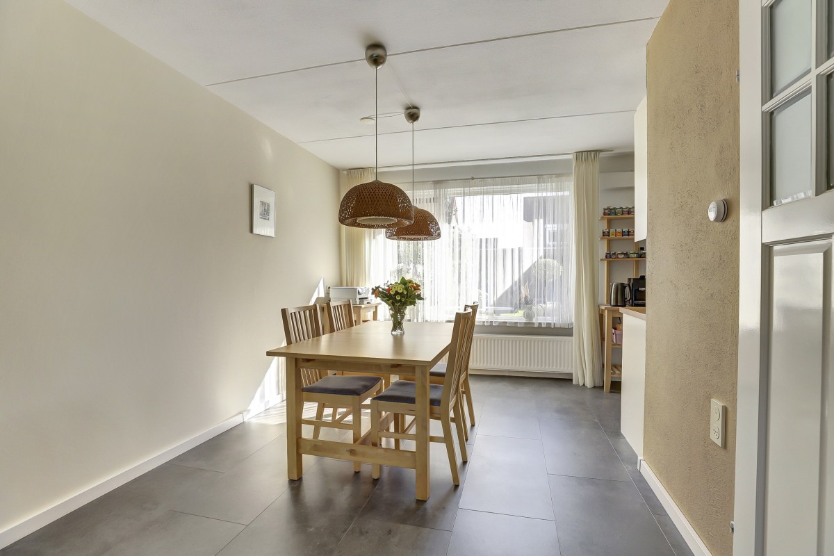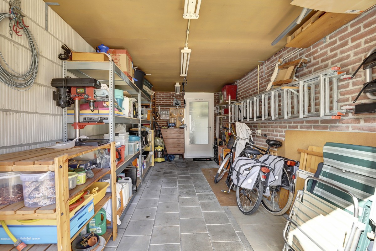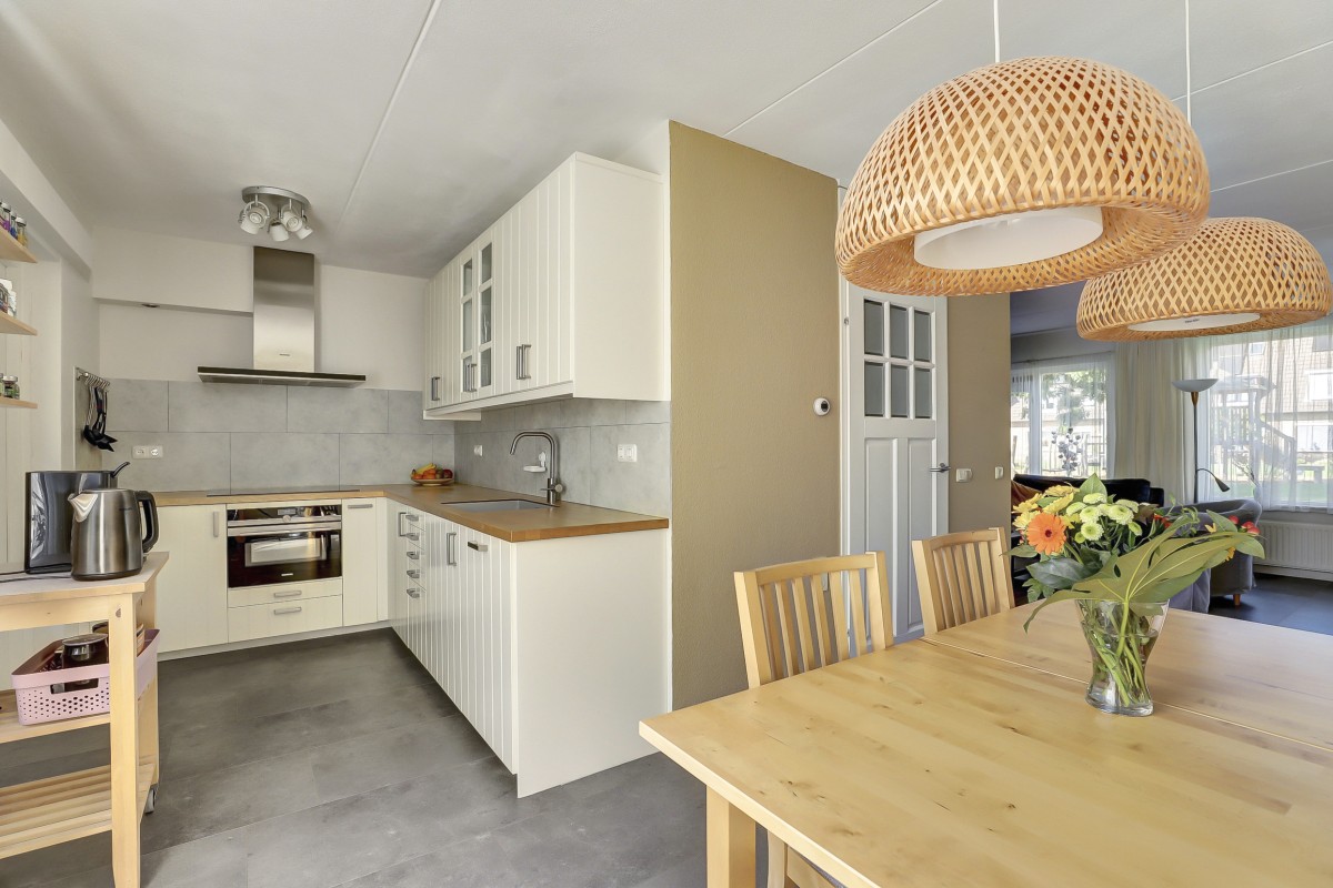 Begane grond: overdekt entree, hal met garderobe, trapopgang, meterkast (2020), toiletruimte met hangcloset en fonteintje doorgang naar de woonkamer met vrij uitzicht over de brede groenstrook. De tuingerichte eethoek met aansluitend de moderne open keuken in hoekopstelling welke voorzien is van een ingebouwde 5-pits inductie kookplaat met flexzone, rvs afzuigkap, vaatwasser, koelkast en een combi-oven. Deur naar de ruime bijkeuken welke is voorzien van een plavuizen vloer met de opstelplaats voor de wasapparatuur. Vanuit de bijkeuken is er een doorgang naar de ruime garage met dubbele deuren naar de oprit en rockpanel boeidelen. Tevens heeft de bijkeuken nog een deur naar buiten aan de voorkant van de woning. De diepe tuin is fraai aangelegd en voorzien van een terras met zonnescherm, houten overkapping, borders met vaste beplanting en poort naar de oprit. De begane grond is grotendeels voorzien van een marmoleum vloer en grotendeels overlegd met een pvc vloer.
