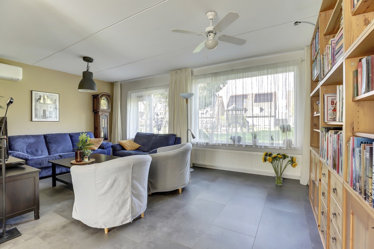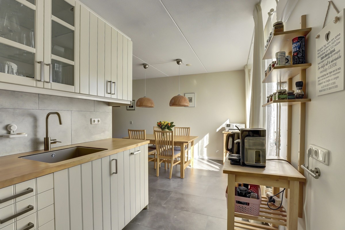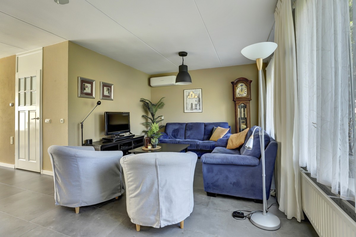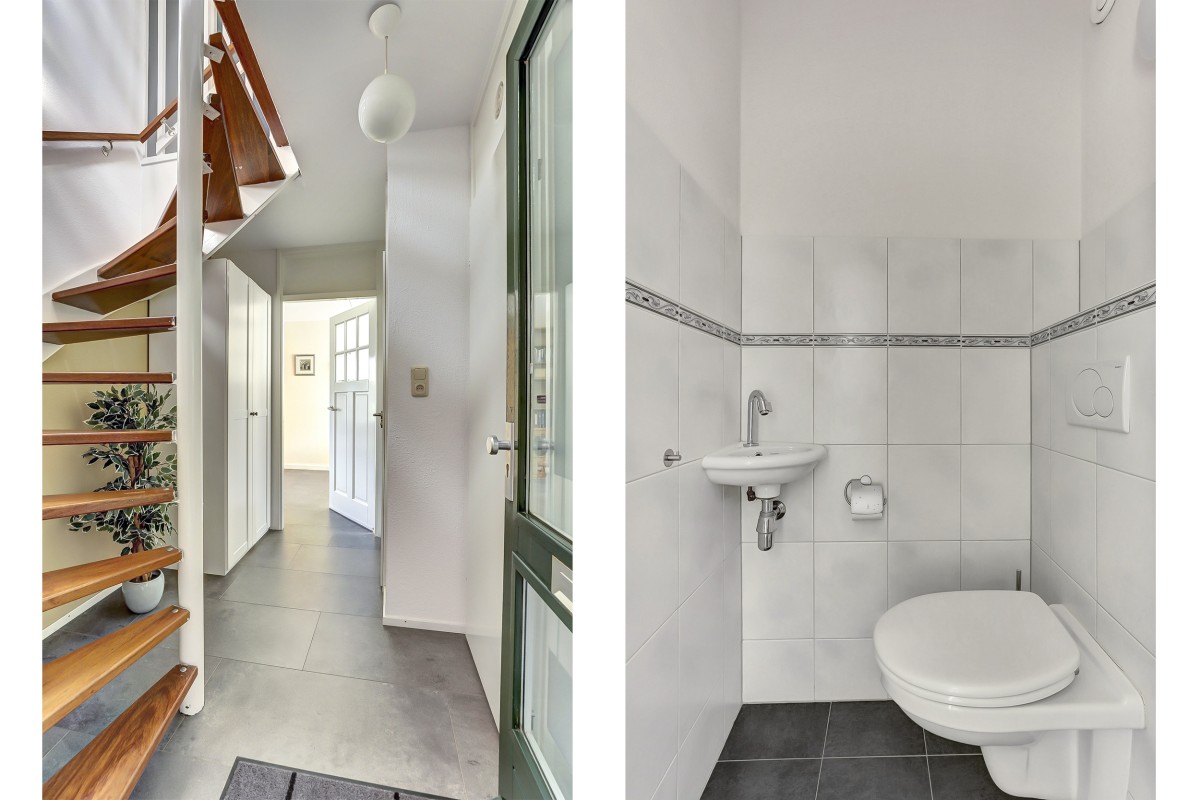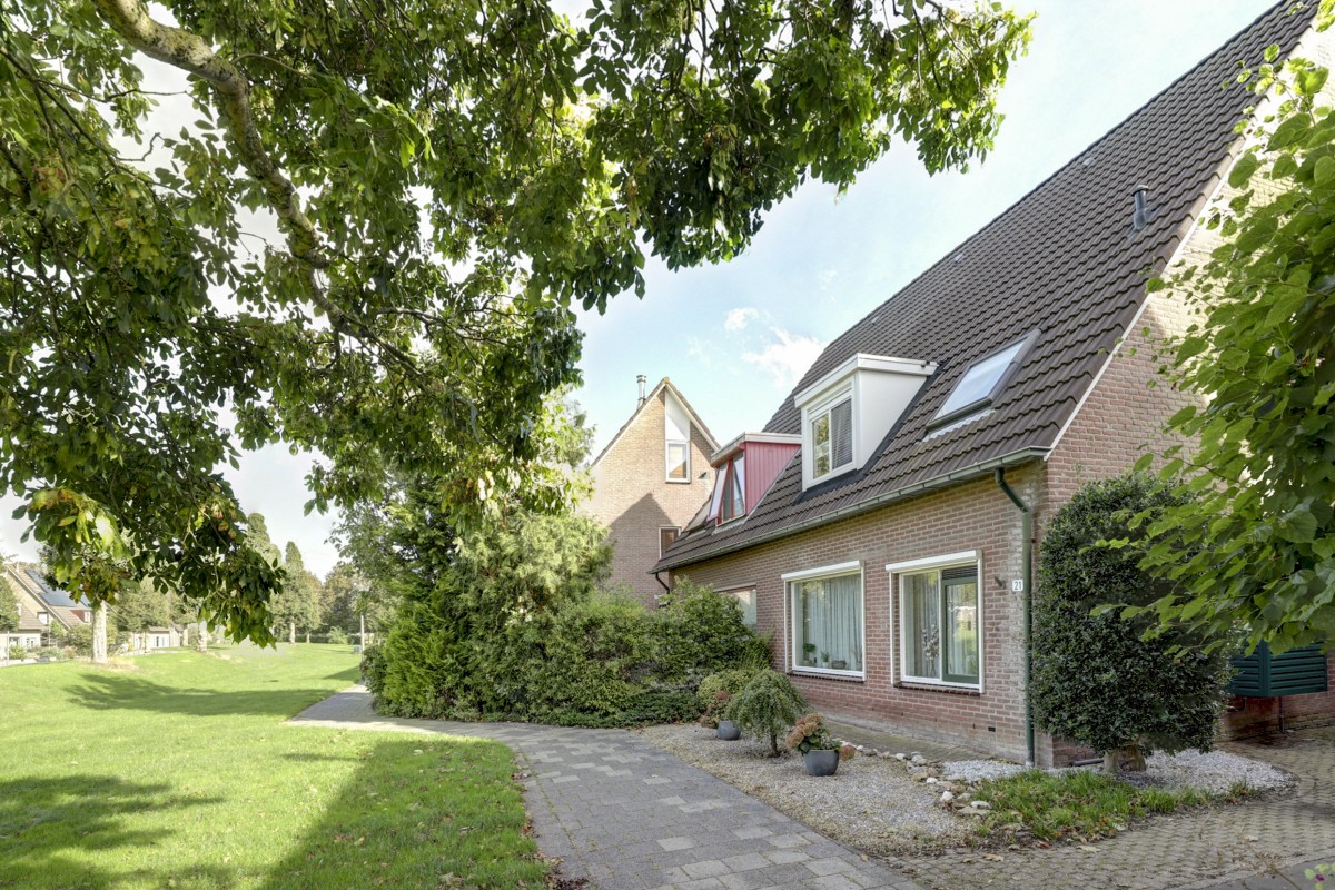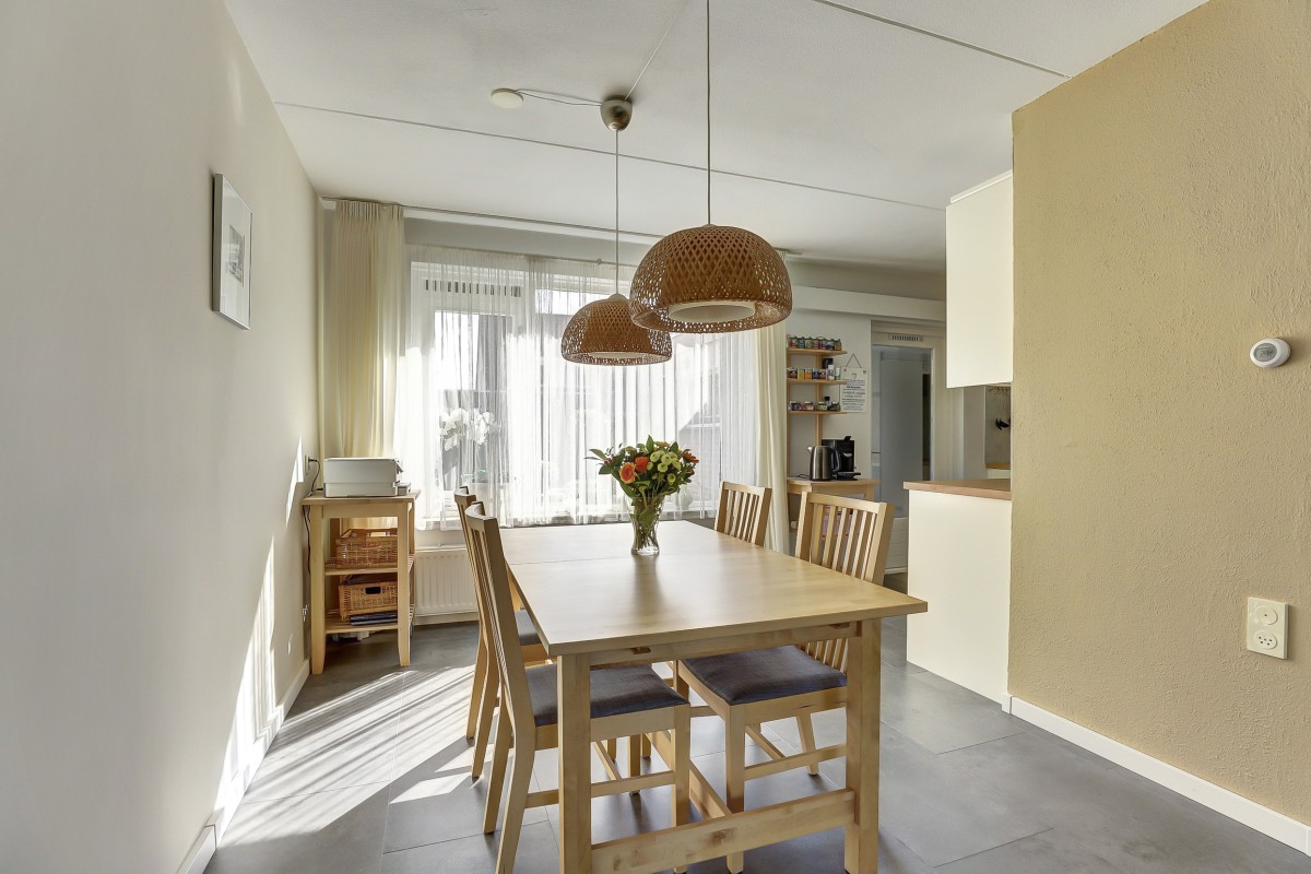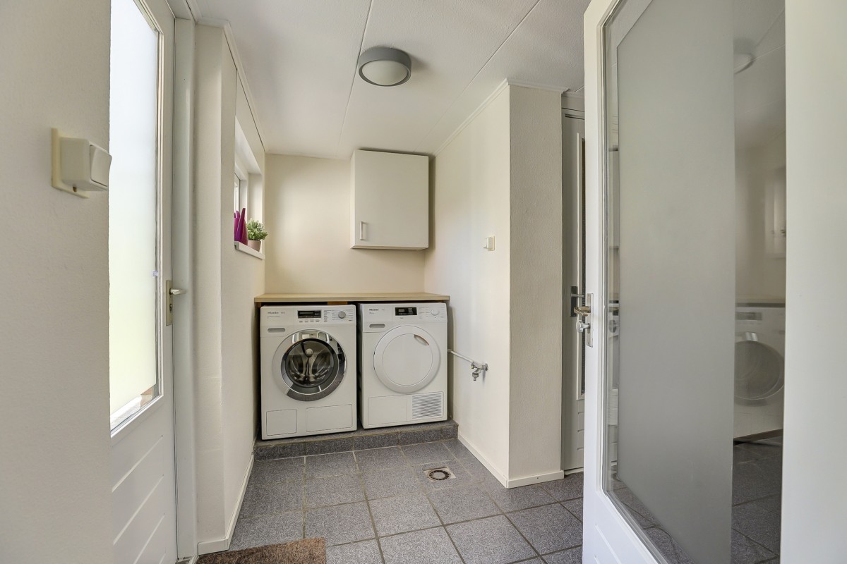 Begane grond: overdekt entree, hal met garderobe, trapopgang, meterkast (2020), toiletruimte met hangcloset en fonteintje doorgang naar de woonkamer met vrij uitzicht over de brede groenstrook. De tuingerichte eethoek met aansluitend de moderne open keuken in hoekopstelling welke voorzien is van een ingebouwde 5-pits inductie kookplaat met flexzone, rvs afzuigkap, vaatwasser, koelkast en een combi-oven. Deur naar de ruime bijkeuken welke is voorzien van een plavuizen vloer met de opstelplaats voor de wasapparatuur. Vanuit de bijkeuken is er een doorgang naar de ruime garage met dubbele deuren naar de oprit en rockpanel boeidelen. Tevens heeft de bijkeuken nog een deur naar buiten aan de voorkant van de woning. De diepe tuin is fraai aangelegd en voorzien van een terras met zonnescherm, houten overkapping, borders met vaste beplanting en poort naar de oprit. De begane grond is grotendeels voorzien van een marmoleum vloer en grotendeels overlegd met een pvc vloer.
