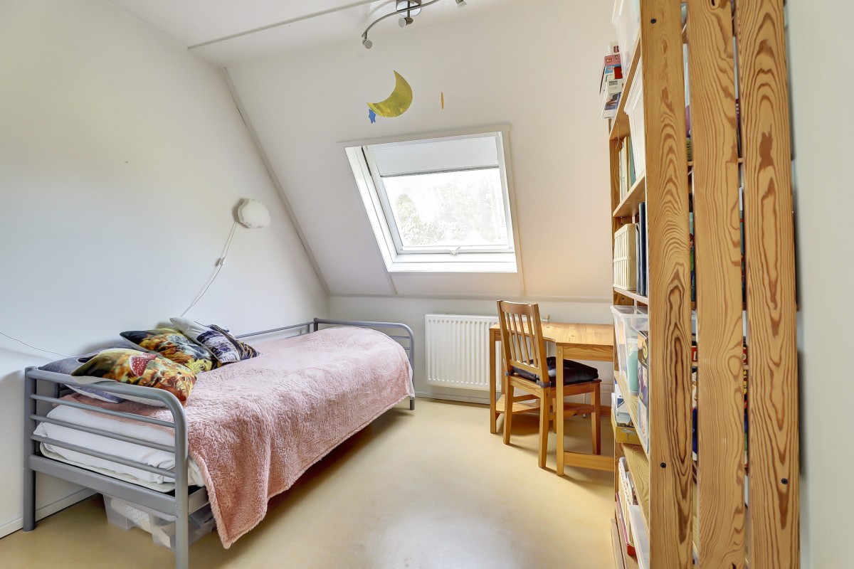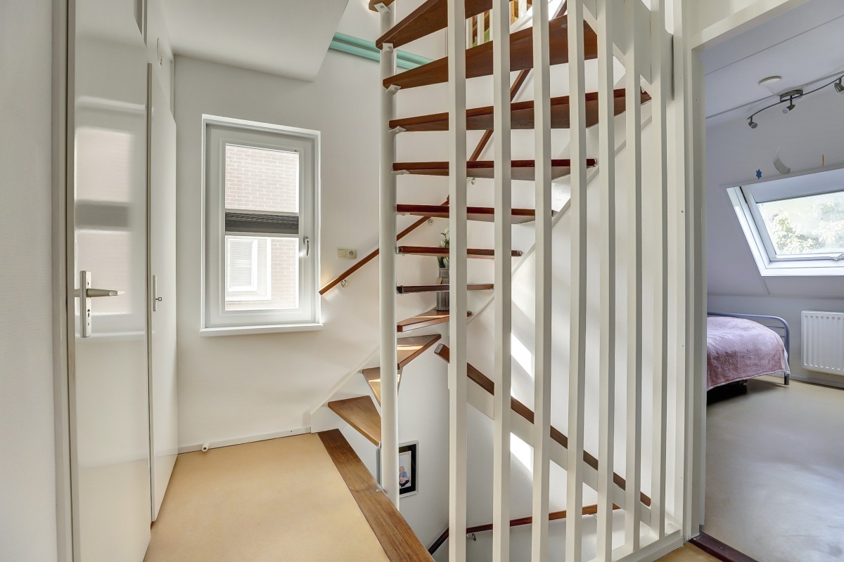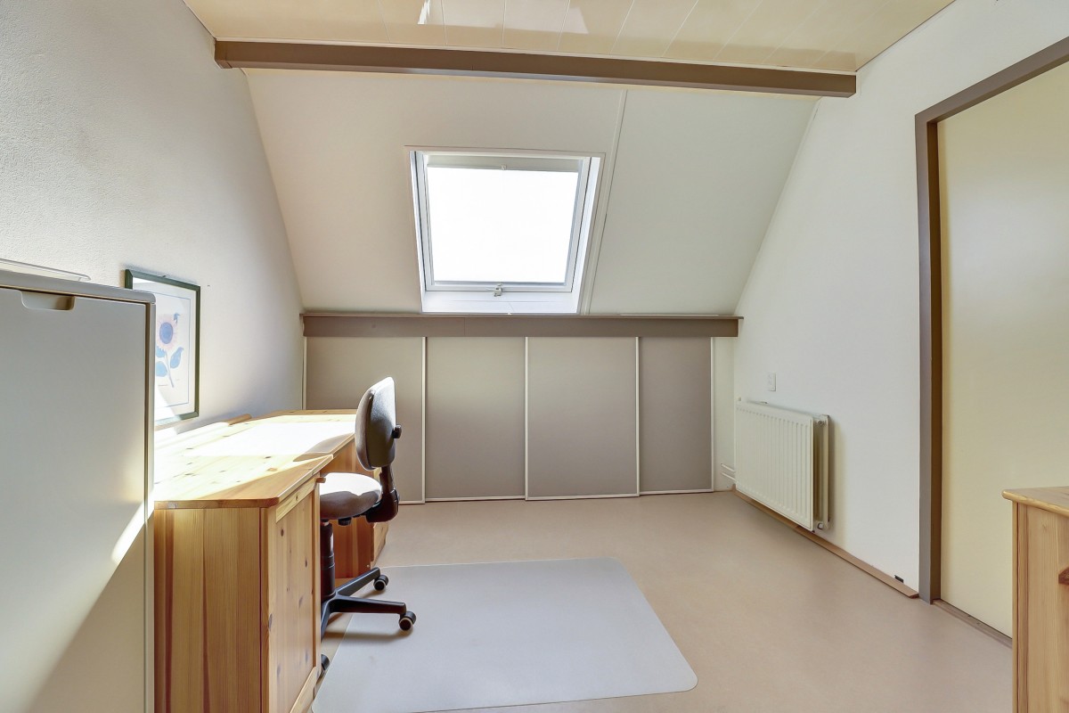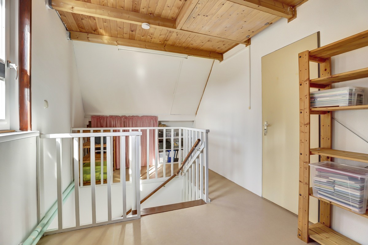 Tweede verdieping: Vaste trap naar ruime zolderverdieping voorzien van een kunststof gevelraam met kantel/kiepraam met op de voorzolder de opstelplaats van de C.V.-ketel (Intergas 2021) en mechanische ventilatie (2021) alsmede voldoende bergruimte achter de knieschotten. Royale vierde slaapkamer voorzien van een dakraam, knieschotten en eveneens een marmoleum vloer. Boven de slaapkamer en de overloop is nog een ruime bergzolder aanwezig met tevens de omvormer van de zonnepanelen.