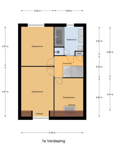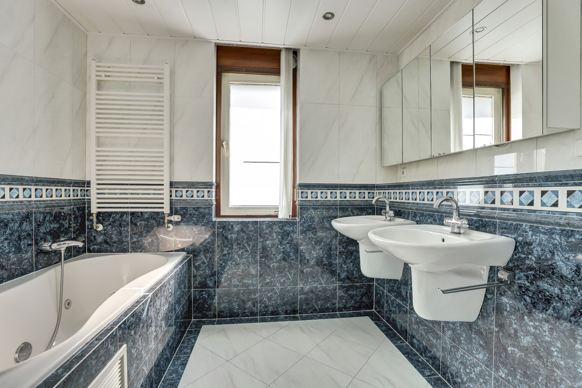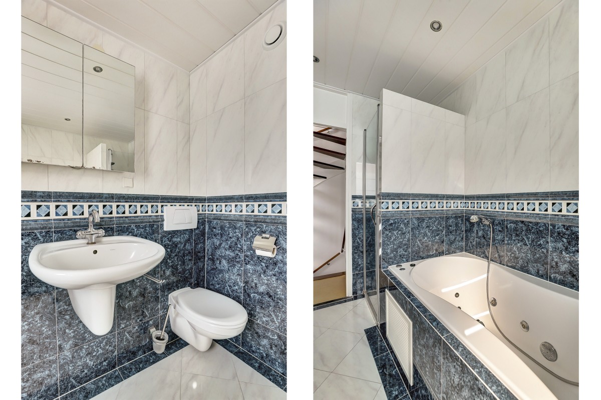 Eerste verdieping: vaste trap naar de overloop voorzien van een kunststof gevelraam met kantel/kiepraam en aansluitend 3 slaapkamers waarvan de ouder slaapkamer aan de voorzijde is voorzien van een onderhoudsarme dakkapel voorzien kunststof kozijn en rockpanel bekleding. De ruime badkamer met blauwe betegeling is voorzien van een inloopdouche, ligbad met whirlpool, twee wastafels, designradiator en een 2e hangcloset. De eerste verdieping is voorzien van een marmoleum vloer deels overlegd met een tapijtvloer.