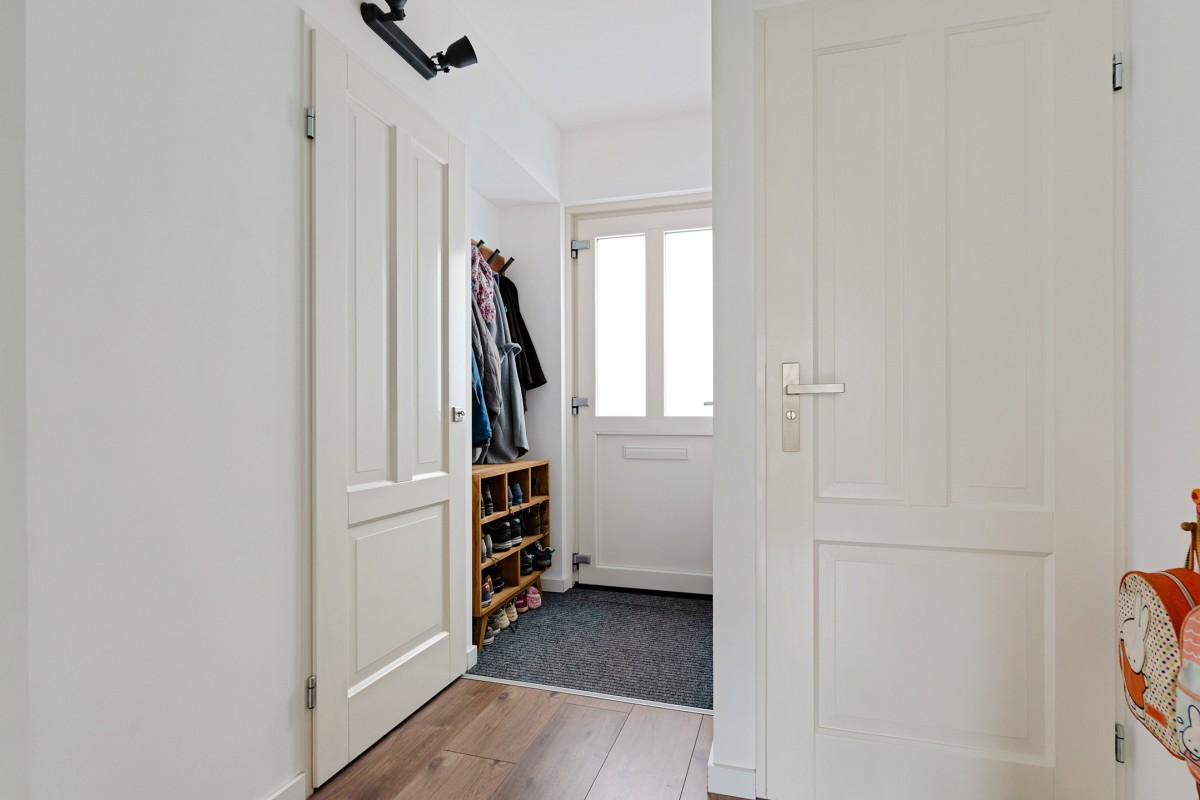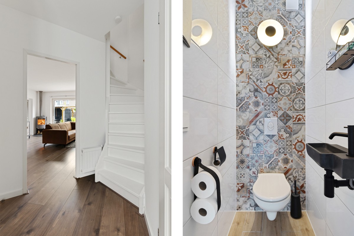Entrance hall with access to the updated meter cupboard with fiber-optic connection, a separate toilet with a small sink, stairs to the first floor, and a door leading to the living room.