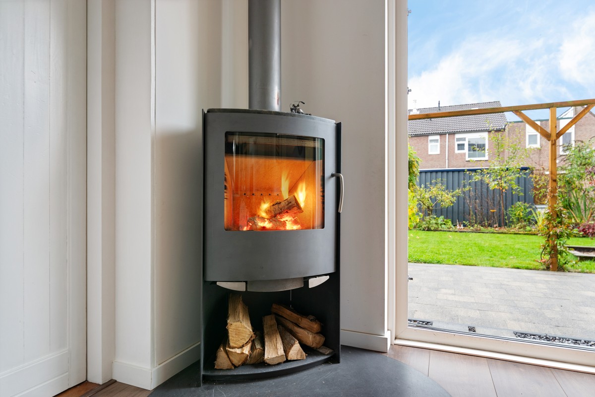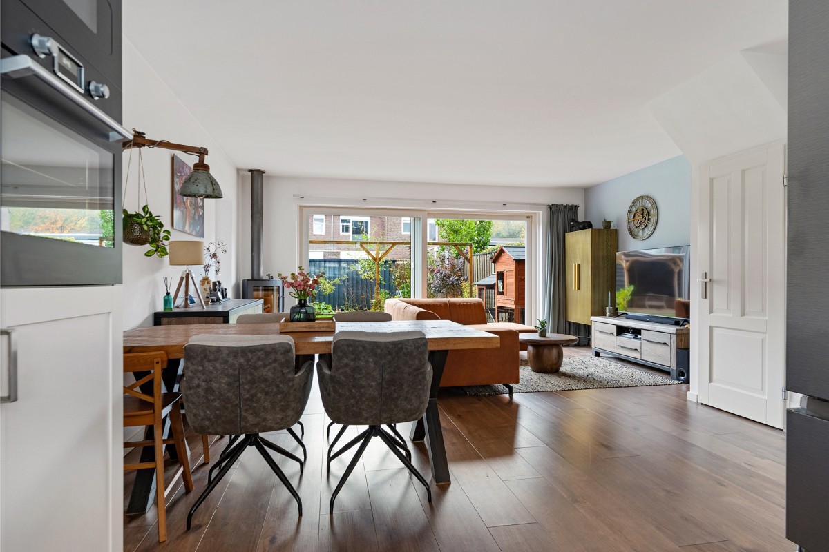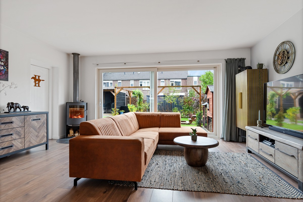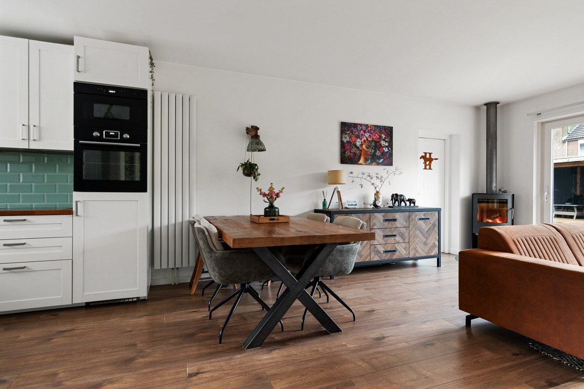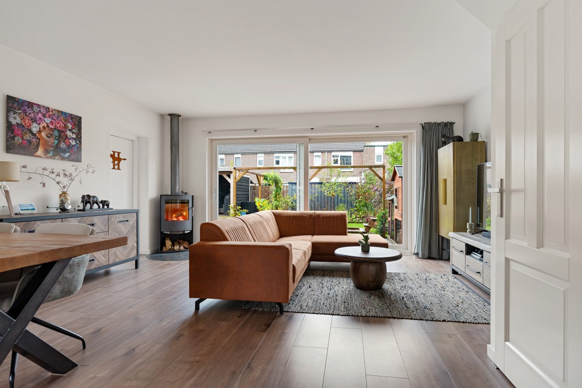 Upon entering the spacious living room, you'll immediately notice the abundant natural light from the large windows and sliding doors to the garden. This cozy living space exudes warmth and comfort, with a beautiful wood-burning stove as its focal point—perfect for cozy winter evenings.