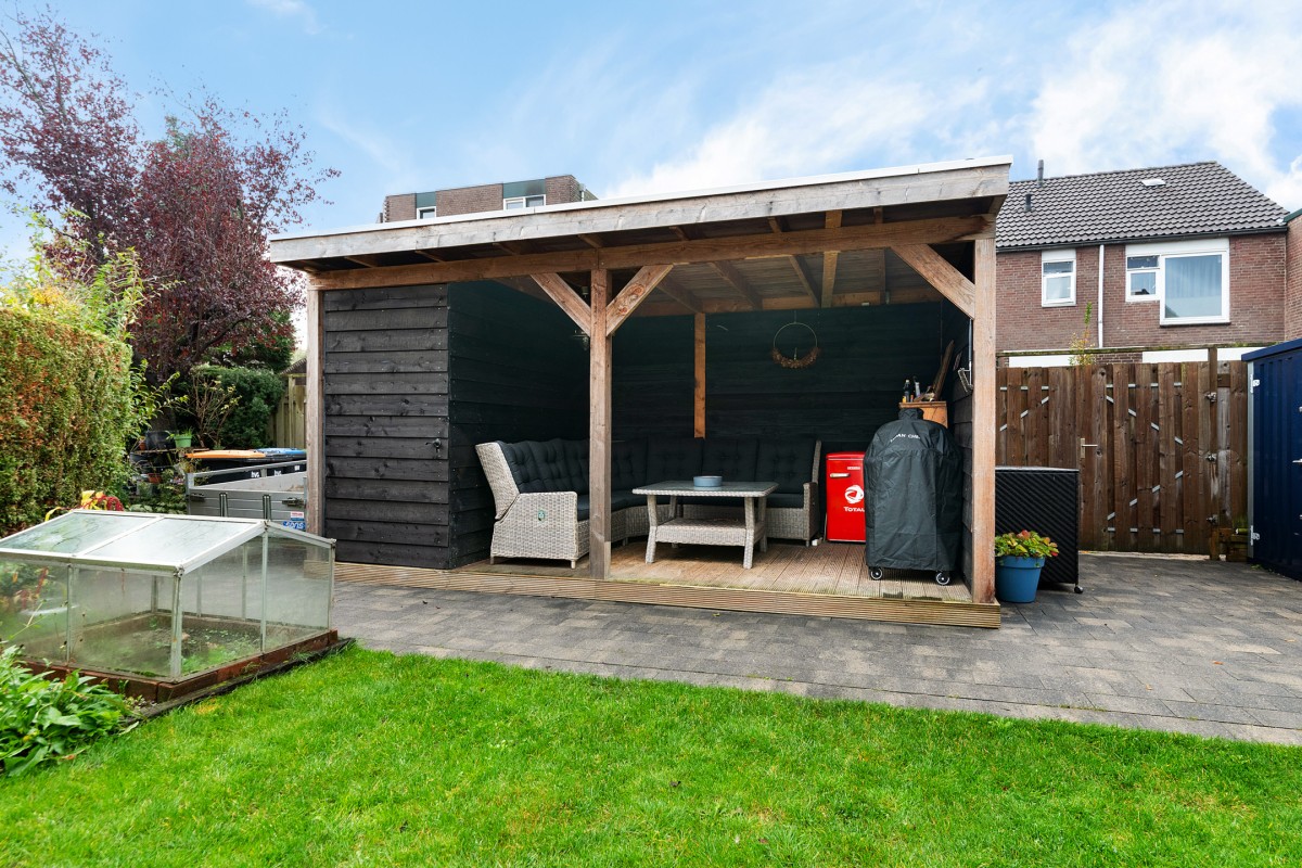This charming space offers numerous possibilities to enjoy the outdoors year-round. The shed is suitable for storing gardening tools, bicycles, or garden furniture and is solidly built with electricity, making it ideal for use as a hobby room.