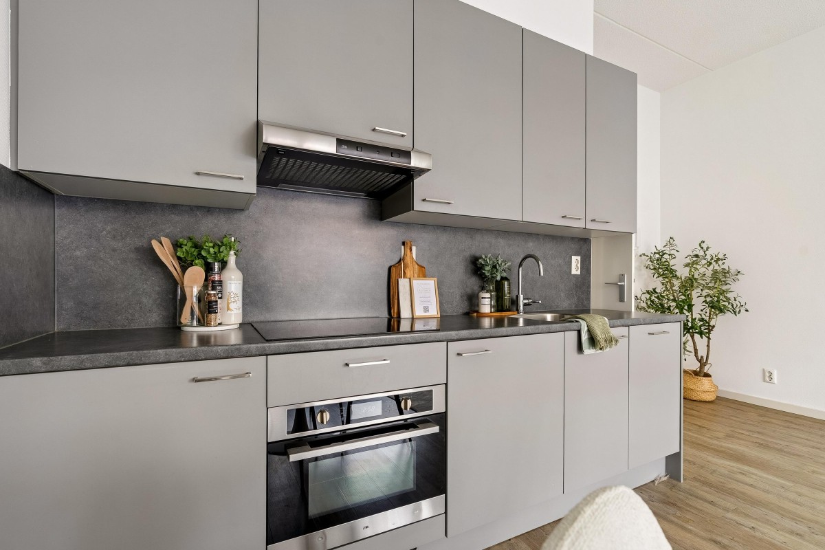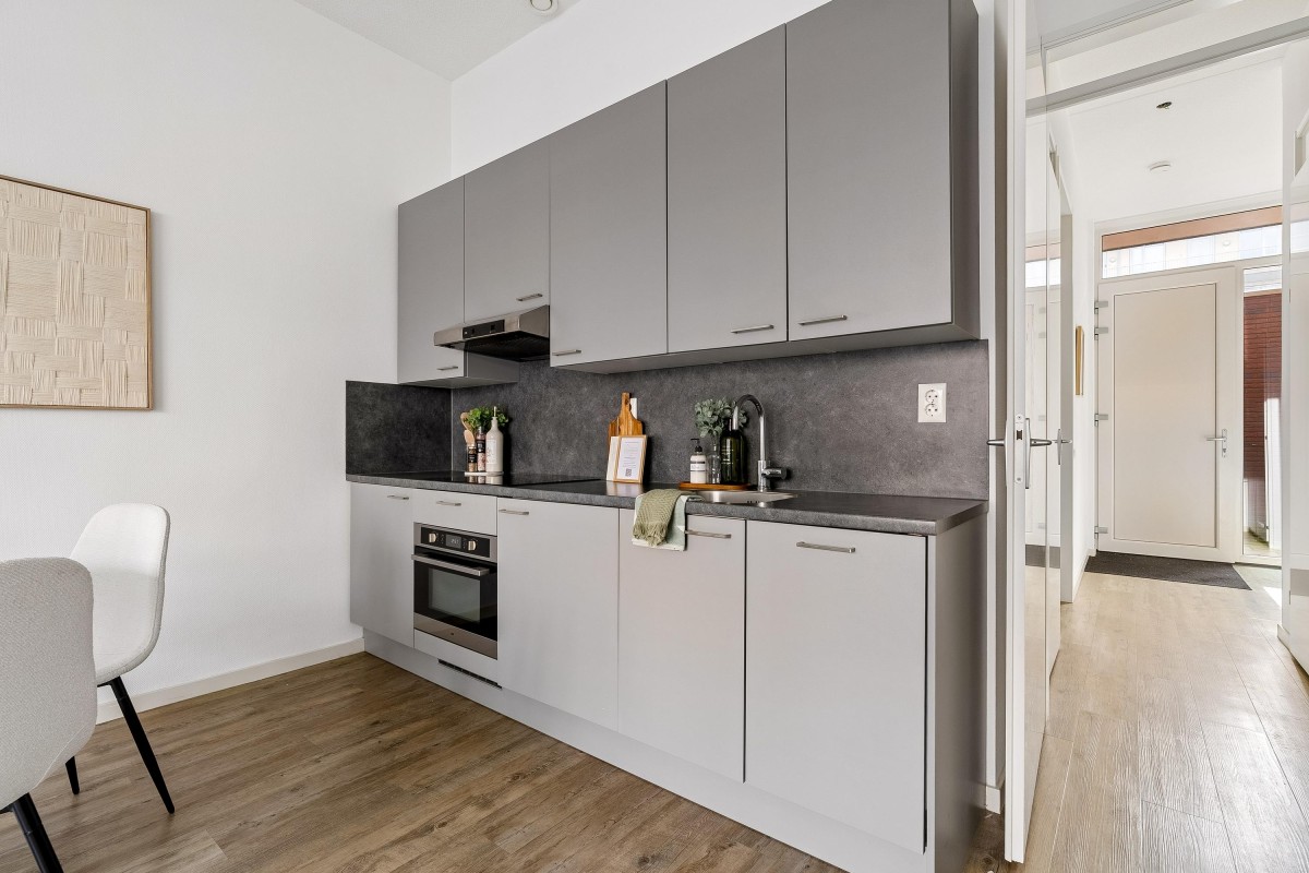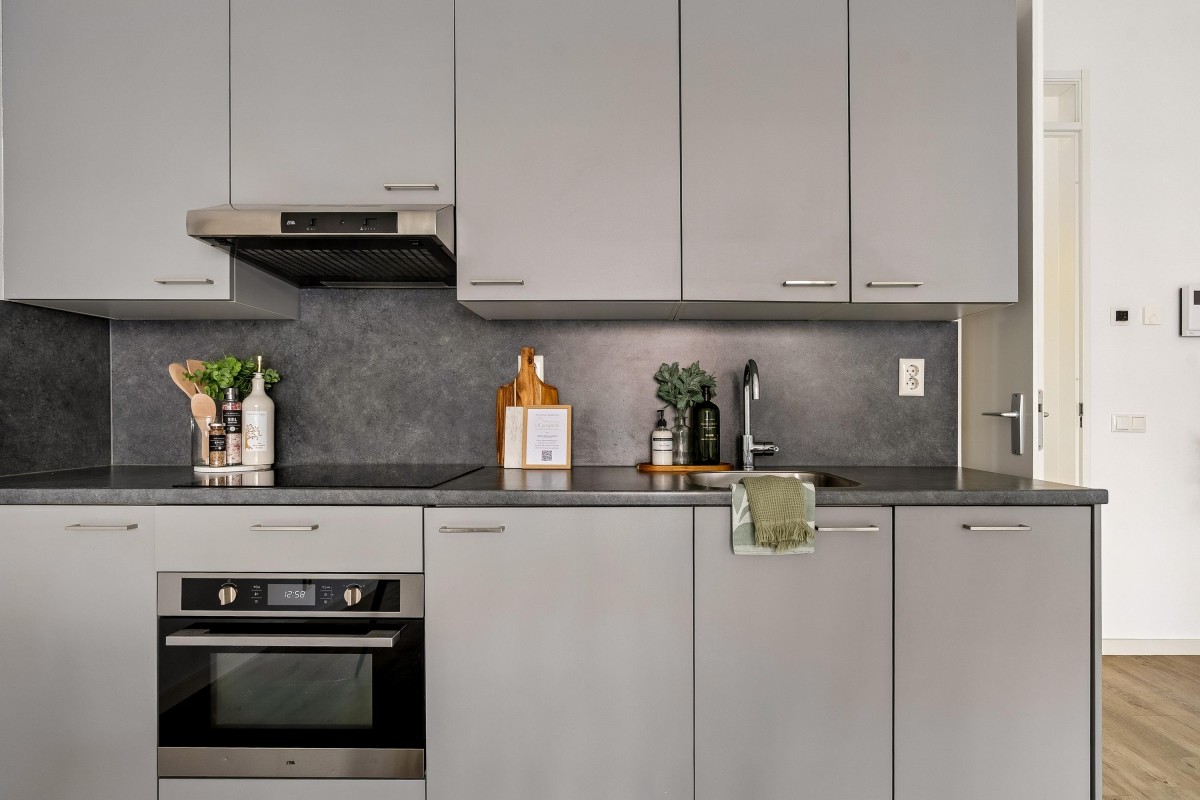 You enter into the hallway with access to the bedroom, meter cupboard, a separate storage closet, and the bathroom equipped with a walk-in shower, toilet, and sink. The bright living room with open kitchen features modern built-in appliances and offers space for both a seating and dining area. The bedroom is situated at the quiet rear side of the property and provides enough space for a double bed and wardrobe. The apartment is finished with a PVC floor with underfloor heating and smooth plastered walls.