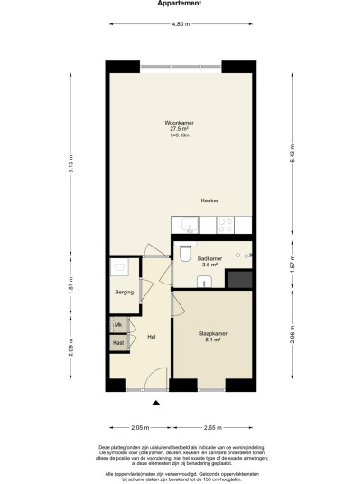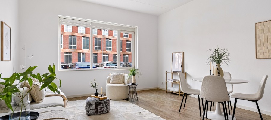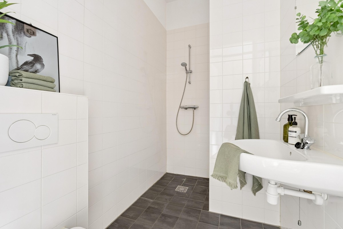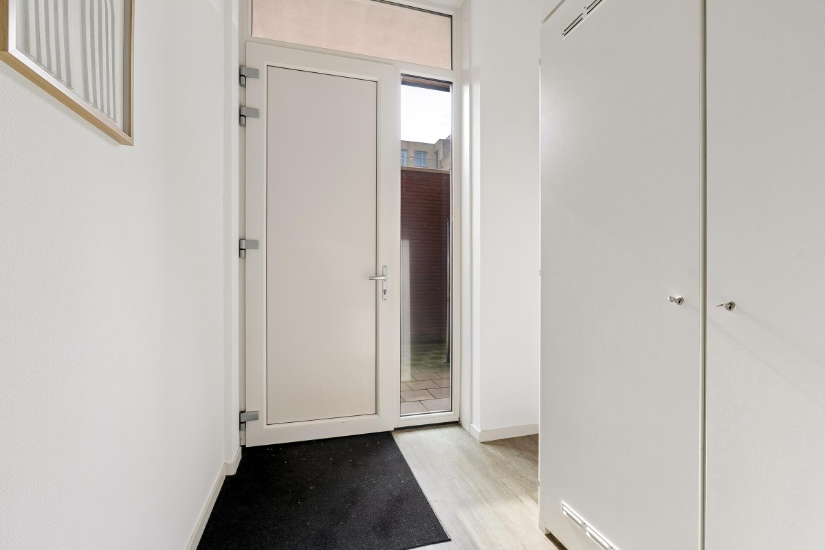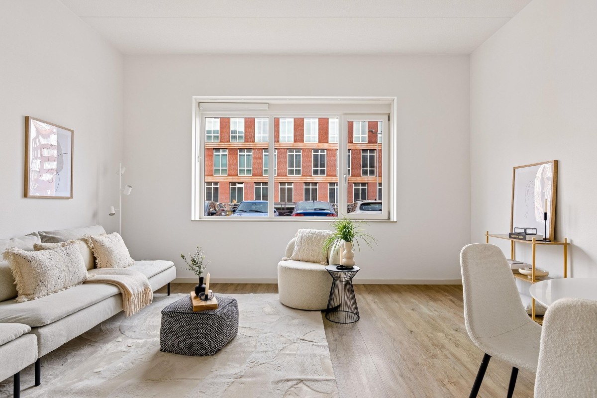 You enter into the hallway with access to the bedroom, meter cupboard, a separate storage closet, and the bathroom equipped with a walk-in shower, toilet, and sink. The bright living room with open kitchen features modern built-in appliances and offers space for both a seating and dining area. The bedroom is situated at the quiet rear side of the property and provides enough space for a double bed and wardrobe. The apartment is finished with a PVC floor with underfloor heating and smooth plastered walls.