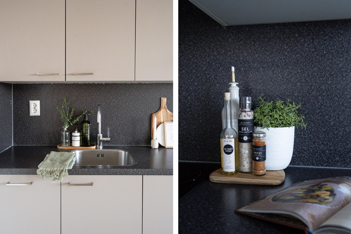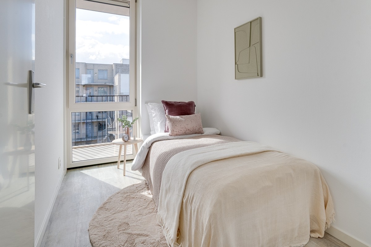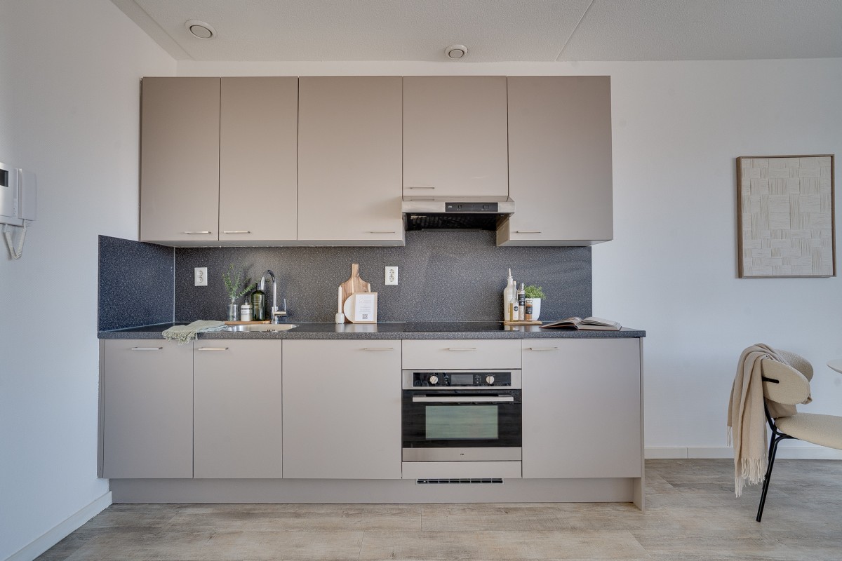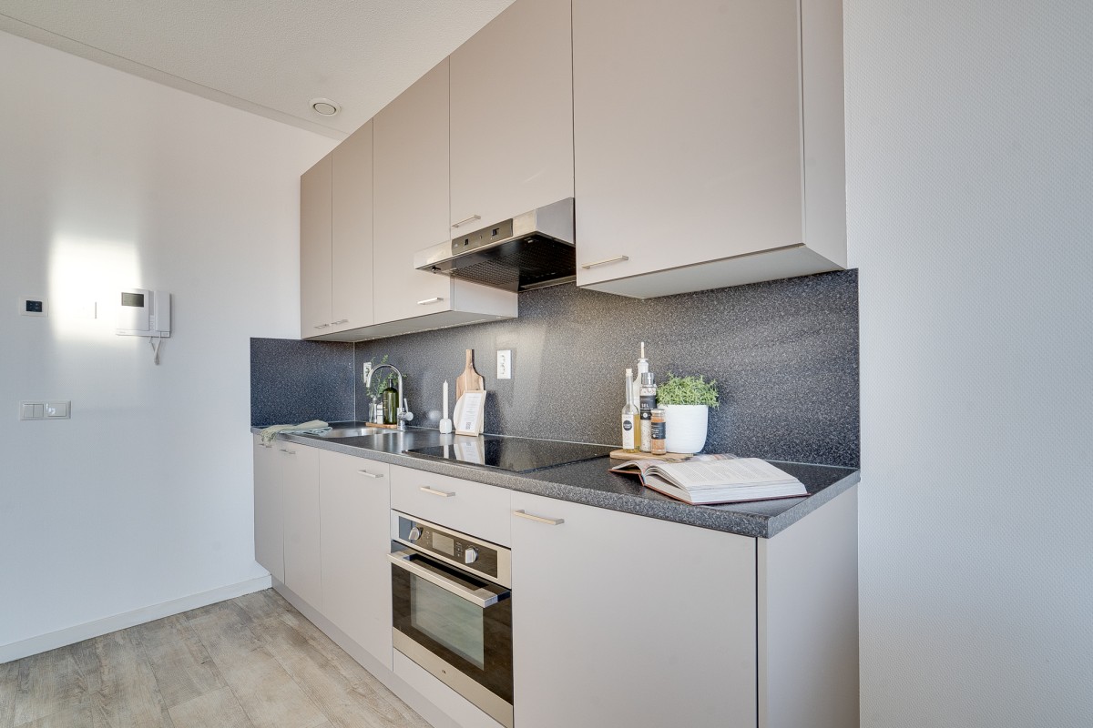 The bright living room with an open kitchen is equipped with modern built-in appliances and offers space for both a seating and dining area. From the living room, you have access to the north-facing balcony.
