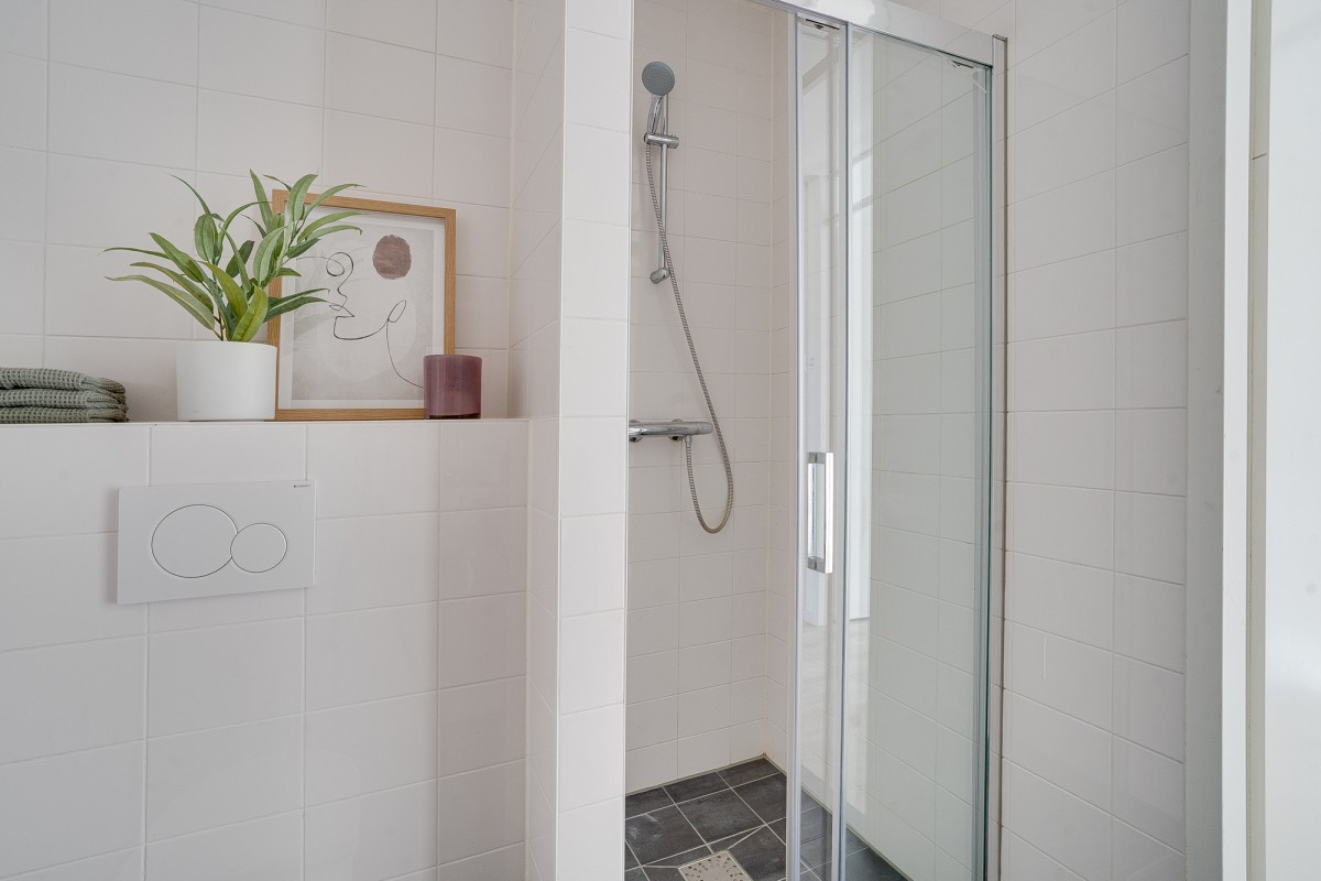 Upon entering, you’ll find a spacious hallway with access to the meter cupboard, a separate storage cupboard, and the bathroom with a walk-in shower, toilet, and sink.