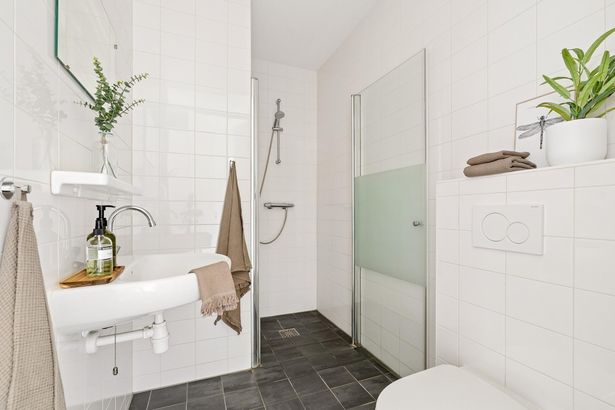 The bedroom is compact but efficiently laid out and directly connected to the neat bathroom. The bathroom is fully tiled and equipped with a walk-in shower, washbasin with mirror, and a toilet.