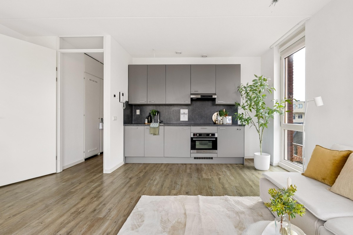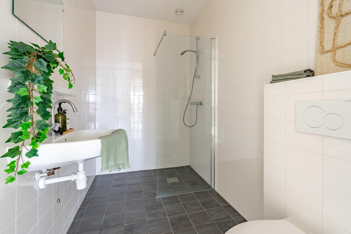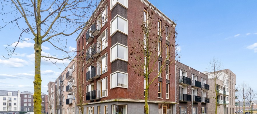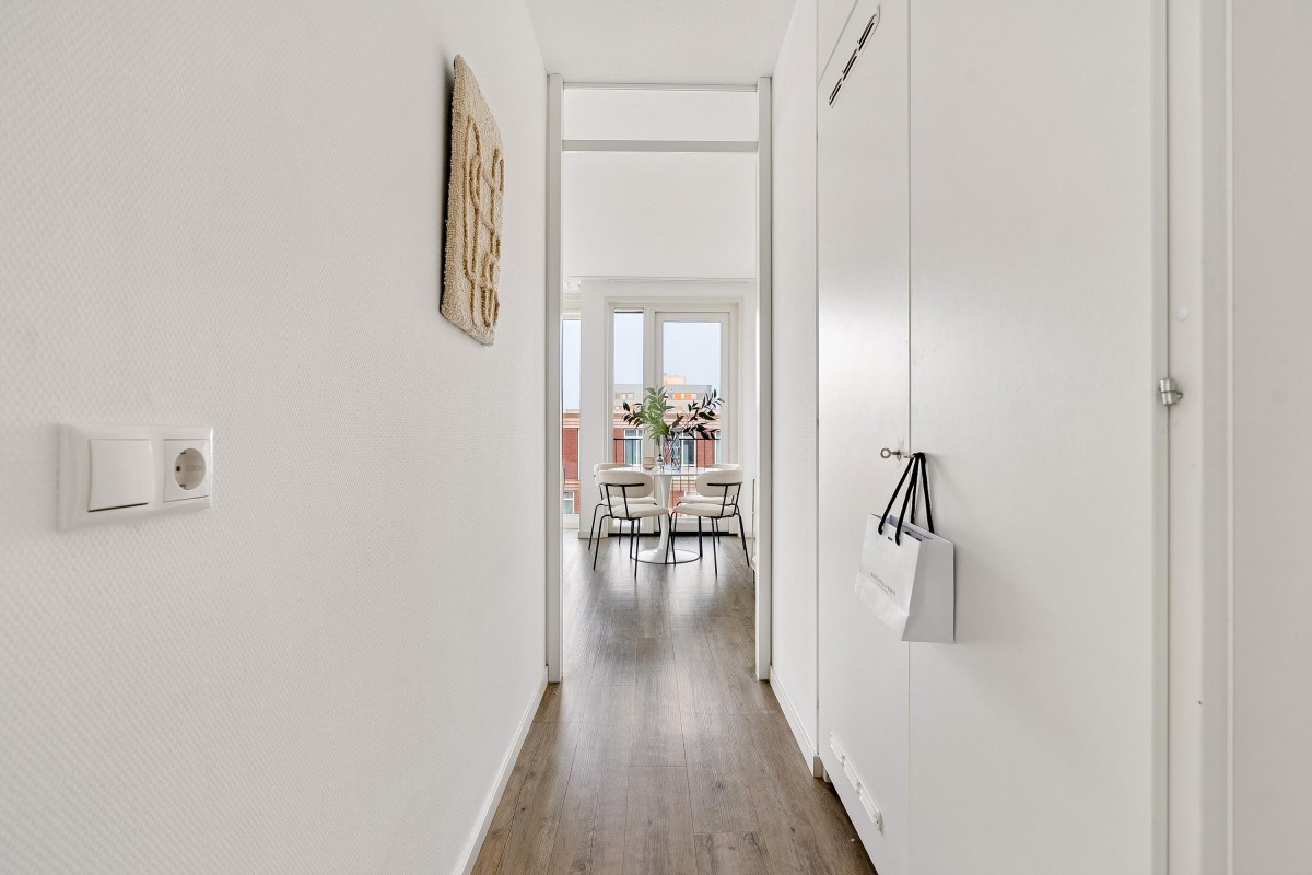 You enter into a spacious hallway with access to the meter cupboard, a separate storage closet, and the bathroom with a walk-in shower, toilet, and washbasin. The bright living room with an open kitchen is equipped with modern built-in appliances and offers space for both a sitting and dining area. From the living room, you have access to the north-facing balcony. The two bedrooms are located at the quiet rear of the property and offer enough space for a double bed and wardrobe. The apartment has a PVC floor and clean, smooth walls.