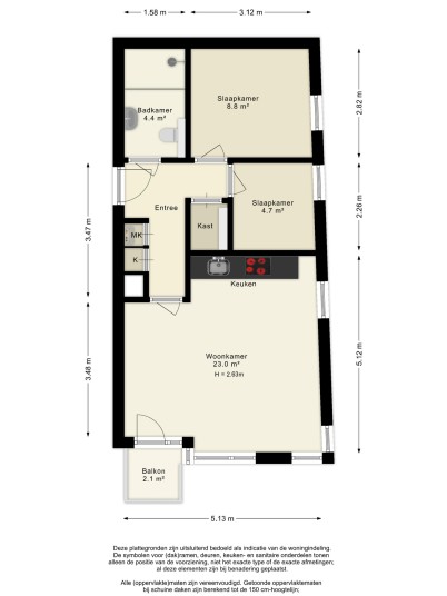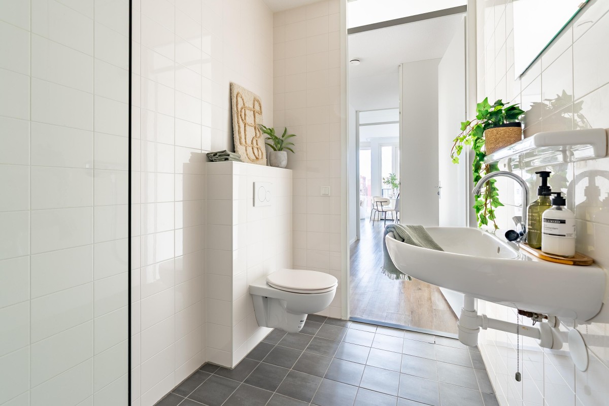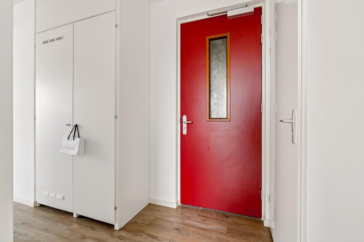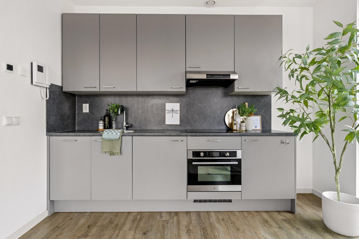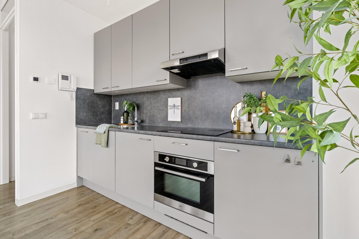 You enter into a spacious hallway with access to the meter cupboard, a separate storage closet, and the bathroom with a walk-in shower, toilet, and washbasin. The bright living room with an open kitchen is equipped with modern built-in appliances and offers space for both a sitting and dining area. From the living room, you have access to the north-facing balcony. The two bedrooms are located at the quiet rear of the property and offer enough space for a double bed and wardrobe. The apartment has a PVC floor and clean, smooth walls.