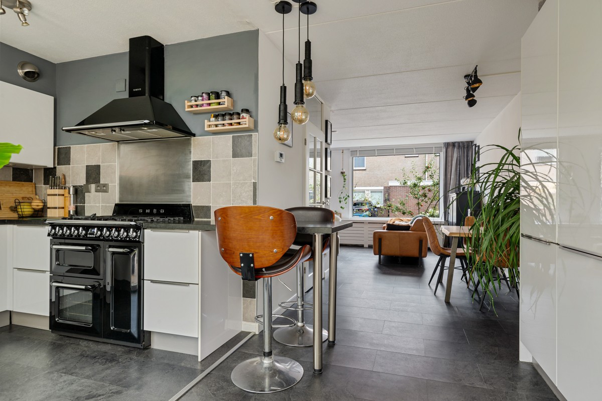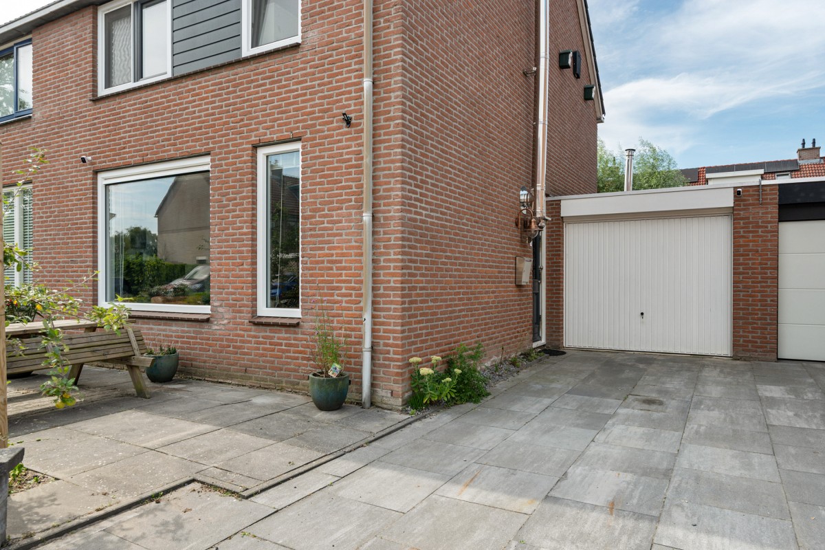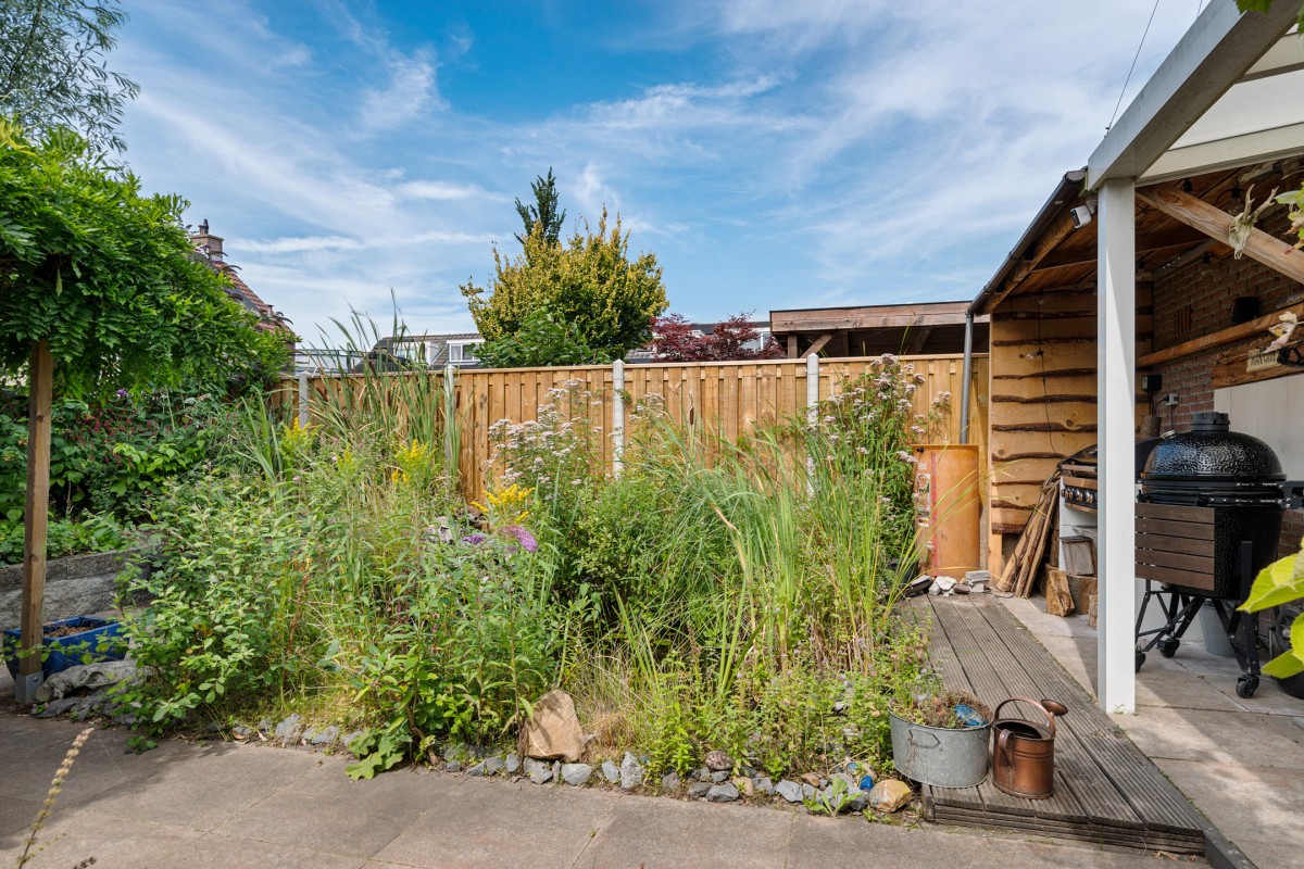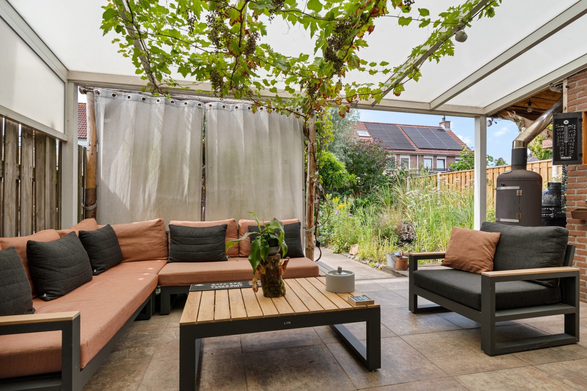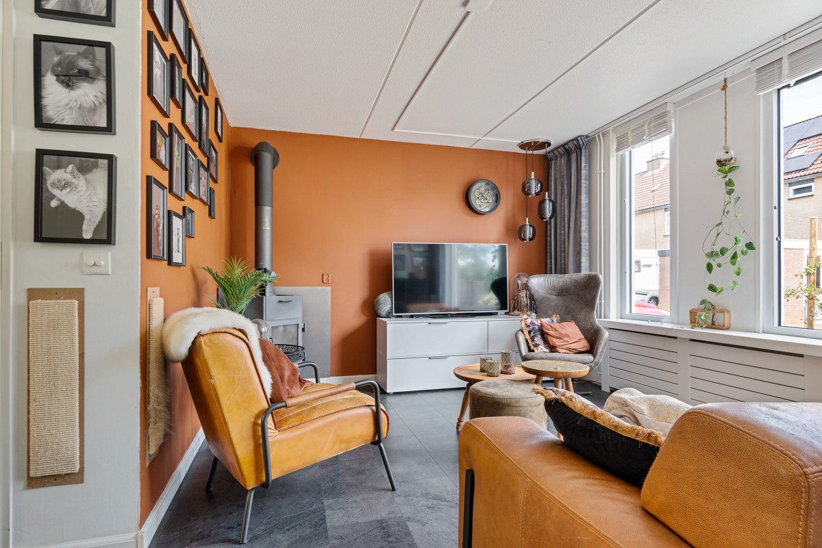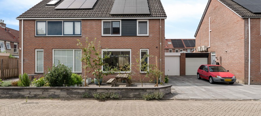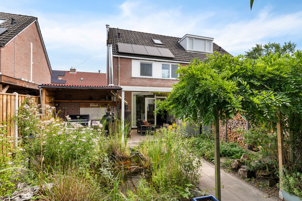 Delightful semi-detached house with a garage, on-site parking, a living room with a cozy wood-burning stove, a kitchen with built-in appliances, 4 bedrooms, a modern bathroom (2025), a west-facing covered back garden, Energy Label A, and 13 solar panels.