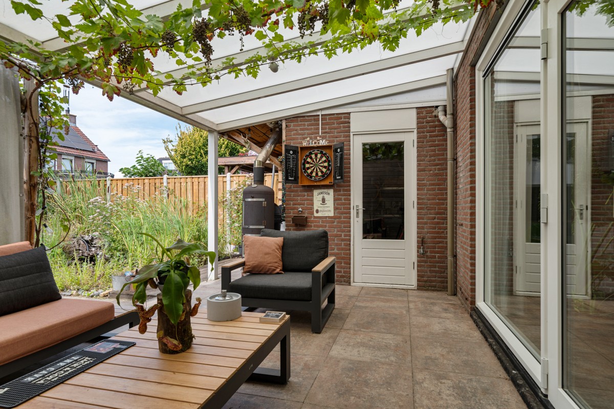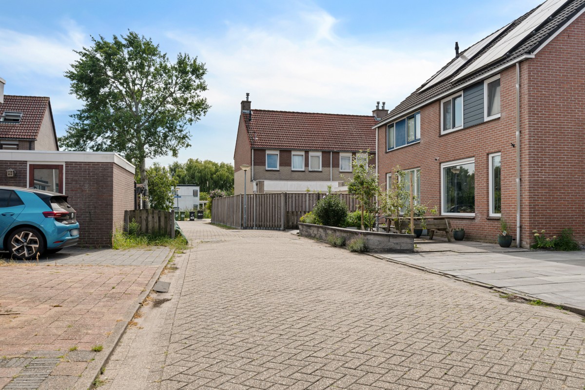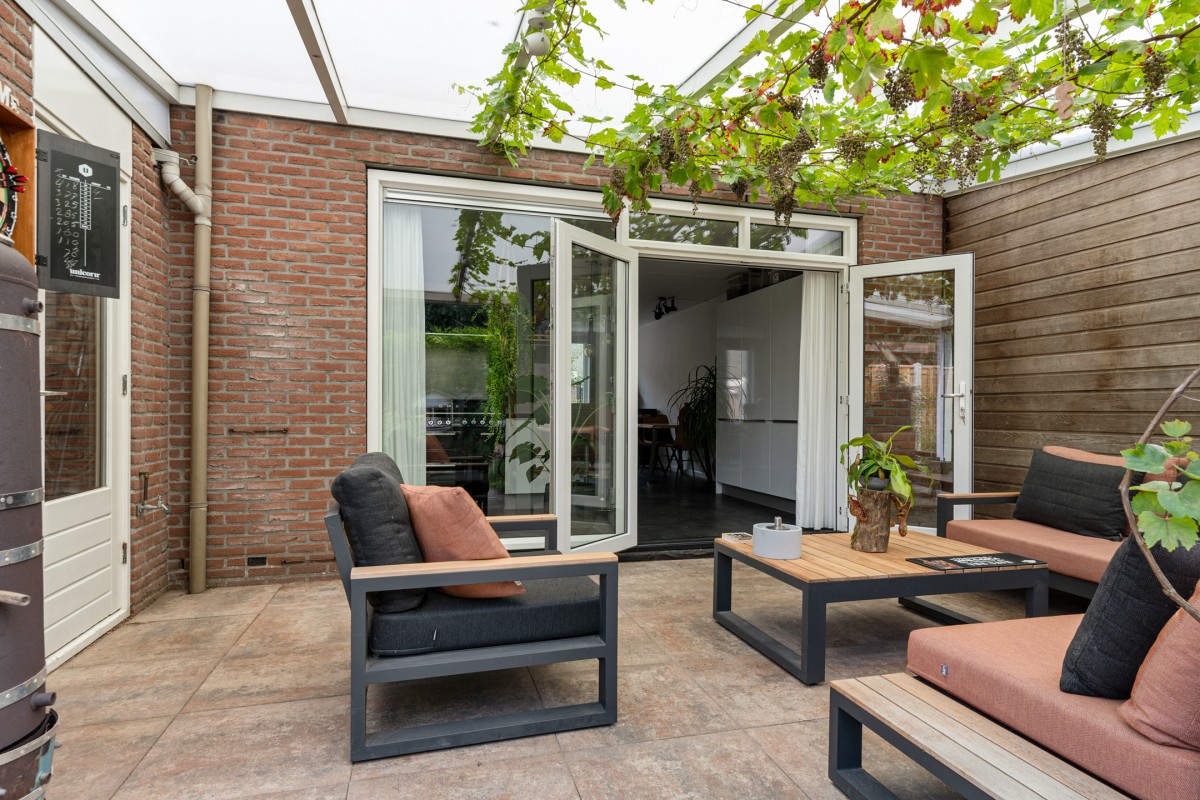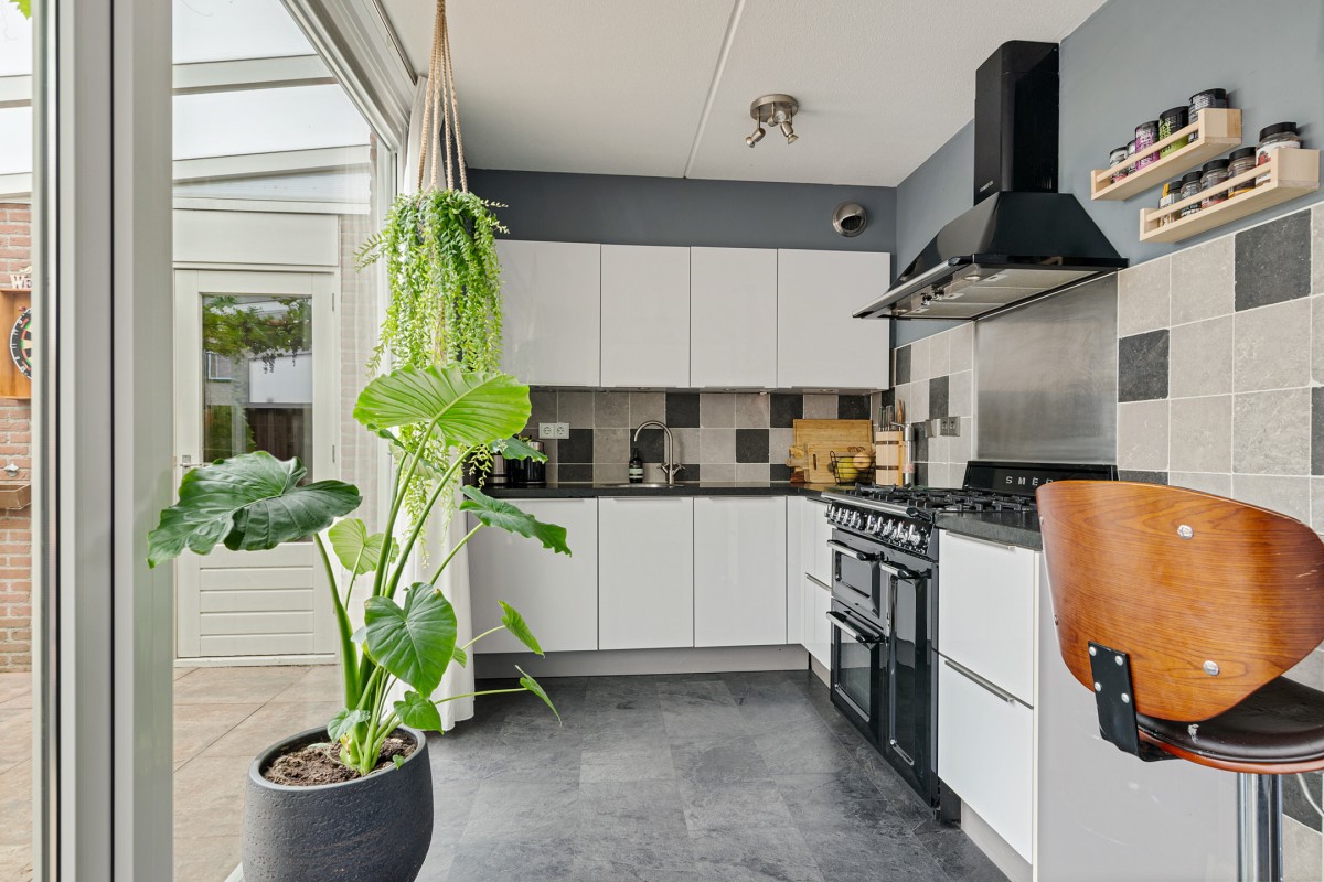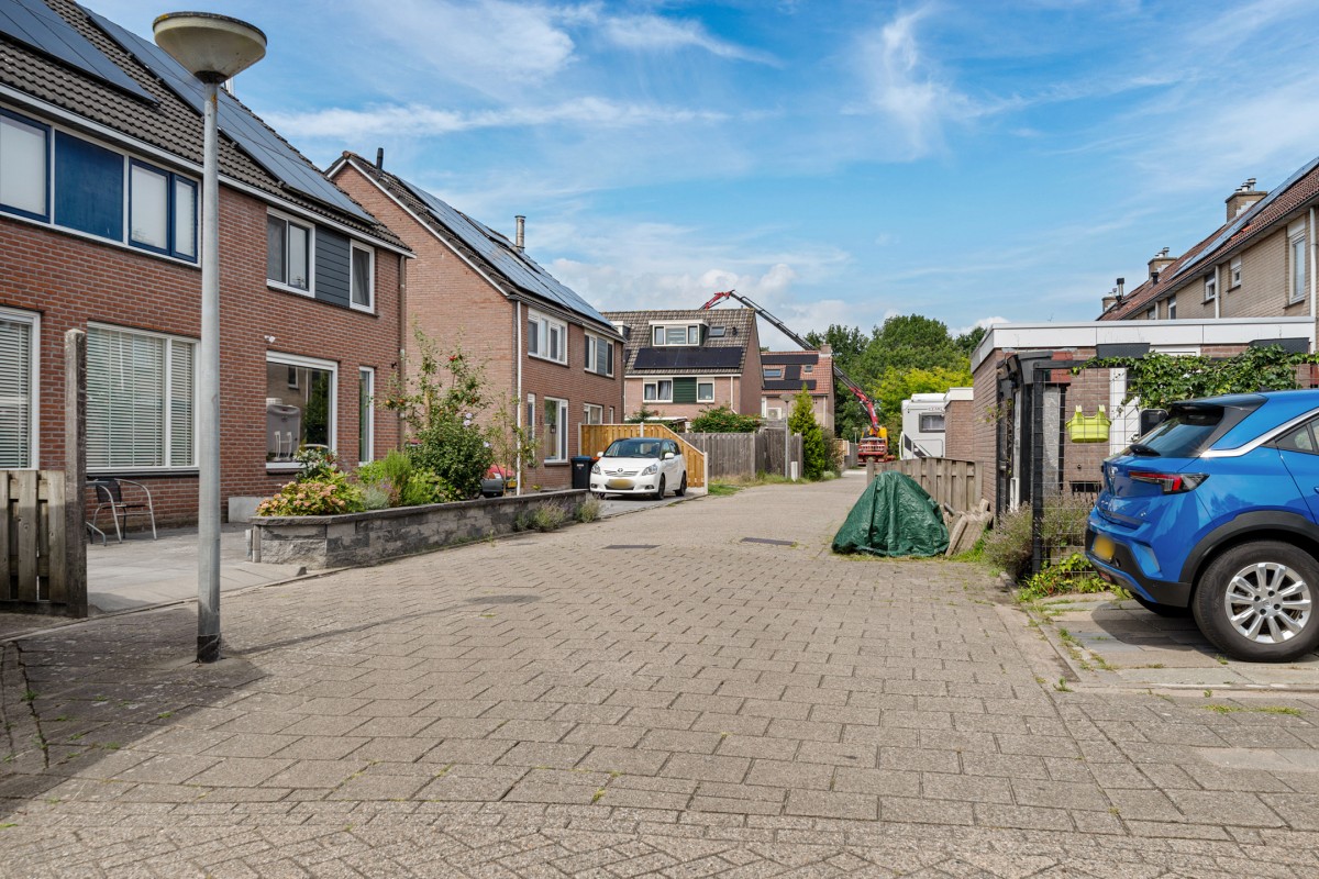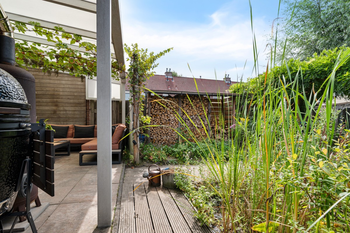 Delightful semi-detached house with a garage, on-site parking, a living room with a cozy wood-burning stove, a kitchen with built-in appliances, 4 bedrooms, a modern bathroom (2025), a west-facing covered back garden, Energy Label A, and 13 solar panels.