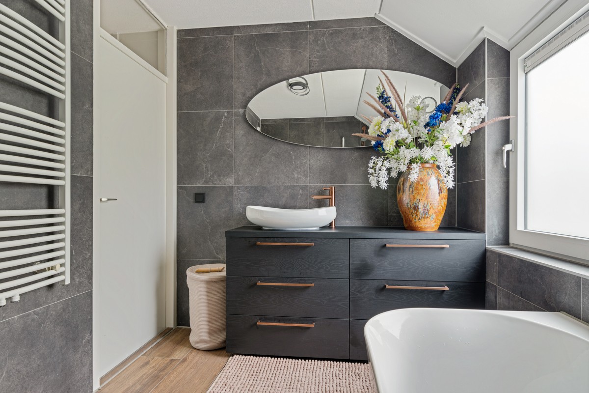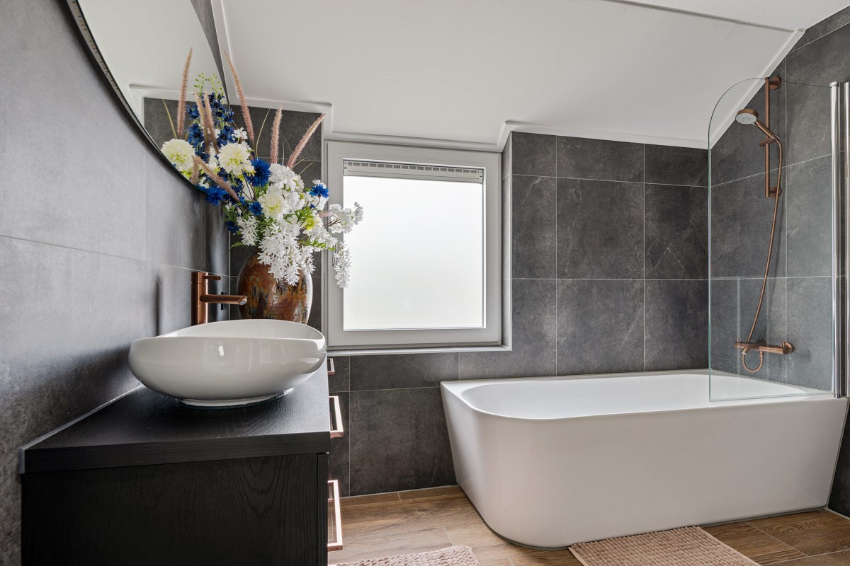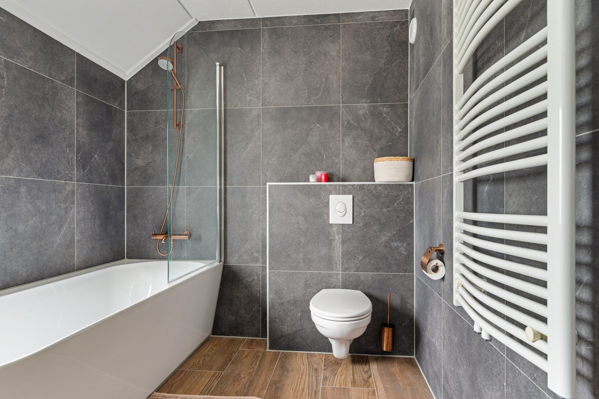 The bathroom was modernized in 2025 and is equipped with a bathtub (shower-in-bath), vanity unit, wall-hung toilet, and a designer radiator.