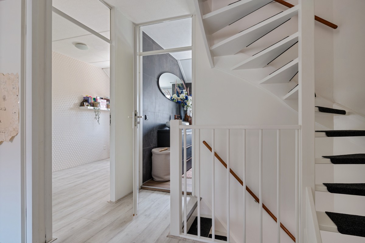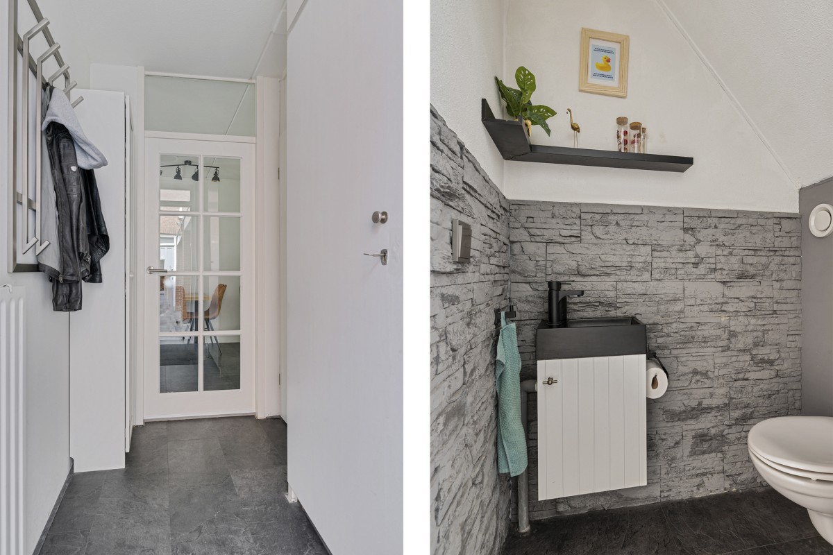 Entrance hall with access to the meter cupboard with fiber optic connection, wall-hung toilet with hand basin, stairs to the upper floor, and a door to the living room.