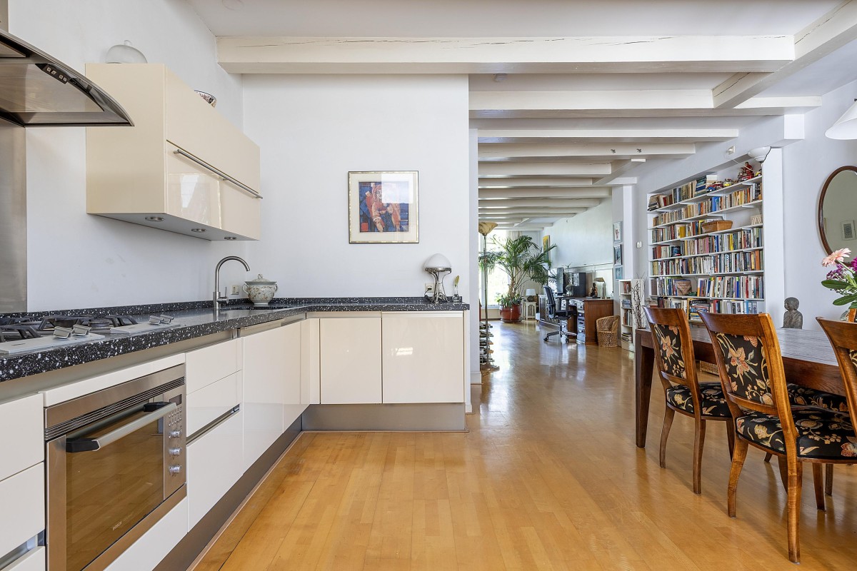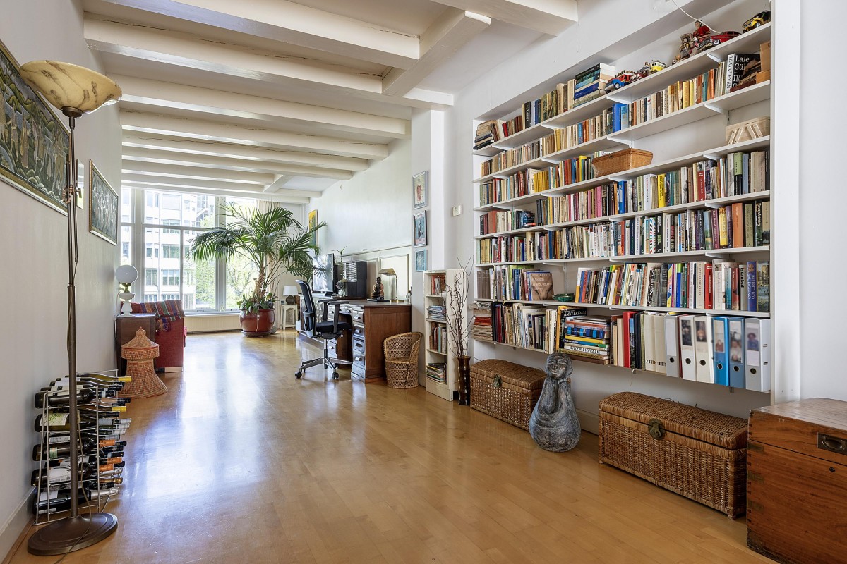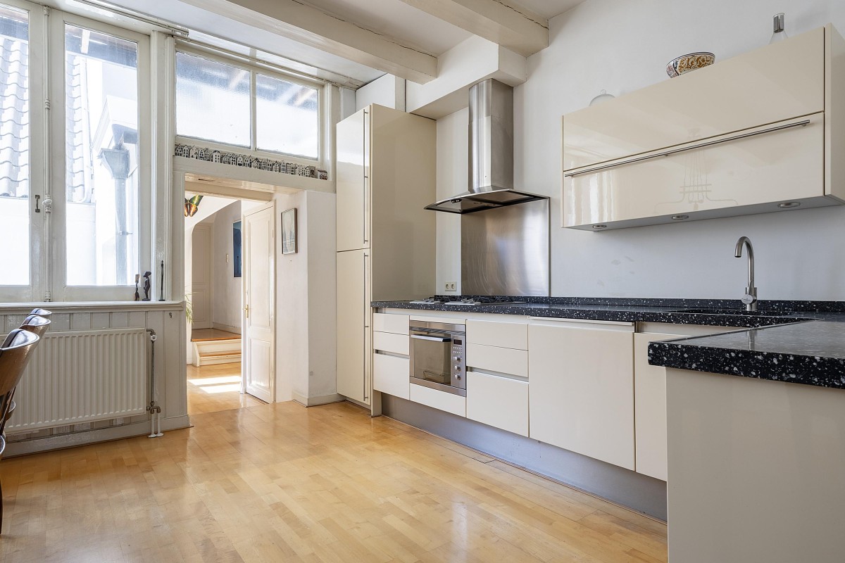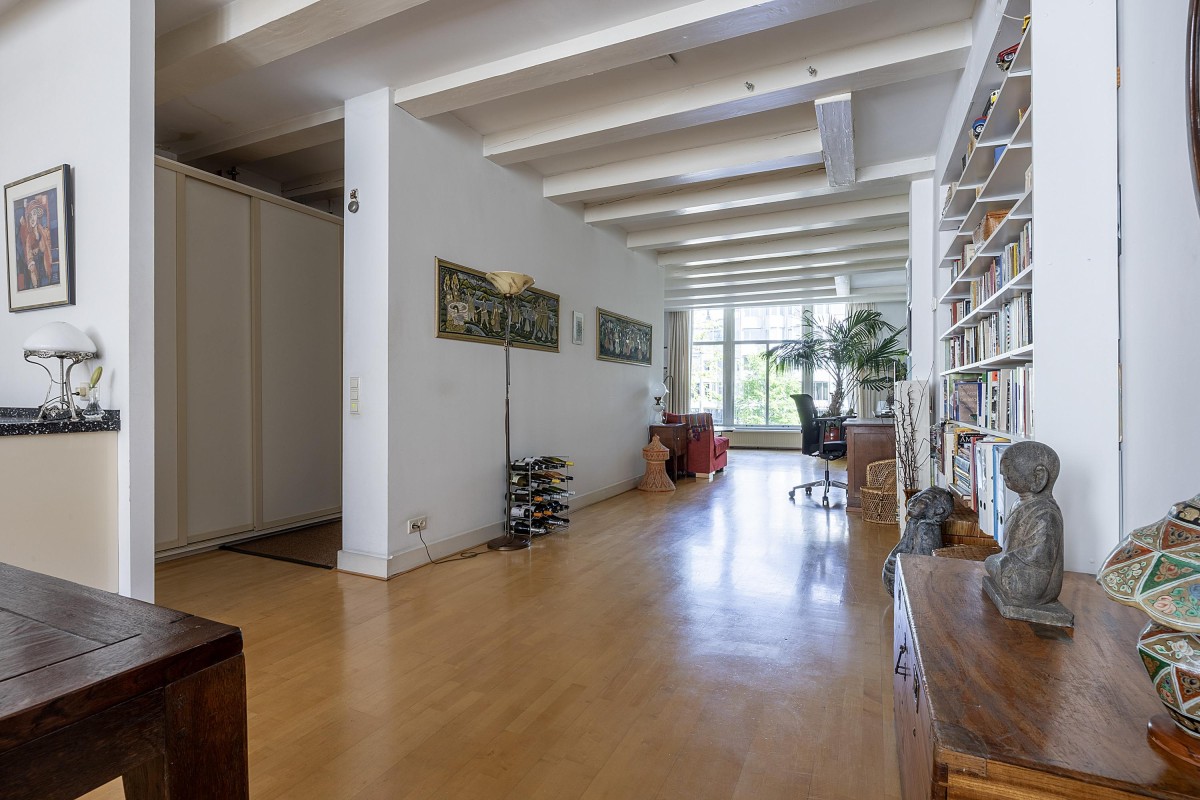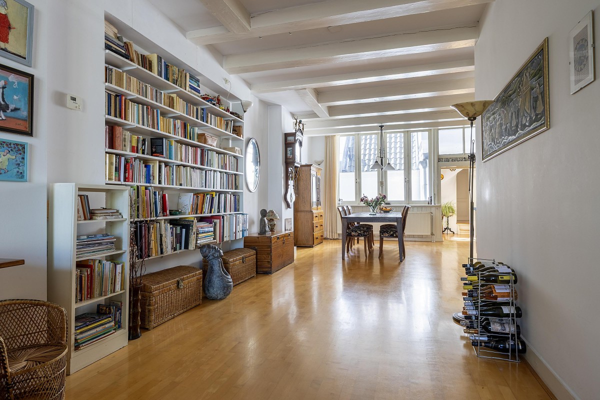 Through the communal staircase, you reach the entrance to the first floor. You step into an attractive and well-laid-out apartment, where the impressively spacious and bright living room at the front immediately catches your eye. Large windows offer a beautiful view of the canal and, together with the high ceilings, create an abundance of light and a pleasant, open atmosphere. At the center of the apartment is the open kitchen, equipped with a gas hob, dishwasher, refrigerator, freezer, and combi oven (Siematic and Bosch). Next to the kitchen, you’ll find a separate toilet with hand basin. At the quiet rear (back house) of the apartment is a generous bedroom, which offers direct access to a west-facing balcony — a wonderful place to relax in the afternoon and evening sun. The adjacent bathroom is equipped with a double sink, a spacious bathtub/shower, and connections for a washer and dryer. From the hall, a fixed staircase leads to the spacious landing on the second (and top) floor of the rear house.