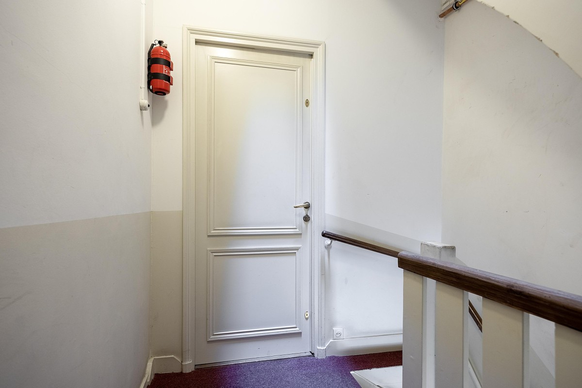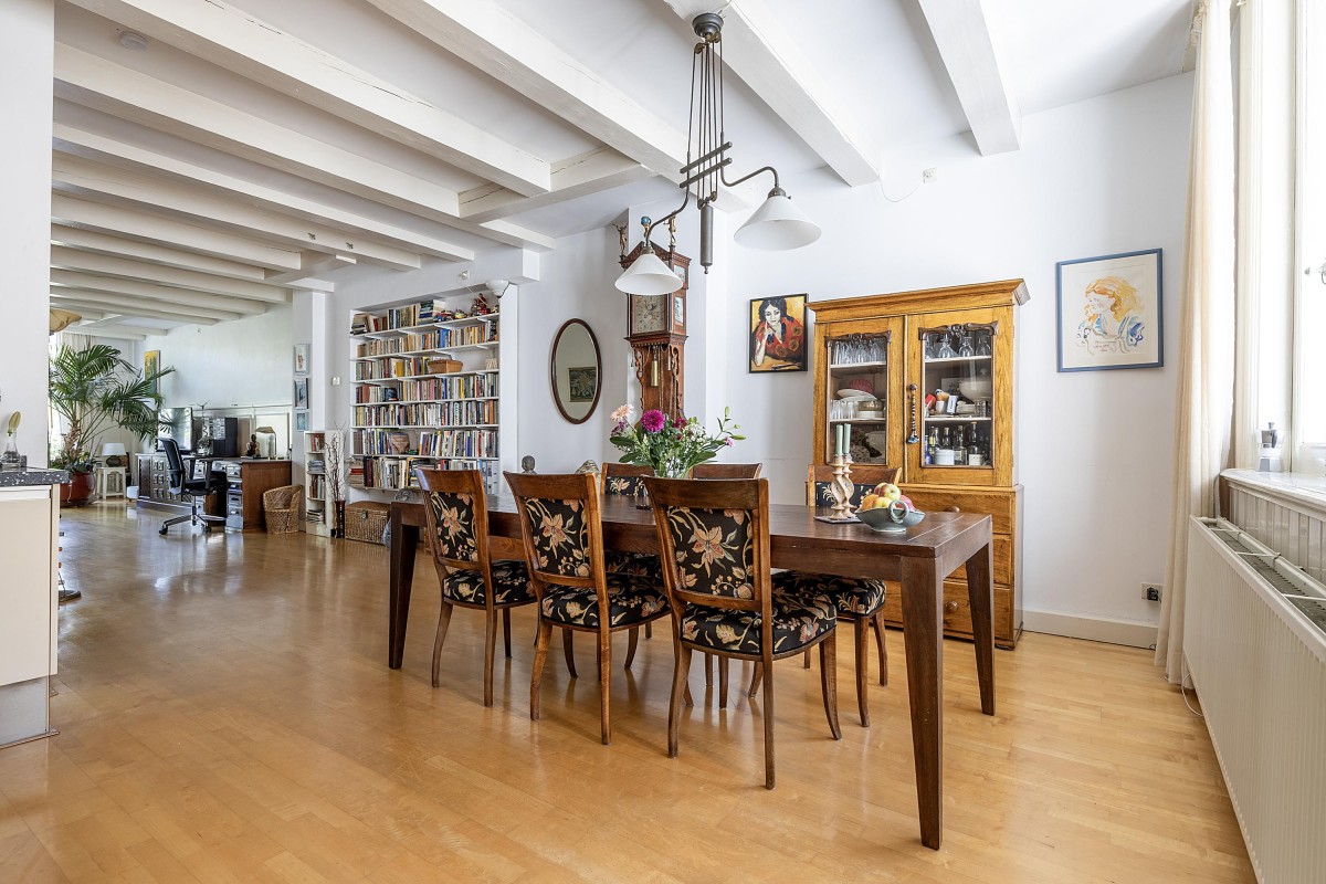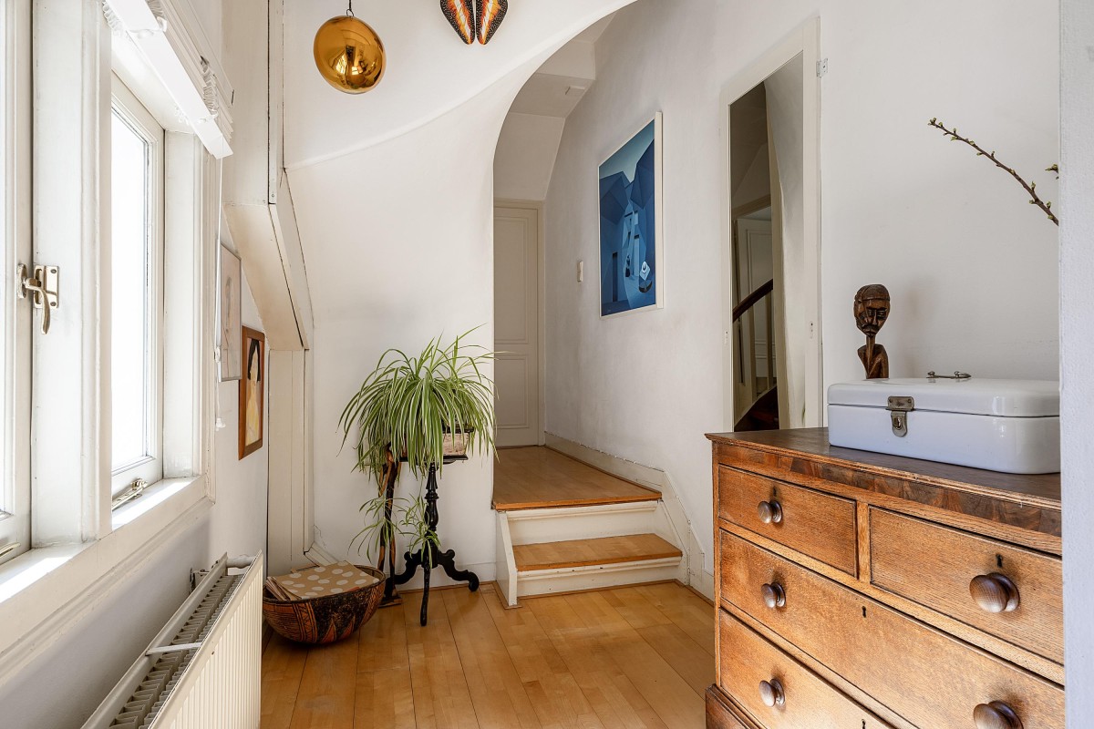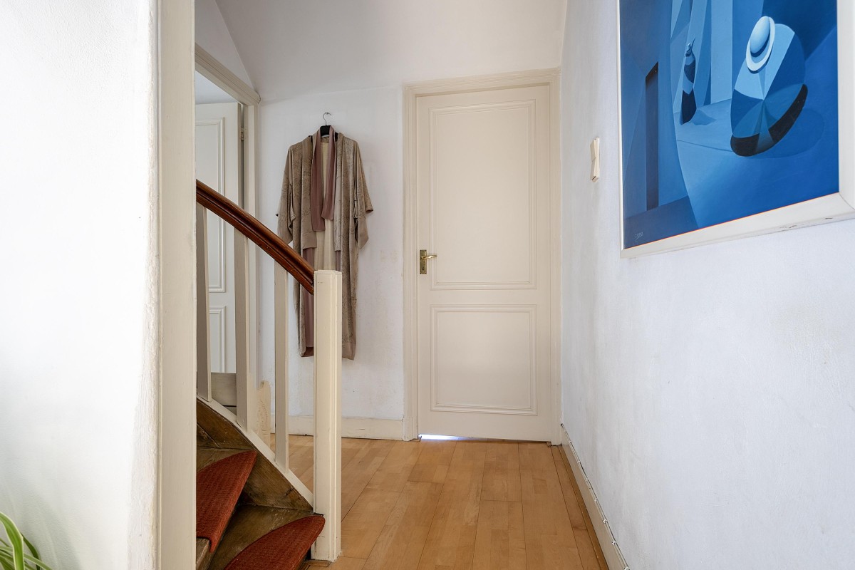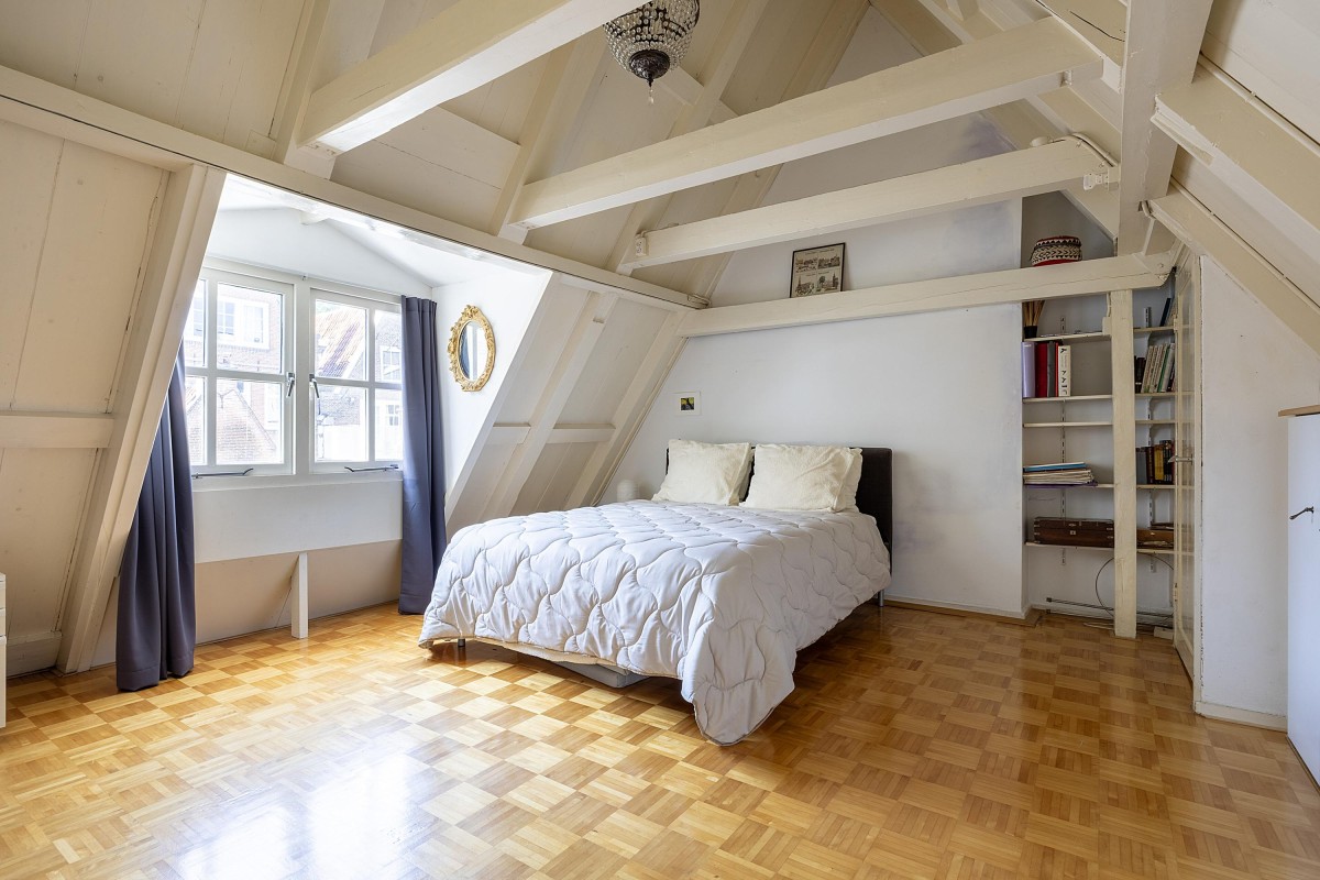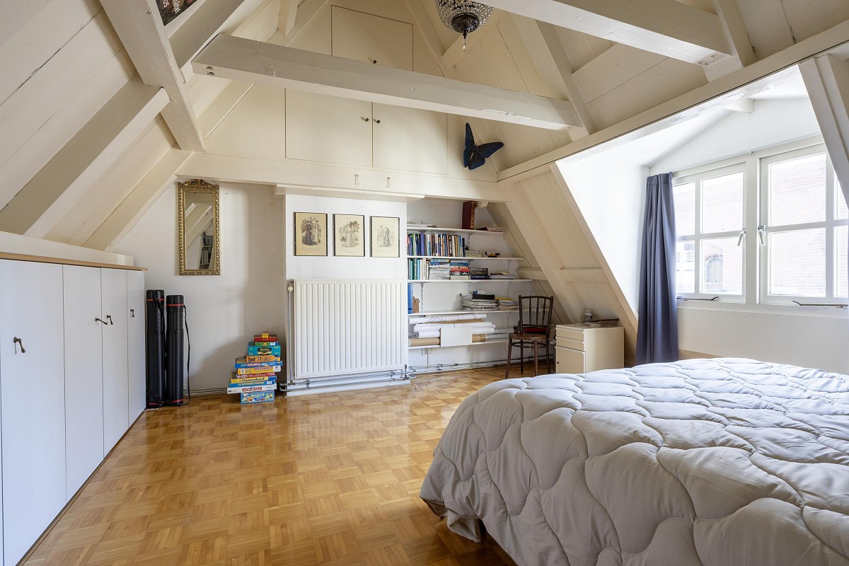 Via the internal staircase, you reach the landing of the second and top floor of the rear house. Here you’ll find a particularly spacious and cozy room, perfect to set up as a master bedroom, study, or comfortable guest room. The playful roofline combined with the dormer gives the space a distinctive character and pleasant light. Along the walls, there is ample built-in closet space — ideal for clothes, storage, or other essentials. This space combines charm and functionality in a way rarely found.