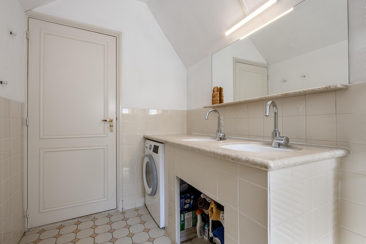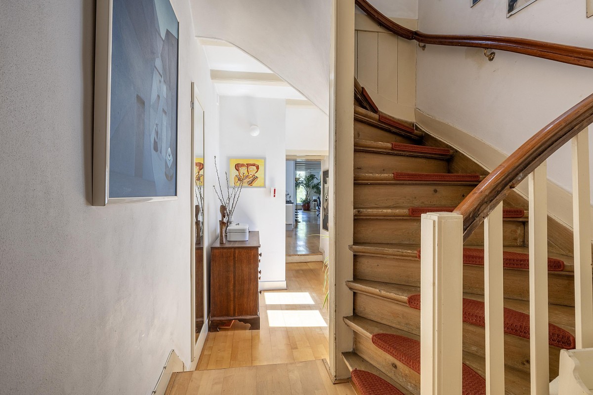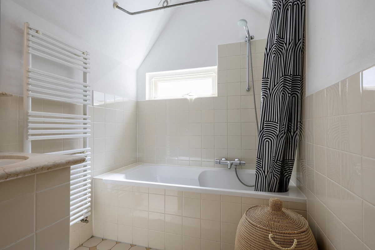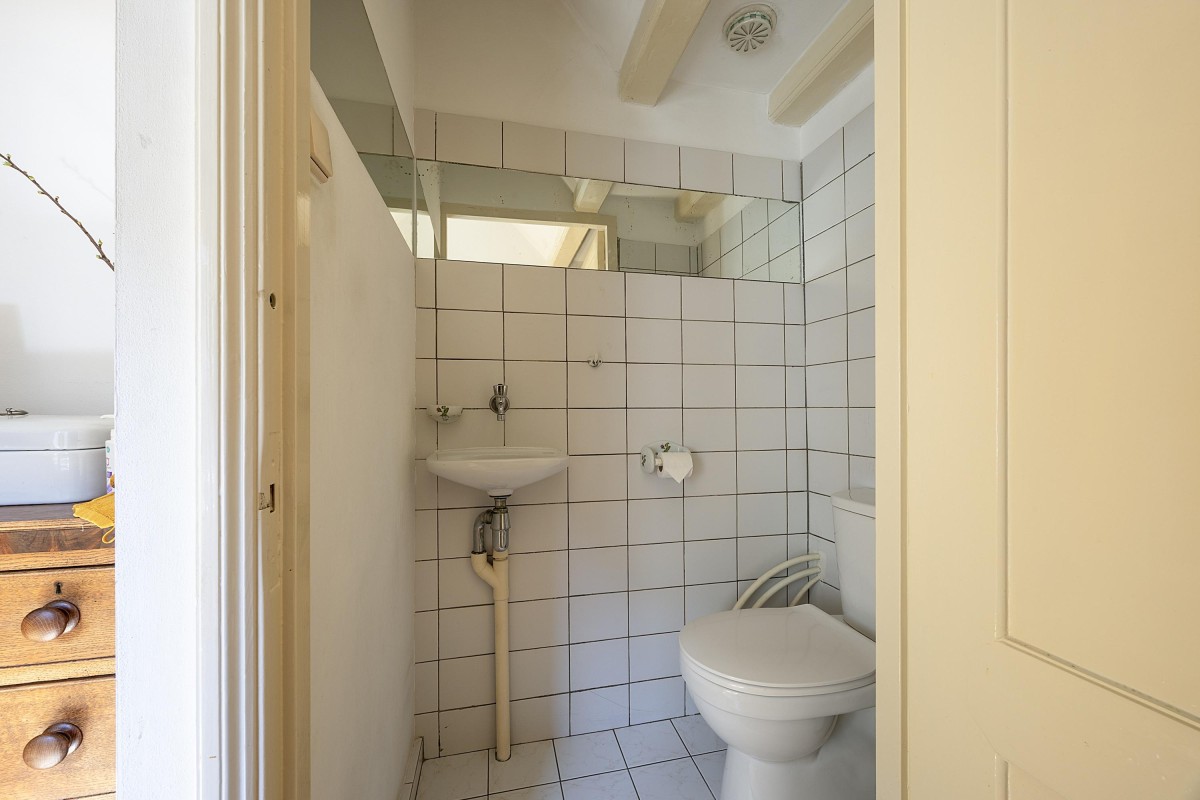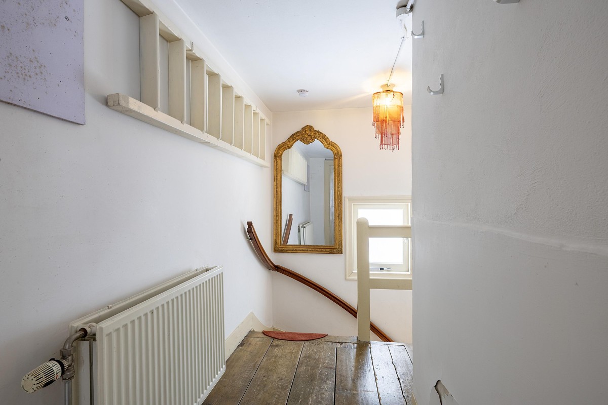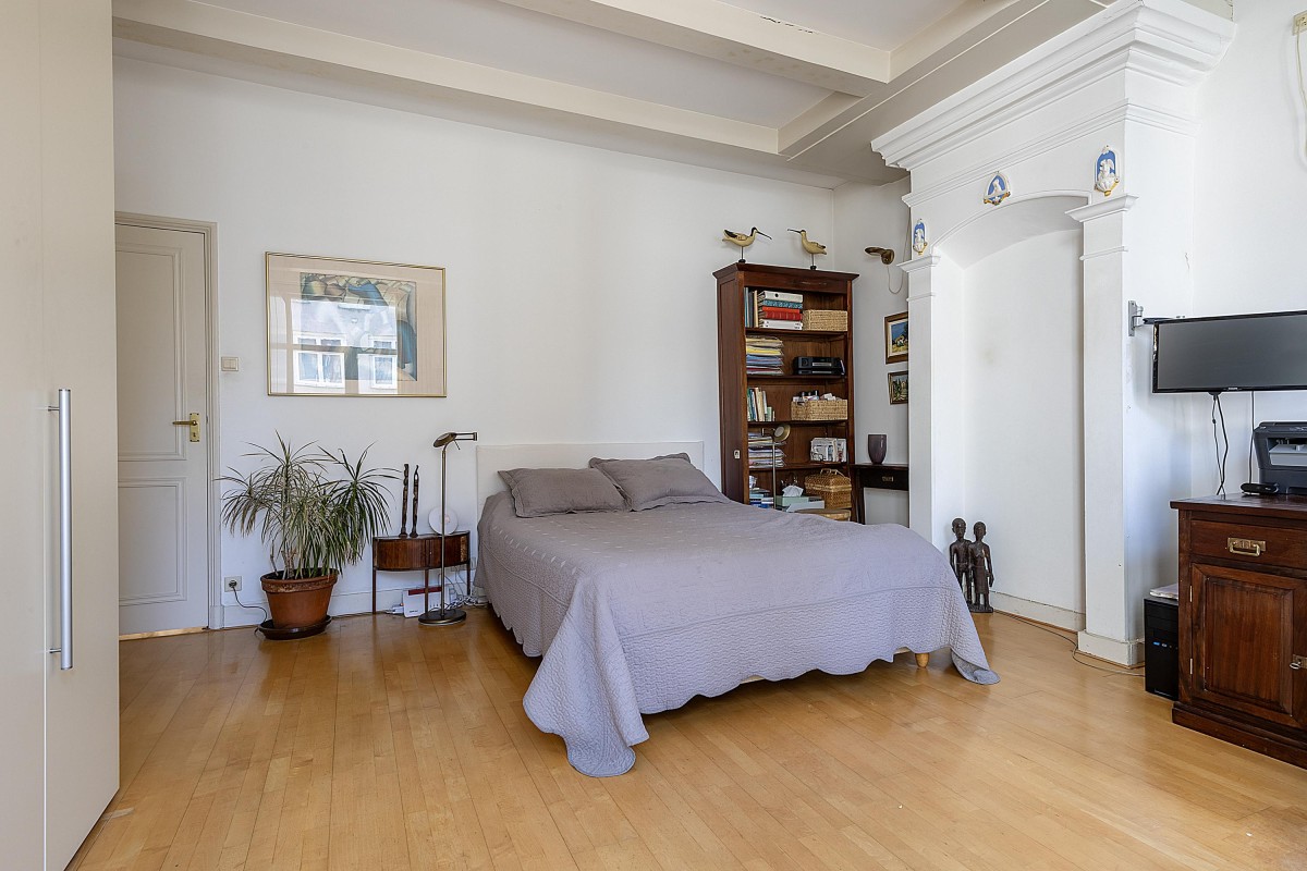 Via the internal staircase, you reach the landing of the second and top floor of the rear house. Here you’ll find a particularly spacious and cozy room, perfect to set up as a master bedroom, study, or comfortable guest room. The playful roofline combined with the dormer gives the space a distinctive character and pleasant light. Along the walls, there is ample built-in closet space — ideal for clothes, storage, or other essentials. This space combines charm and functionality in a way rarely found.