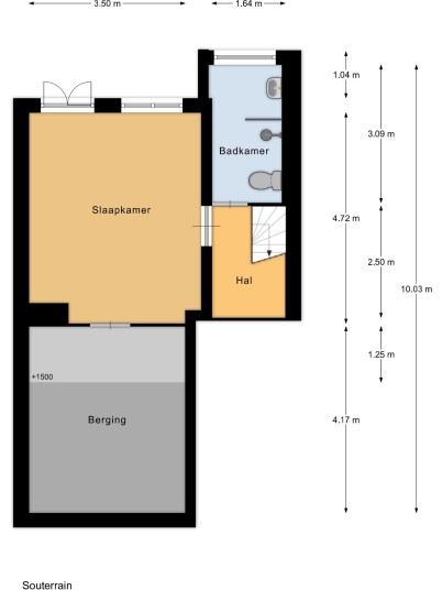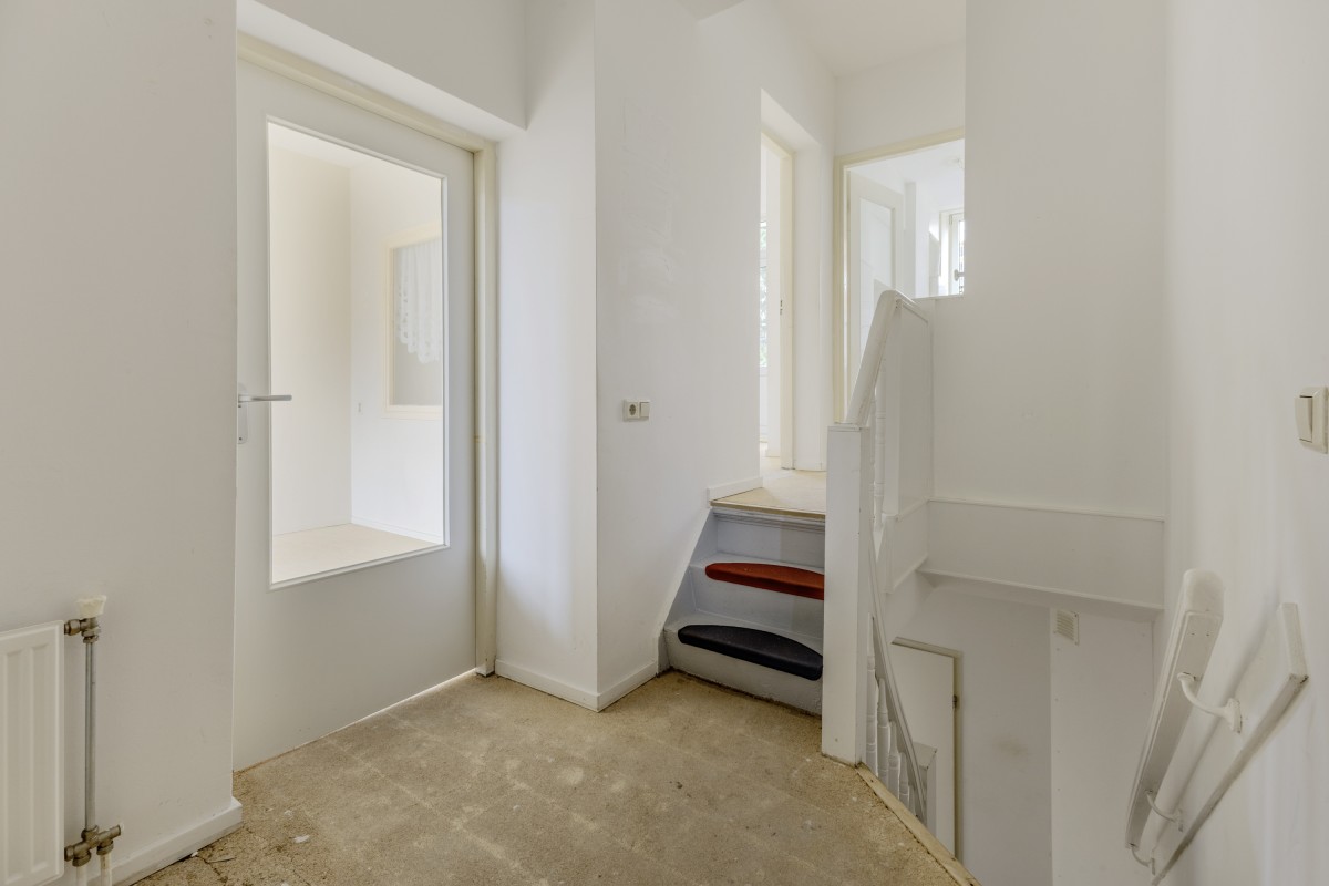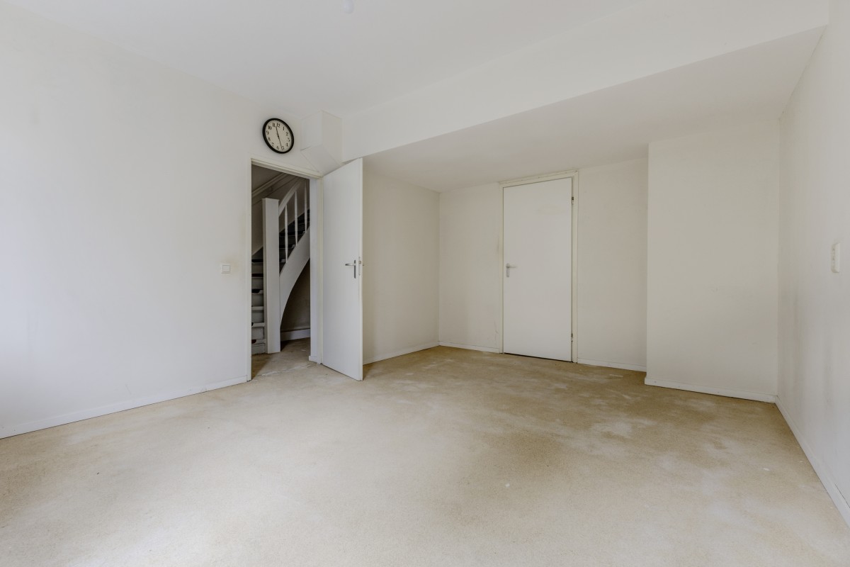 In the basement, the hall provides access to the second bedroom and the bathroom. Under the stairs there is practical storage space.