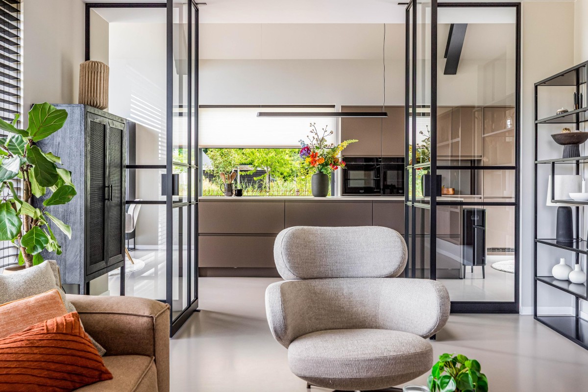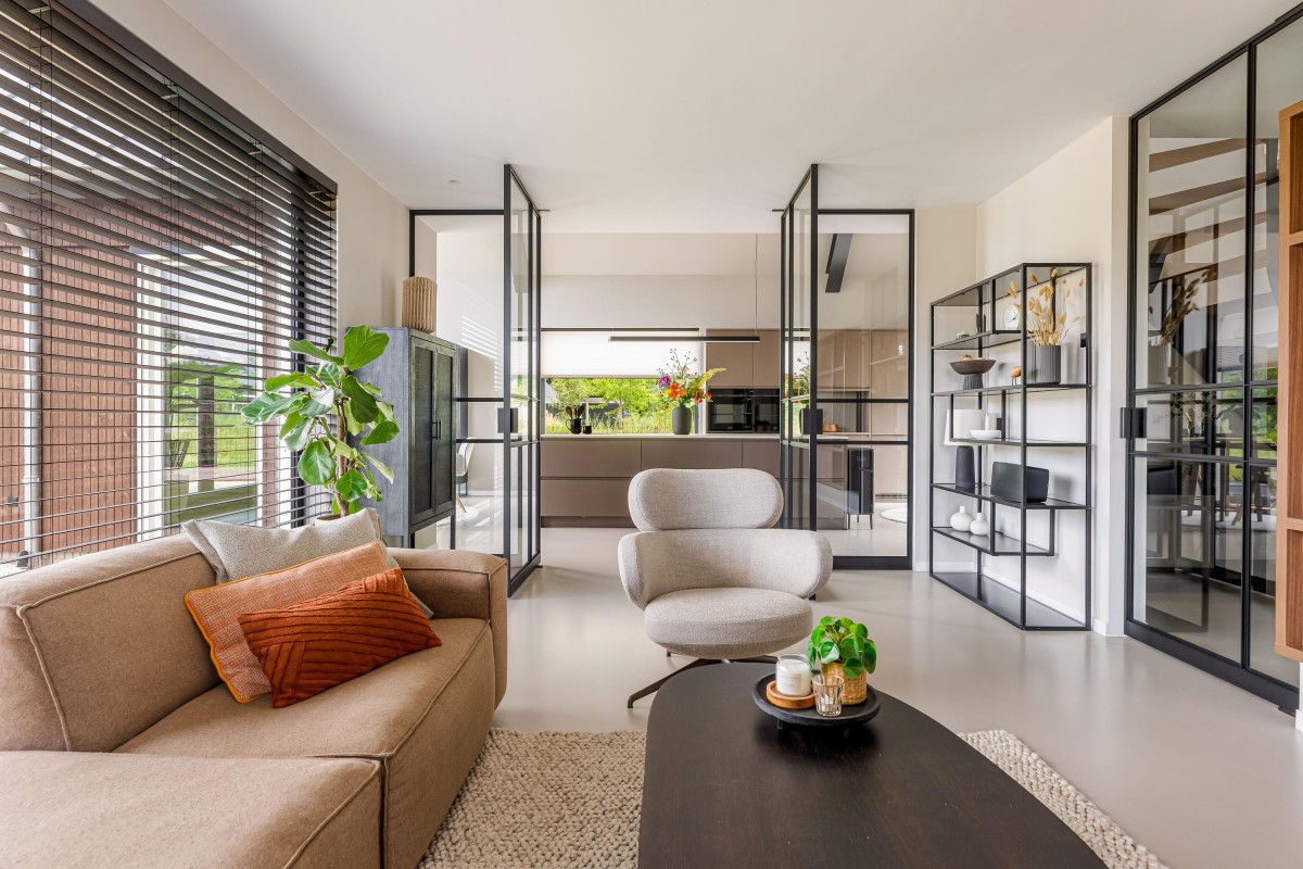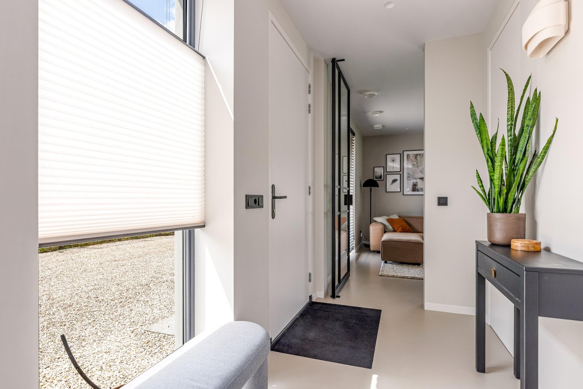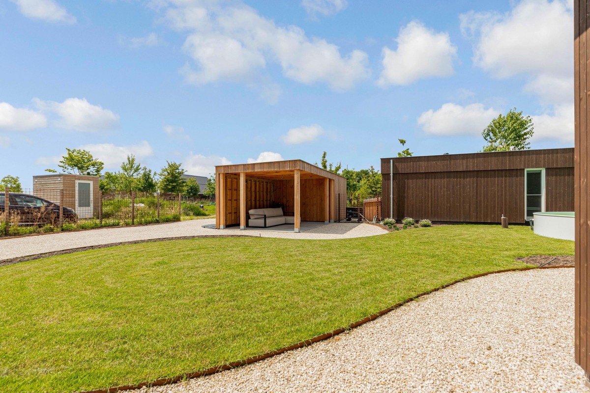 This house is an example of sustainable living, equipped with 22 solar panels and preparation for a charging station for electric vehicles. An air-water heat pump provides underfloor heating and floor cooling, making the house comfortable all year round. Outside you will find a canopy with extra storage and the Tiny house of approx. 22 m2, completely in the style of the house.