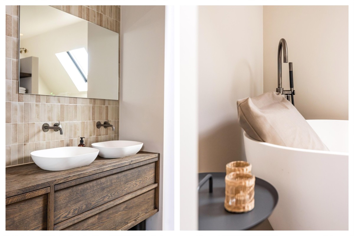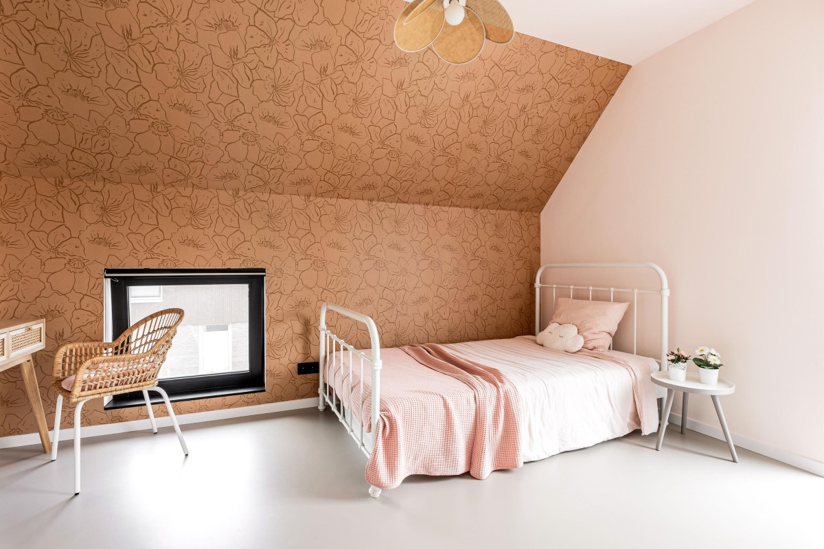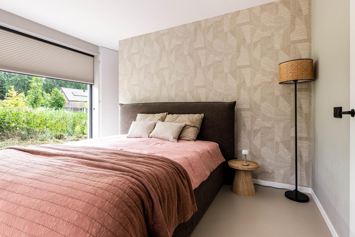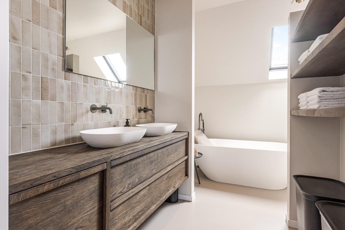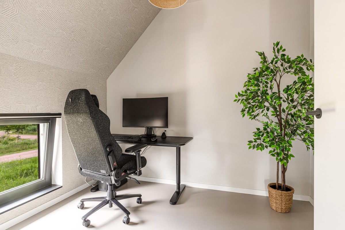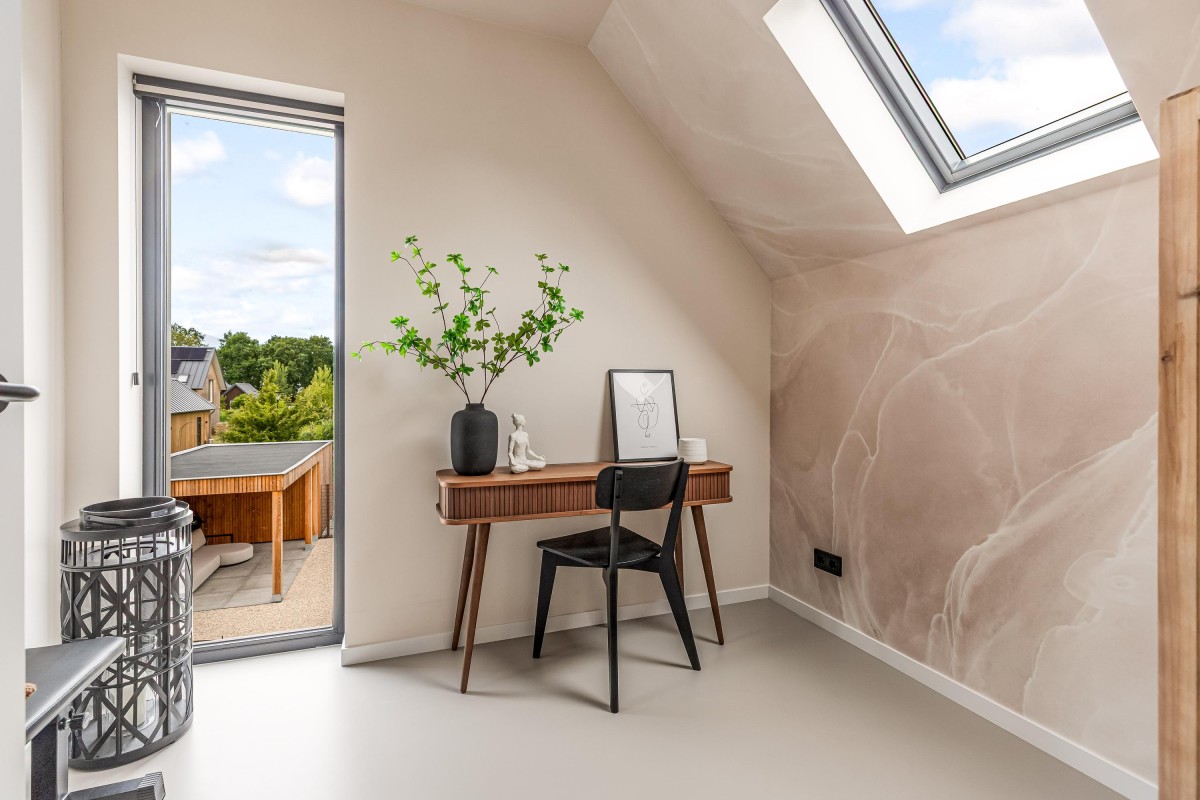 The beautiful steel staircase with oak wooden steps provides access to the first floor where there is a spacious landing that gives access to four tastefully finished bedrooms, a spacious bathroom, and a second toilet. The two large bedrooms are equipped with air conditioning and a custom-made wardrobe wall. Furthermore, all bedrooms have custom-made window coverings and insect screens. The bathroom is a luxurious space with a bath, two washbasins with furniture, and a walk-in shower. Via a loft ladder from one of the bedrooms, you reach the spacious storage loft and continuous throughout the entire house, ideal for extra storage. This floor also has a high-quality PU cast floor in combination with underfloor heating. All walls and ceilings are smoothly plastered, painted or provided with stylish wallpaper.
