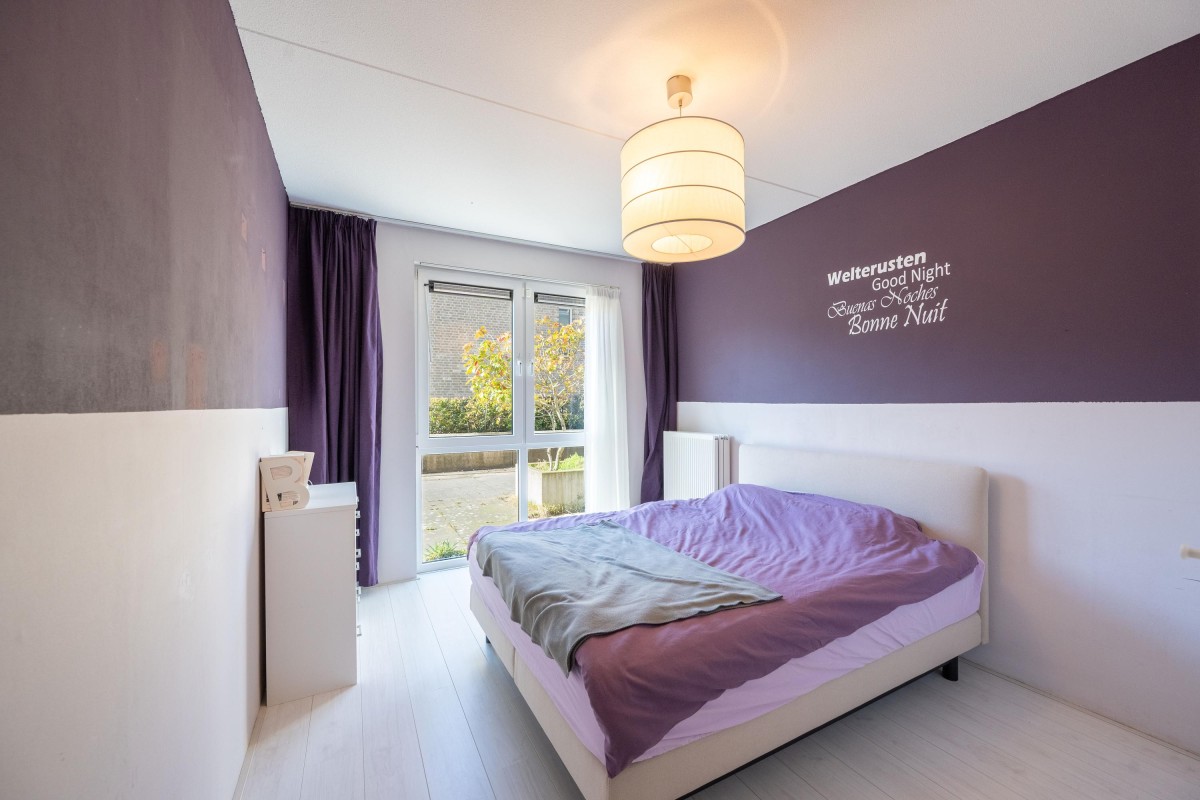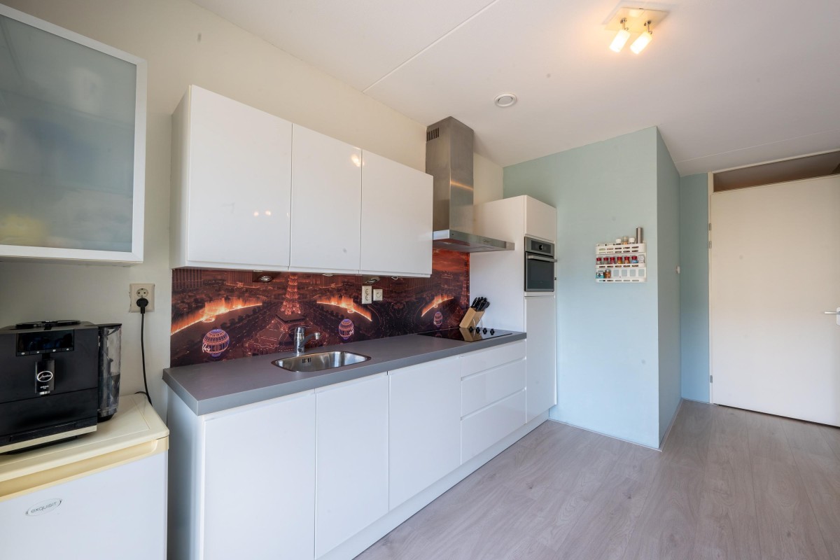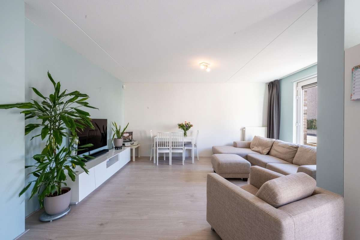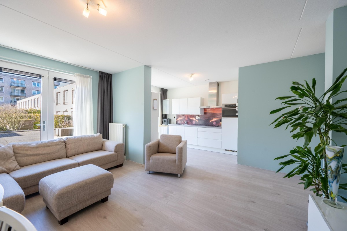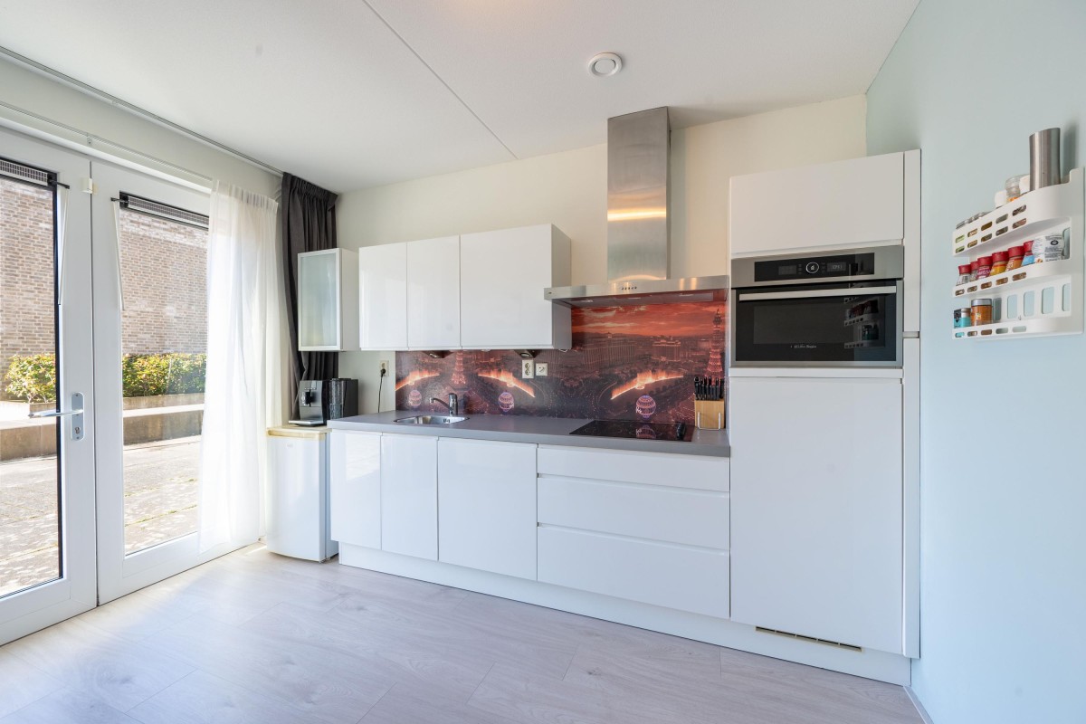 Lees verderAt the end of the hall, you will find the spacious and bright living room with an open Bruynzeel kitchen. The kitchen is fully equipped with various built-in appliances, including an induction cooktop, combi microwave, and a Bosch dishwasher.