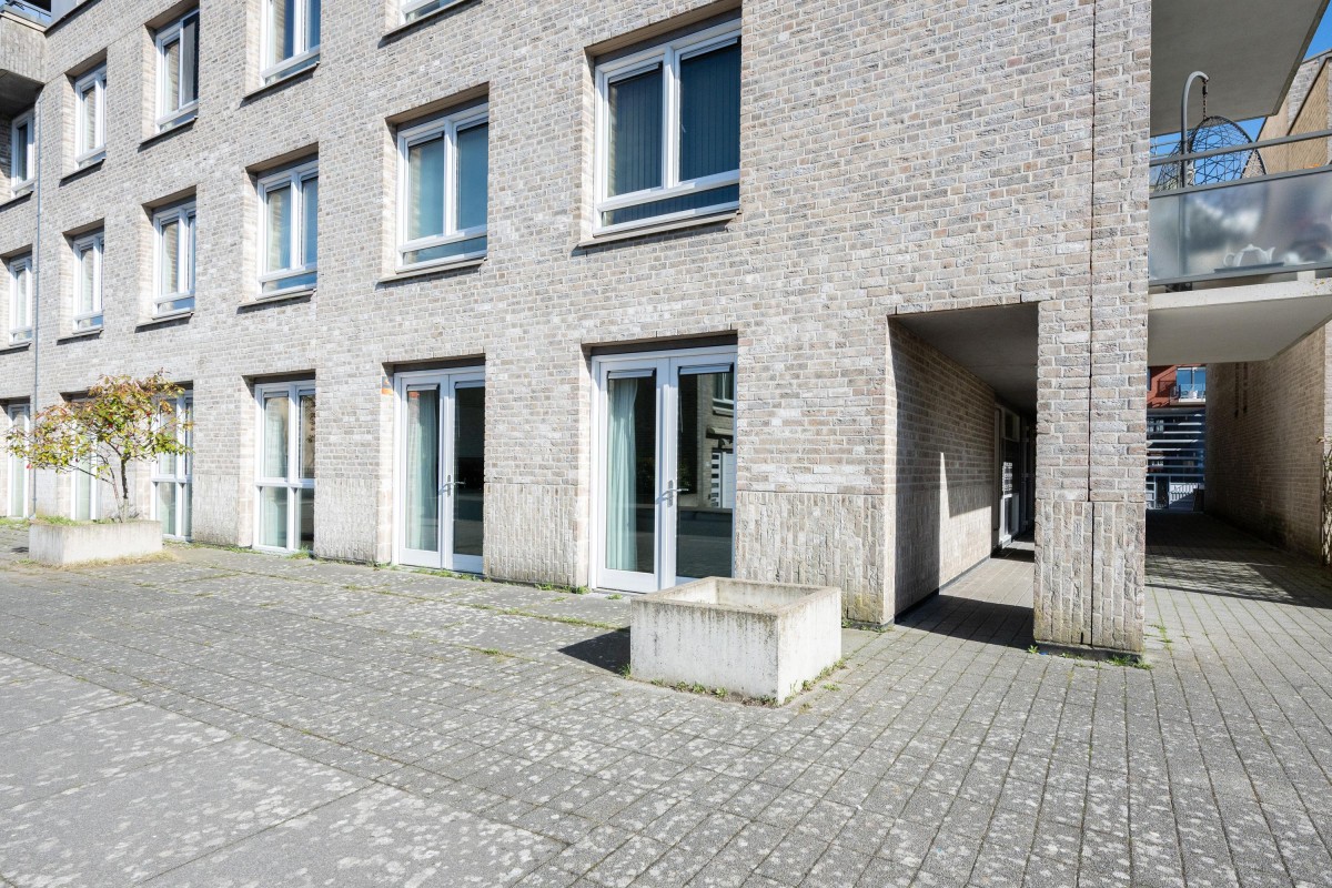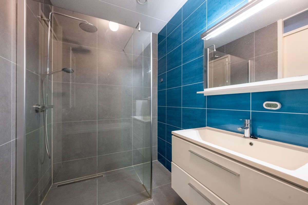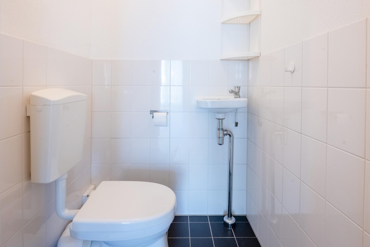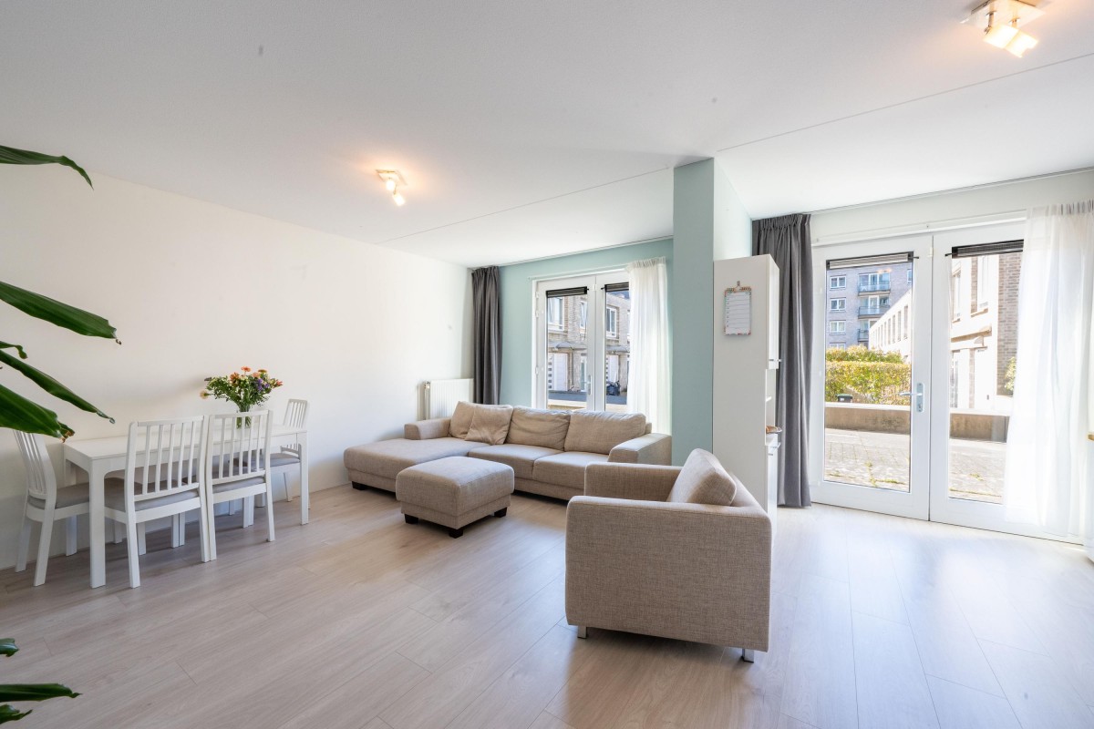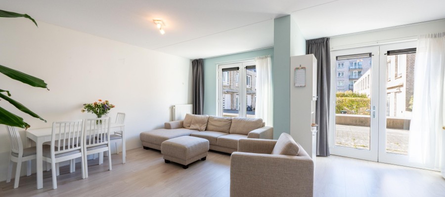 The apartment is located on the ground floor and, thanks to the French doors, is filled with natural light. Its southeast-facing orientation ensures you can fully enjoy the sun. The modern wood-look laminate flooring is in line with current interior trends and adds a warm and inviting atmosphere. The living room also offers plenty of space to arrange according to your own style and preferences.