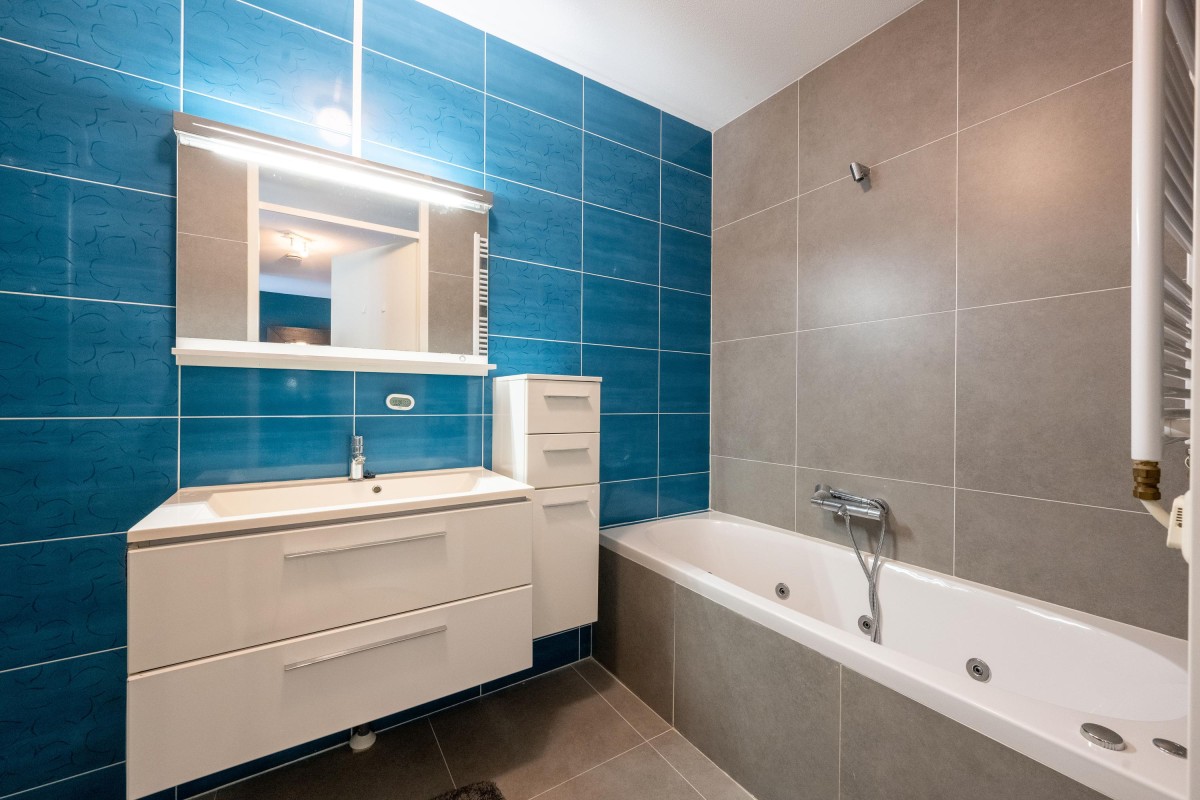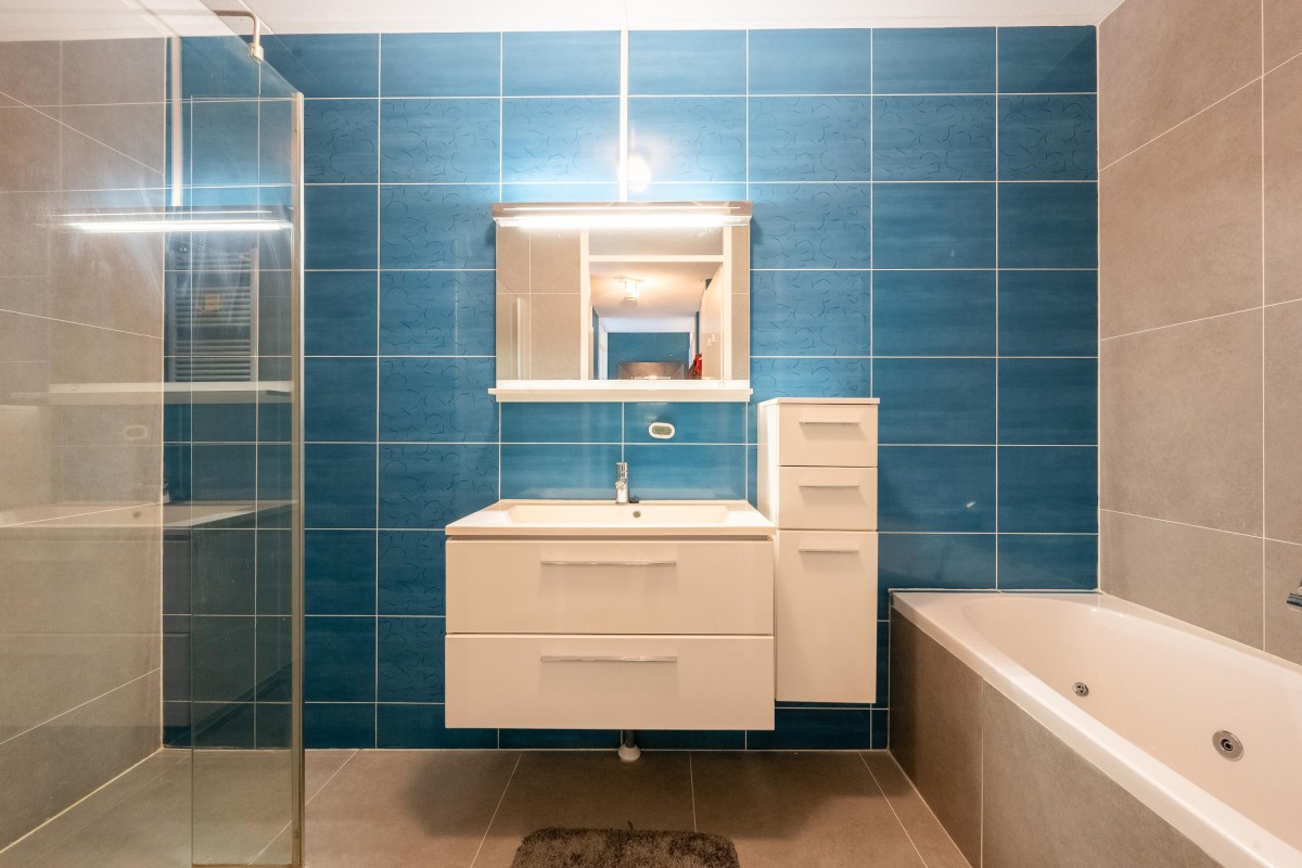 The apartment additionally features a separate, neatly tiled toilet. The beautifully finished bathroom is equipped with a bathtub, a comfortable walk-in shower, and a vanity with sink.
