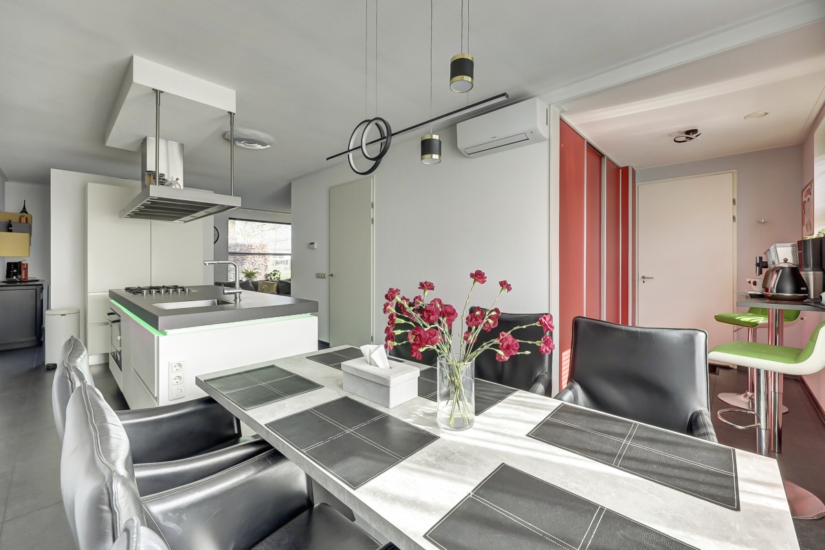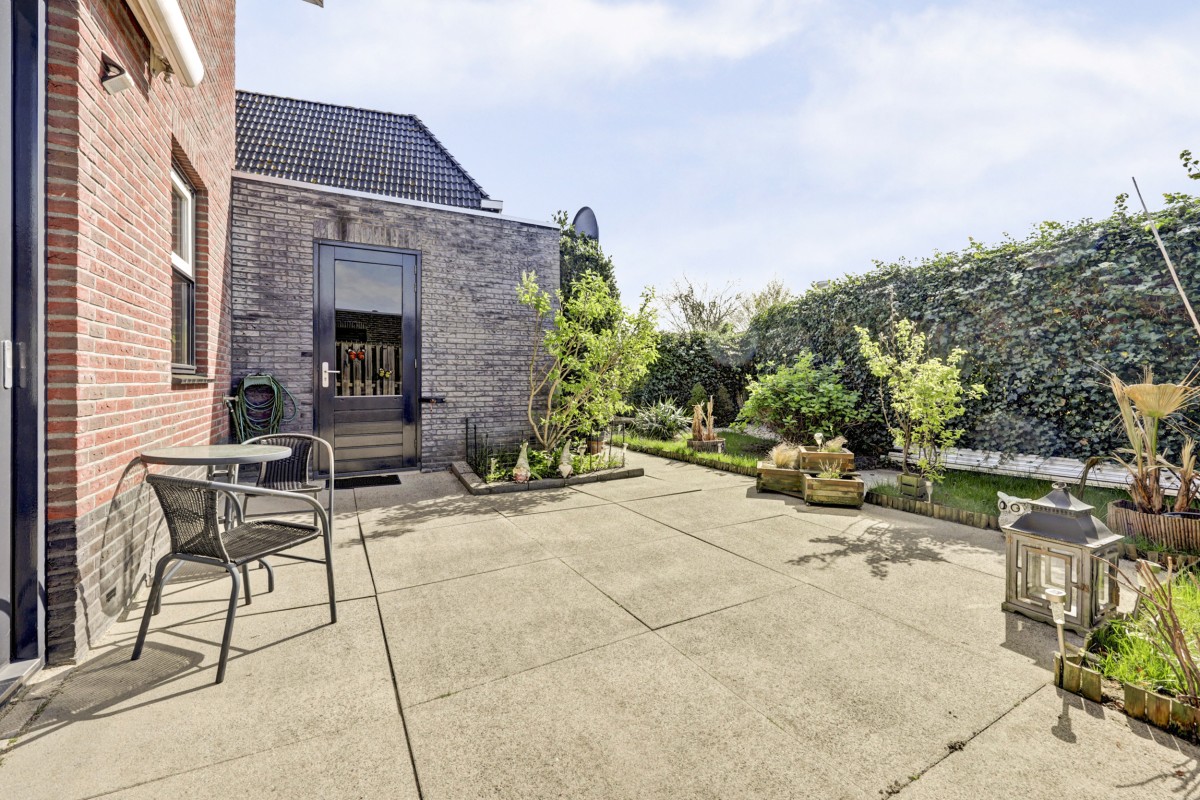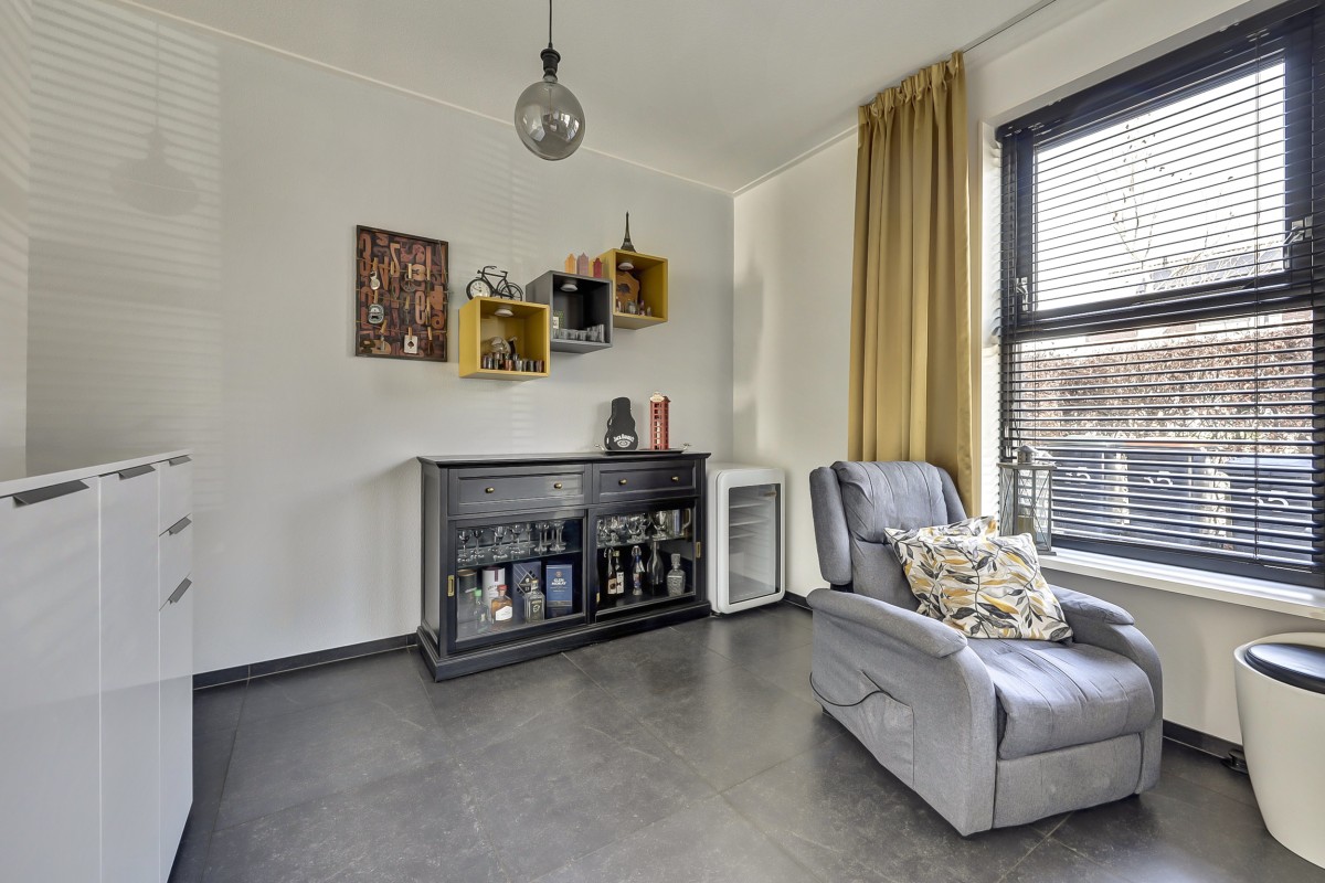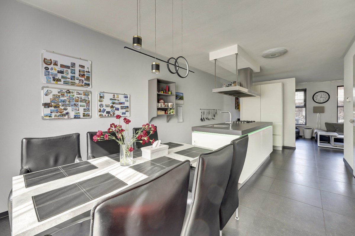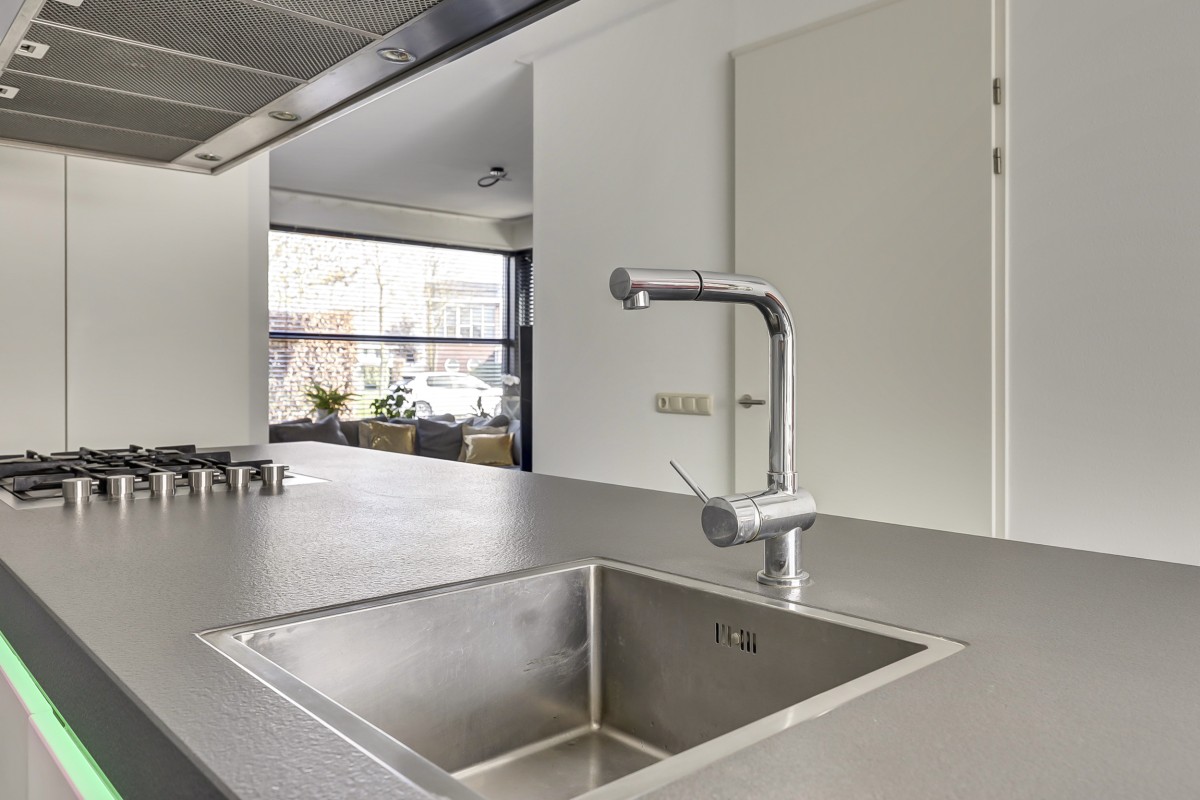Lees verderCozy eat-in kitchen with luxury fitted kitchen equipped with built-in refrigerator, oven, dishwasher, spacious 5-burner gas hob, and stainless steel extractor hood. Around the corner, a charming coffee bar has been created, along with a built-in wardrobe with sliding doors offering ample storage space. This is also where the central heating boiler (Intergas HR) is located. The attached garage is accessible from the kitchen via an internal door. The spacious garage features a concrete floor with a new coating (2026), a utility sink with hot and cold water connections, a pedestrian door to the garden, and an electrically operated sectional door. The ground floor features a beautiful stone floor with underfloor heating and a low-maintenance wall finish. The beautifully landscaped south-facing garden can be accessed from the kitchen via sliding doors. The garden offers a terrace with an awning, various borders with perennial plants interspersed with grass and decorative gravel.